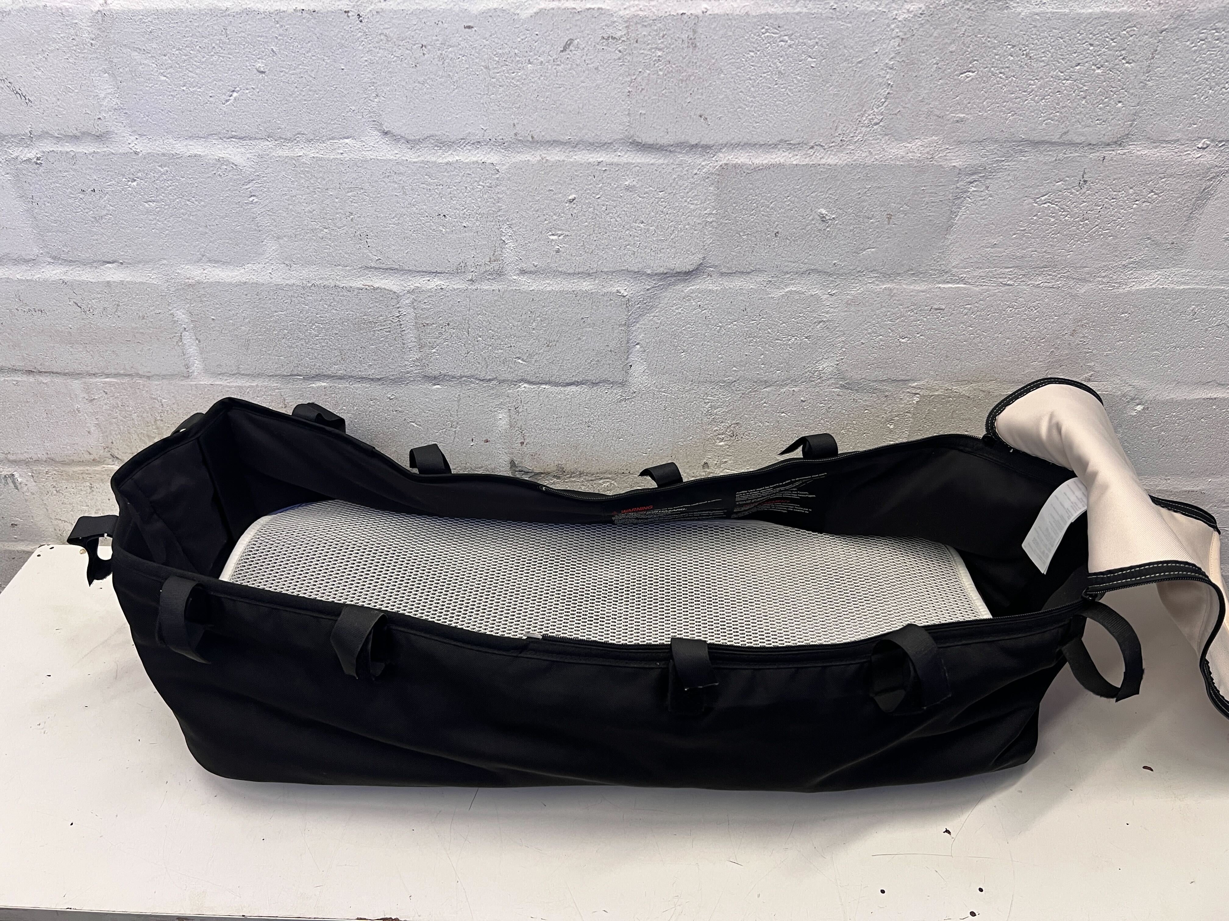 Offer your little one a cozy and secure space with this versatile Bugaboo-style baby bassinet/carrycot! ✨ Perfect for newborns, this carrycot provides a comfortable and safe environment for naps on the go or peaceful sleep at home. Its classic black exterior paired with a soft cream interior padding offers both style and comfort, making it a wonderful addition to your baby's essentials. Ideal for attaching to compatible stroller frames or for use as a portable bed.👶 Excellent pre-loved condition with minimal signs of use. The fabric is clean, and the structure is sound and sturdy, ready to welcome its next little occupant. All buckles and straps are intact and functional, ensuring safety and ease of use.