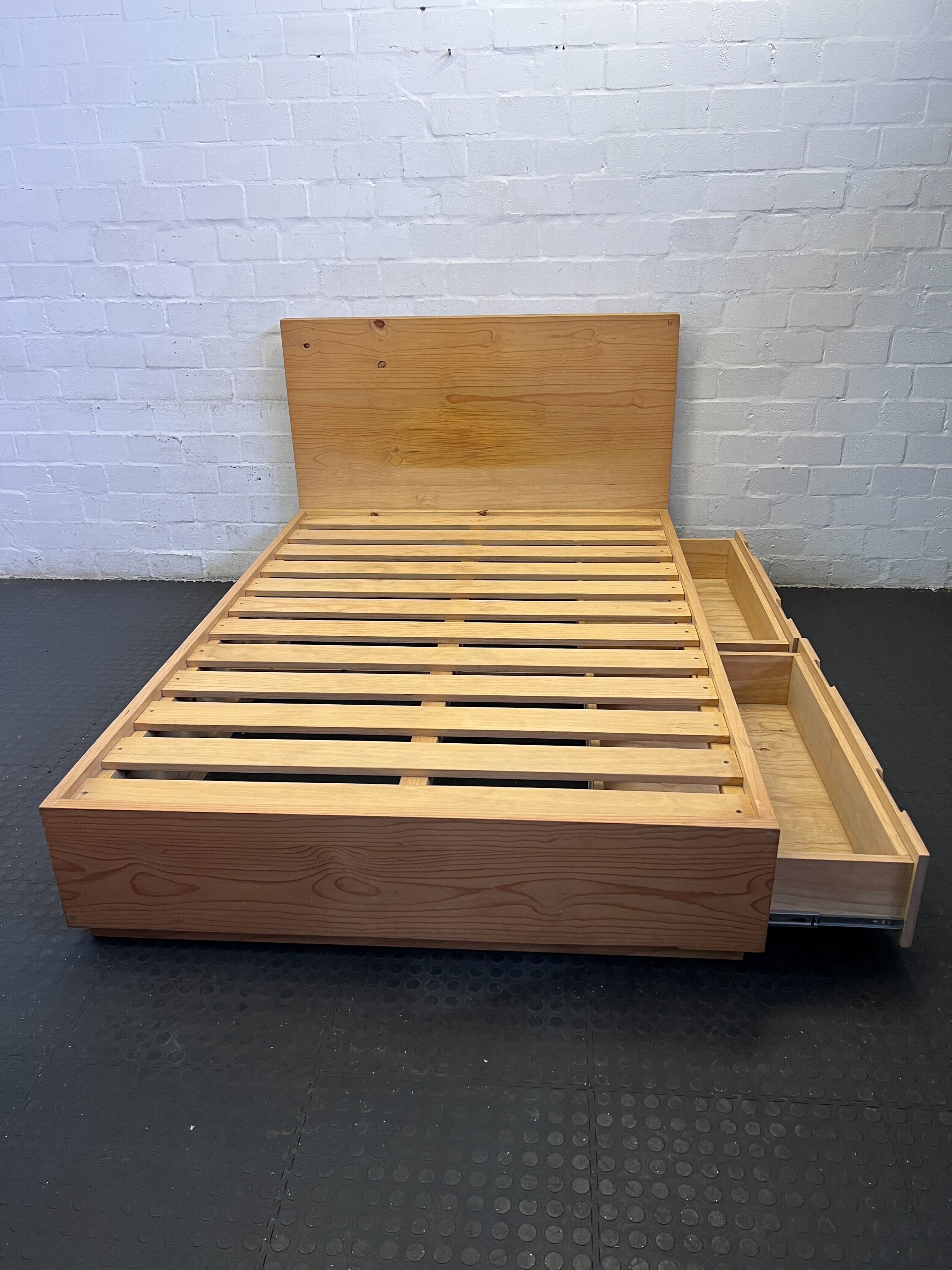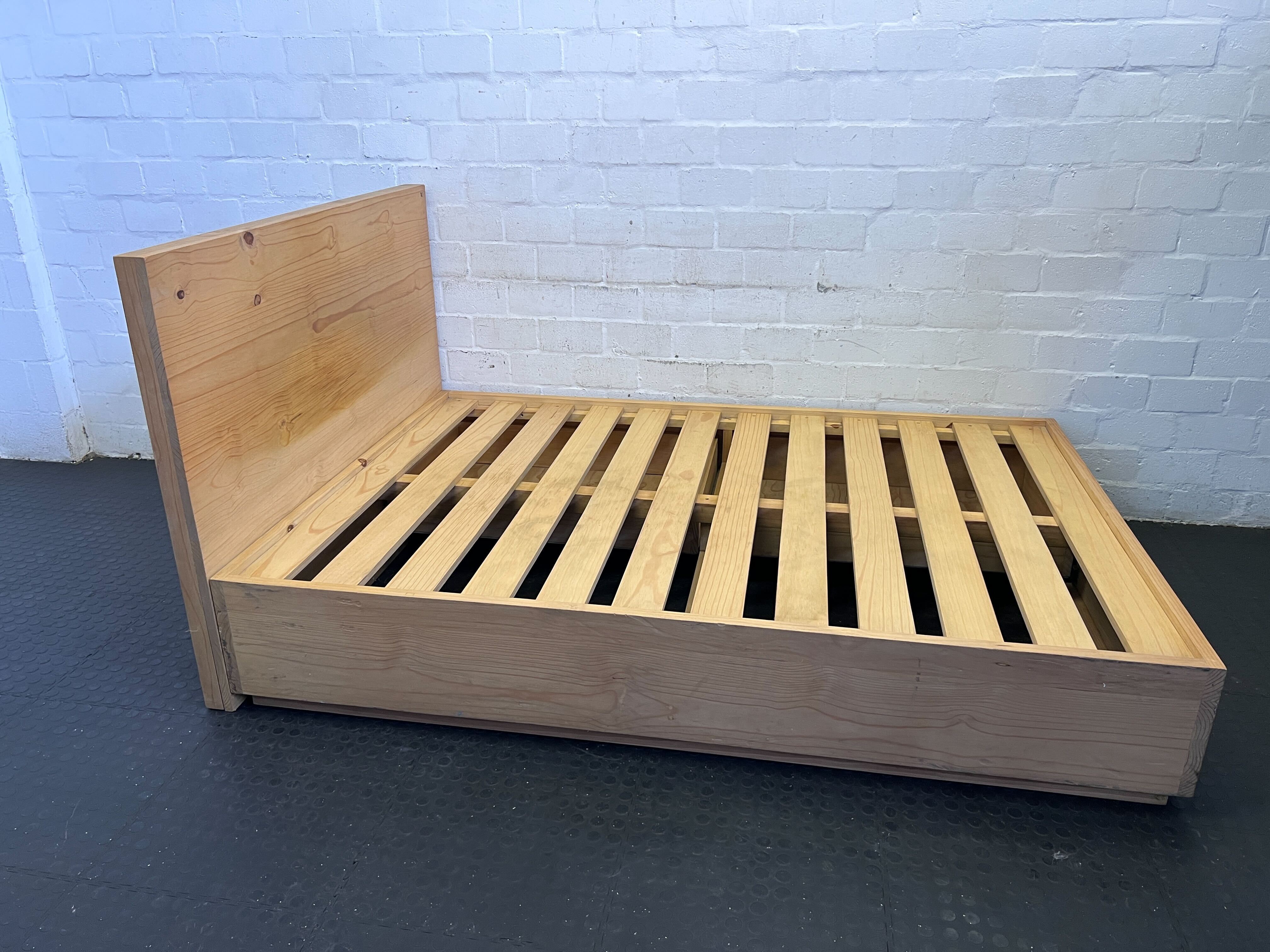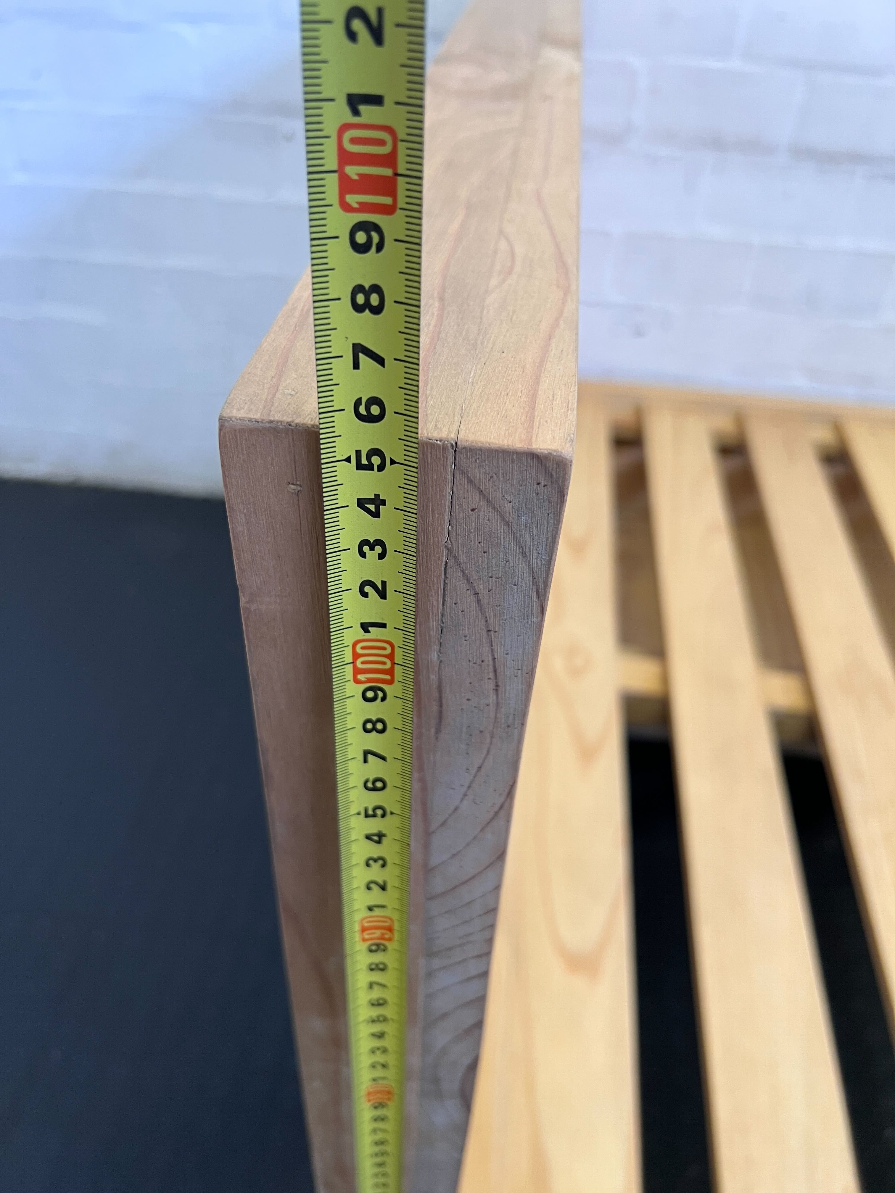 Elevate your bedroom with this beautiful and sturdy minimalist wooden double bed frame! ✨ Crafted from light-toned wood, its sleek design and clean lines bring a touch of natural elegance and warmth to any space. The integrated headboard and slatted base provide excellent support for your mattress, ensuring a comfortable night's sleep. Perfect for a contemporary, Scandinavian, or rustic aesthetic, this bed frame is both stylish and functional. 🛌 This bed frame is in good pre-loved condition. There might be minor signs of wear consistent with its age, such as slight scuffs or natural variations in the wood grain, which only add to its character. Overall, it's ready to be the centerpiece of your bedroom!