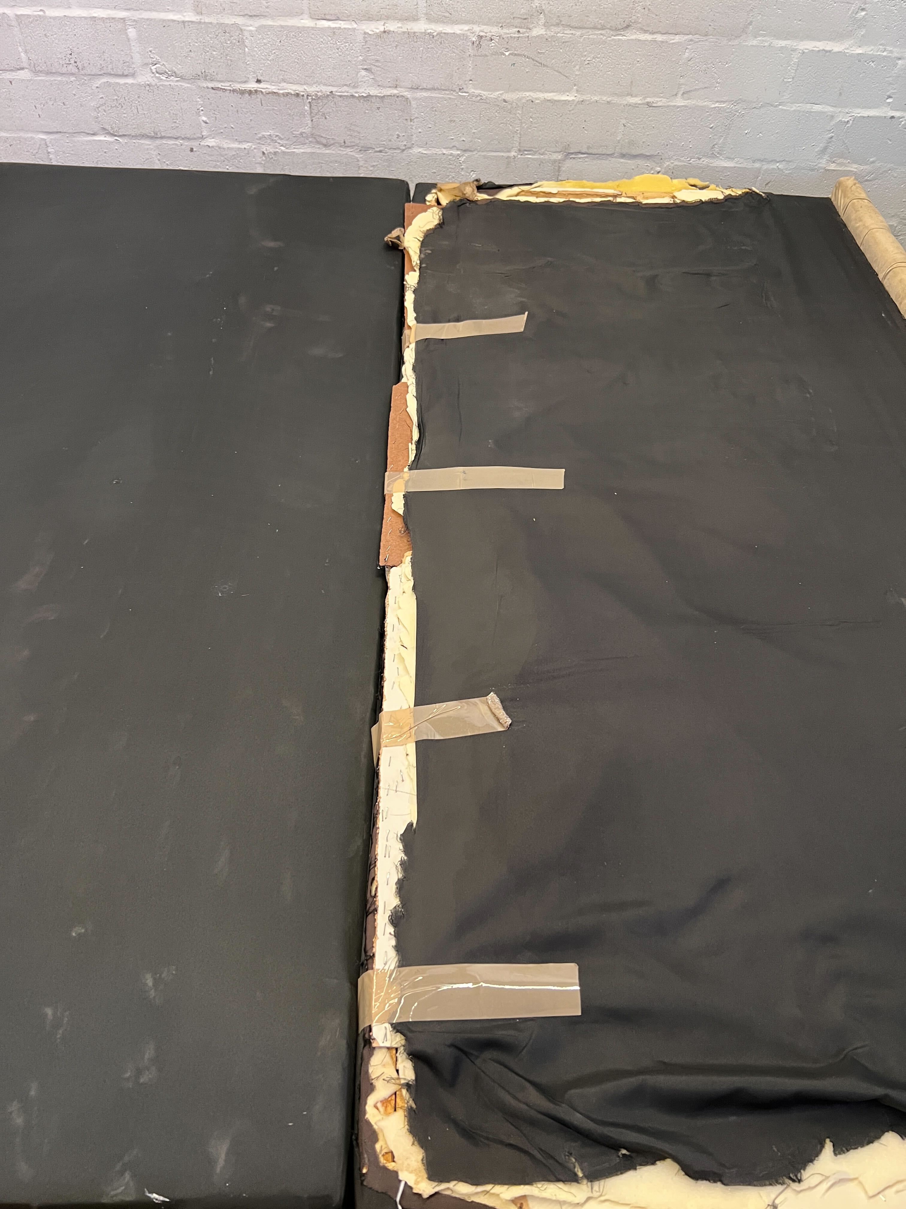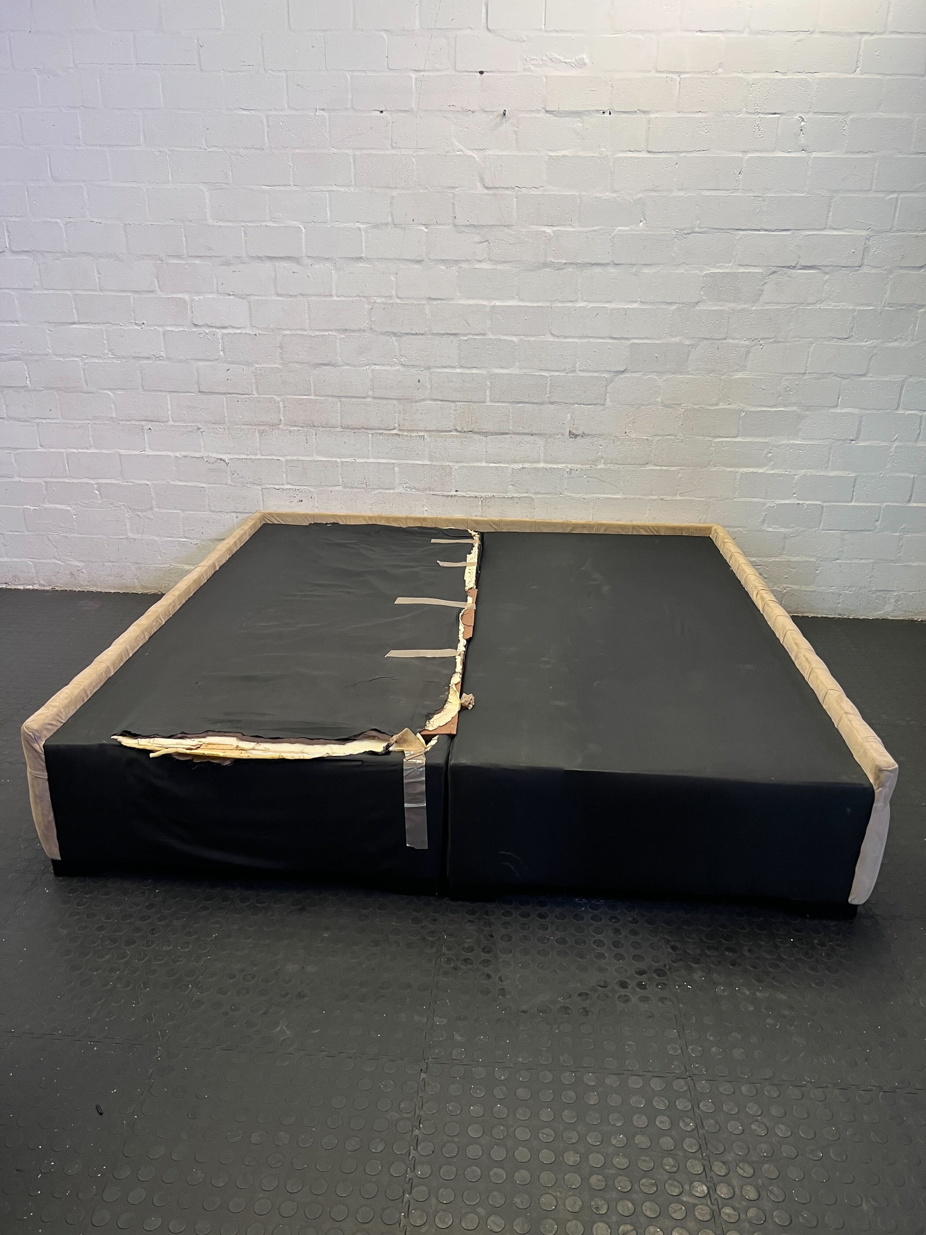 Elevate your bedroom's style with this elegant upholstered bed base, featuring beautiful deep button tufting that brings a touch of classic luxury to any space. ✨ Its sturdy construction provides a solid foundation for your mattress, making it a stylish and practical addition to your home. This sophisticated piece is perfect for creating a cozy and inviting bedroom retreat. 🛋️ This bed base is in used condition. The upholstered sides with button tufting are generally well-preserved. However, please note that the black fabric covering the top surface, where the mattress sits, shows significant tearing and peeling, particularly along the central seam and edges, exposing the padding beneath. This area would typically be covered by a mattress, but the aesthetic imperfection is visible.