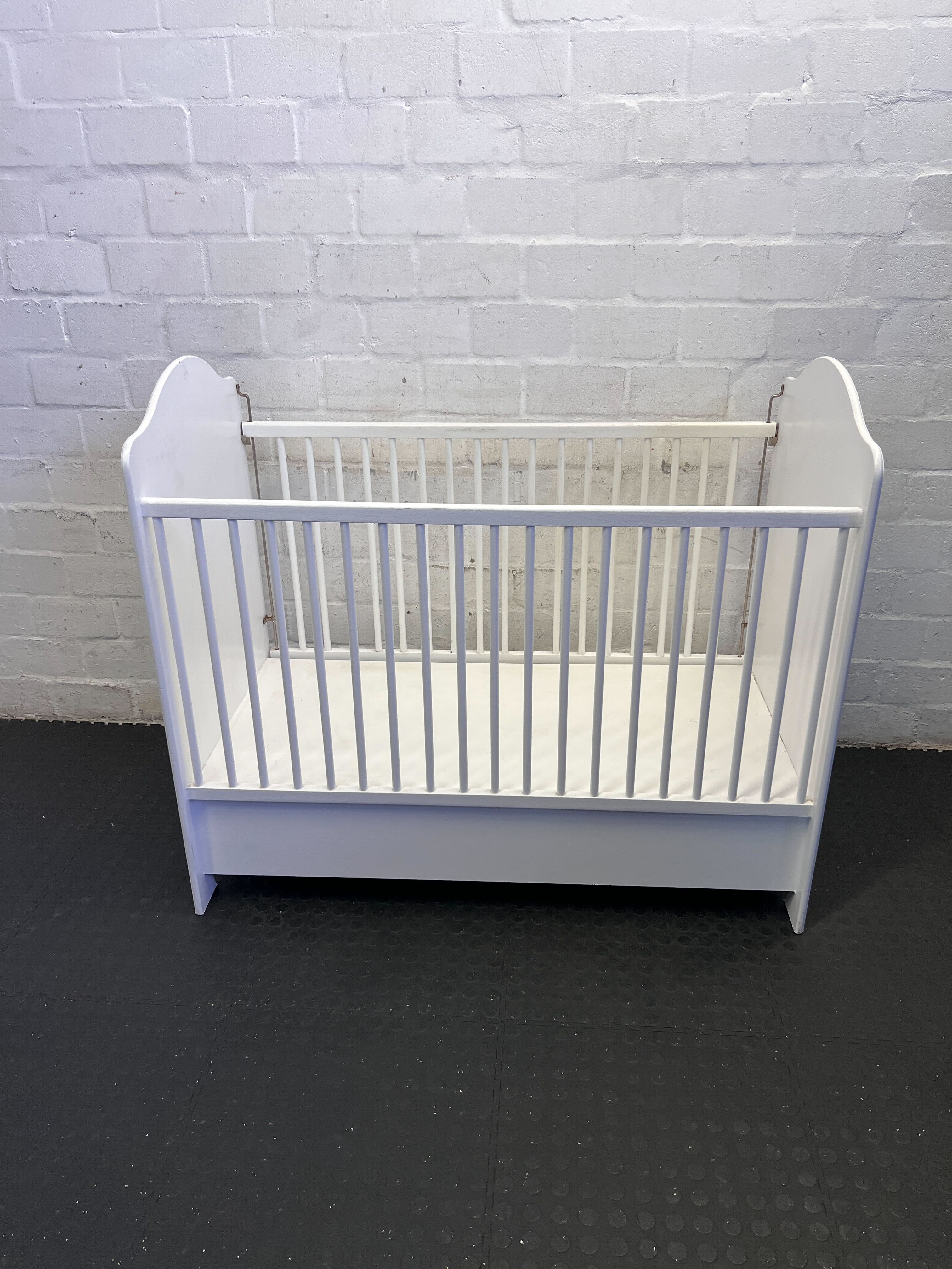 Welcome your little one to dreamland with this charming classic white baby crib! ✨ This timeless piece features sturdy slatted sides for optimal safety and visibility, ensuring your baby is always secure. Below the mattress, a convenient integrated storage drawer offers a clever solution for keeping blankets, diapers, or extra bedding neatly tucked away, maximizing space in your nursery. Its clean white finish effortlessly complements any decor, making it a versatile and essential addition to your home. This pre-loved baby crib is in good, functional condition with typical signs of gentle use. There may be minor cosmetic marks or scuffs consistent with a used item, but it remains sturdy and ready for its next little occupant. The under-crib drawer opens and closes smoothly. Please refer to the images for a detailed view of its current state.