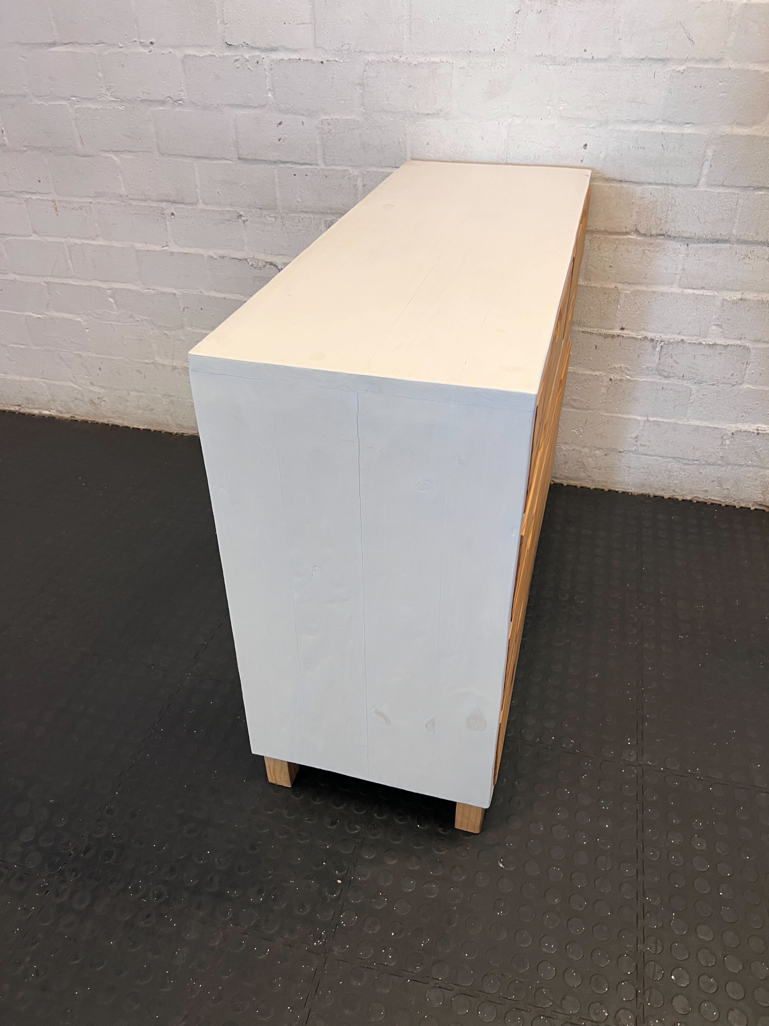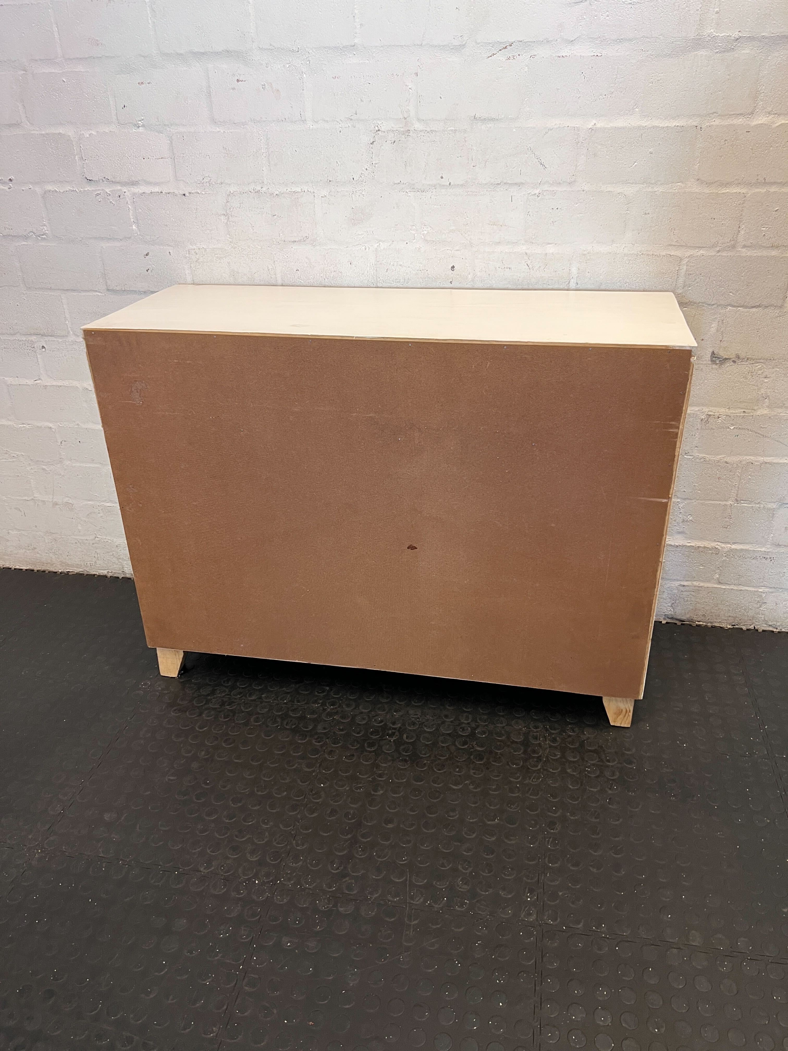 This charming chest of drawers blends modern aesthetics with rustic warmth, featuring a crisp white frame beautifully complemented by natural pine drawer fronts. Its versatile design makes it a perfect addition to any bedroom, living area, or even a spacious entryway, offering ample storage for clothes, linens, or everyday essentials. The clean lines and natural wood grain bring a touch of serene style to your home. ✨ This pre-loved chest of drawers is in good condition with minor signs of use consistent with its age. There are some small imperfections on the wood, including natural knots and light marks visible on the drawer fronts, which add to its rustic character. The white frame shows minimal wear. All drawers open and close smoothly.