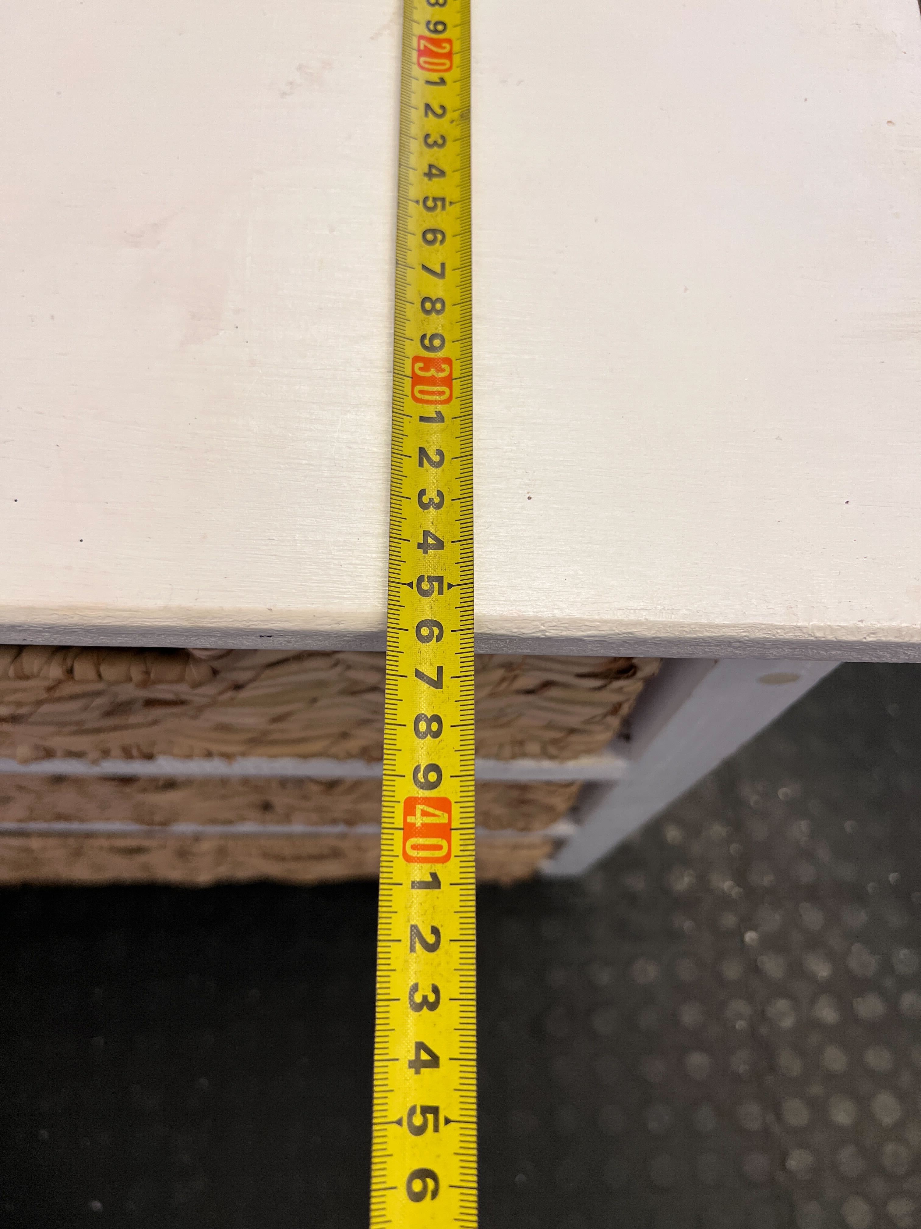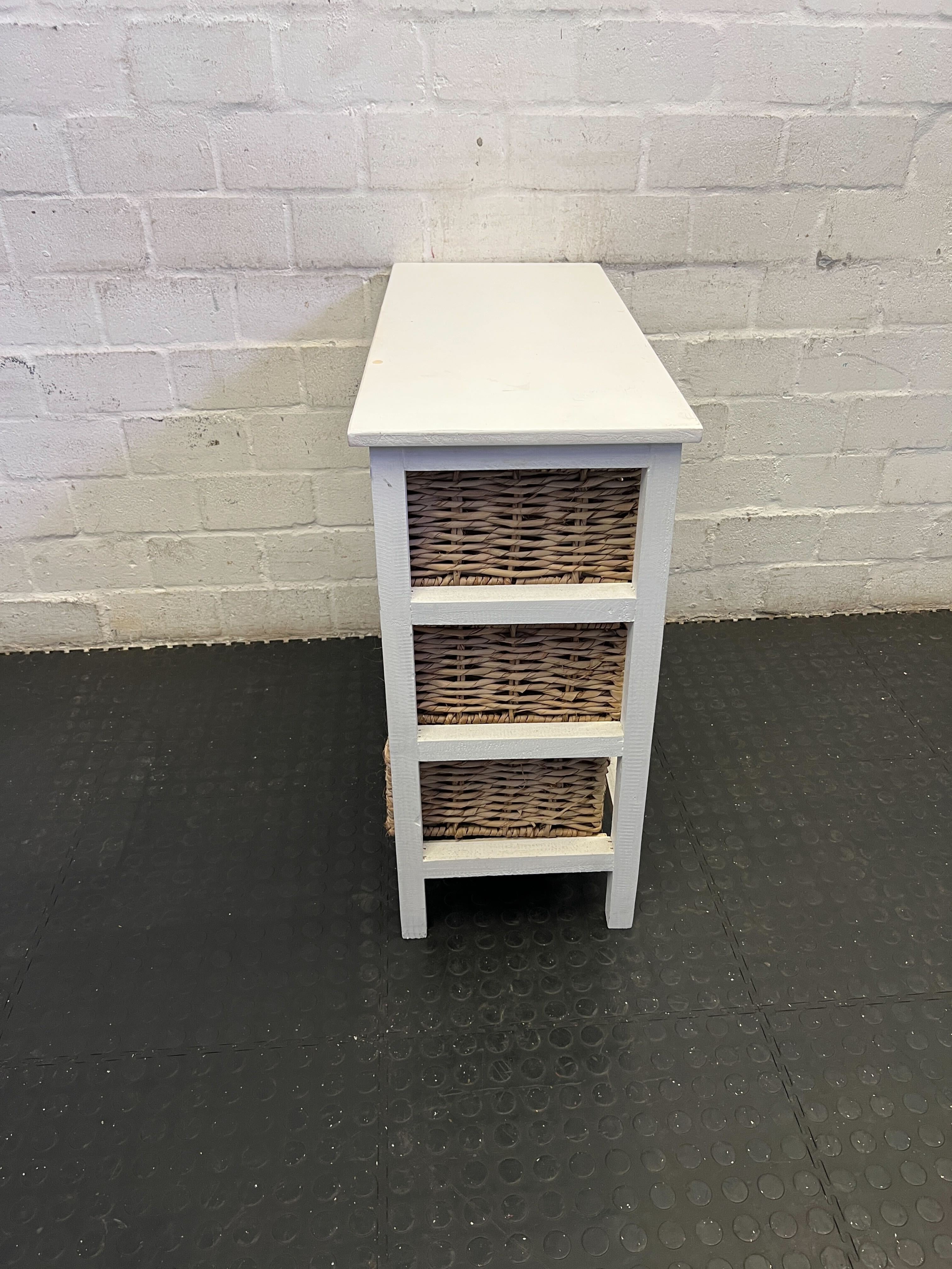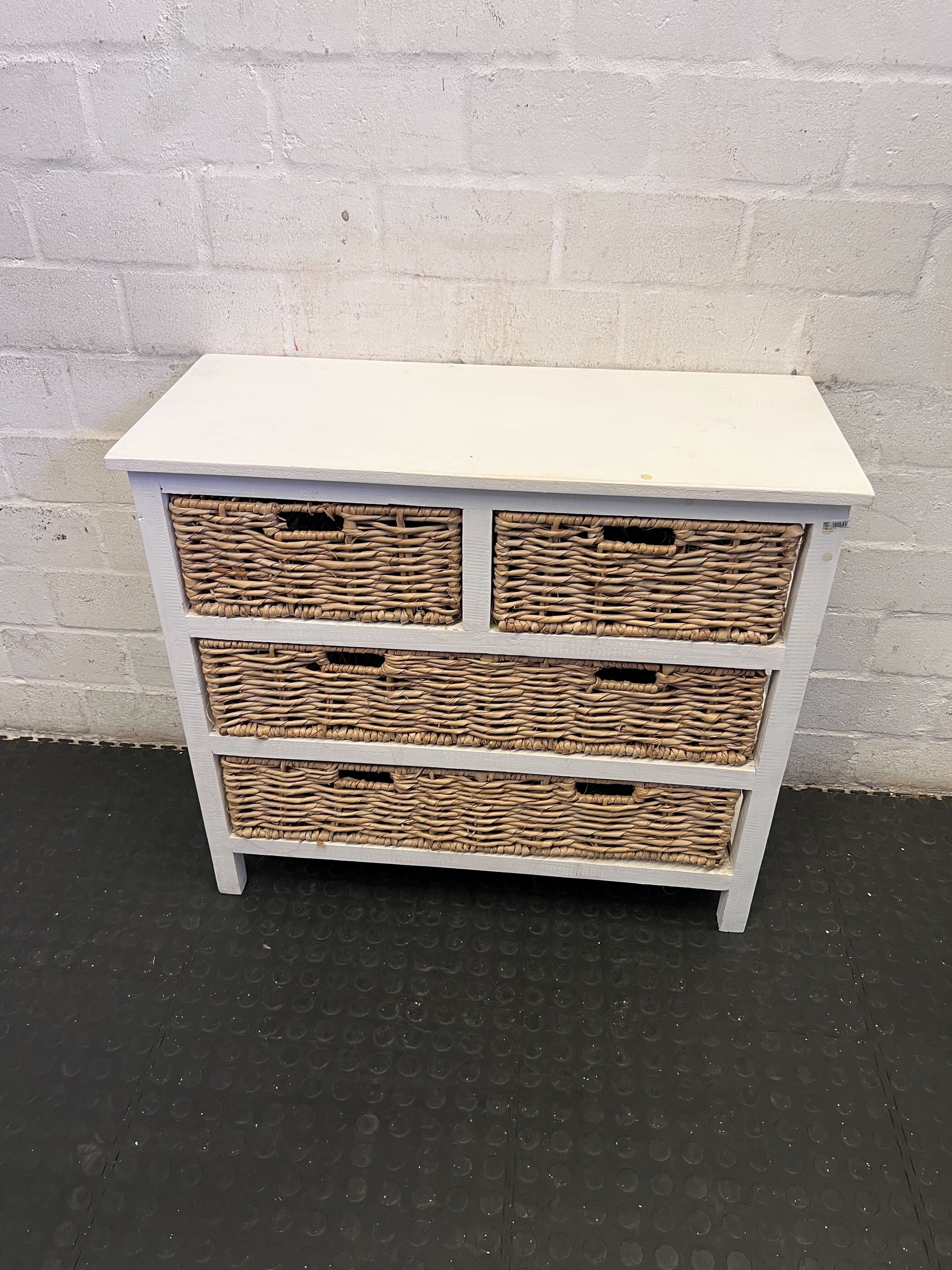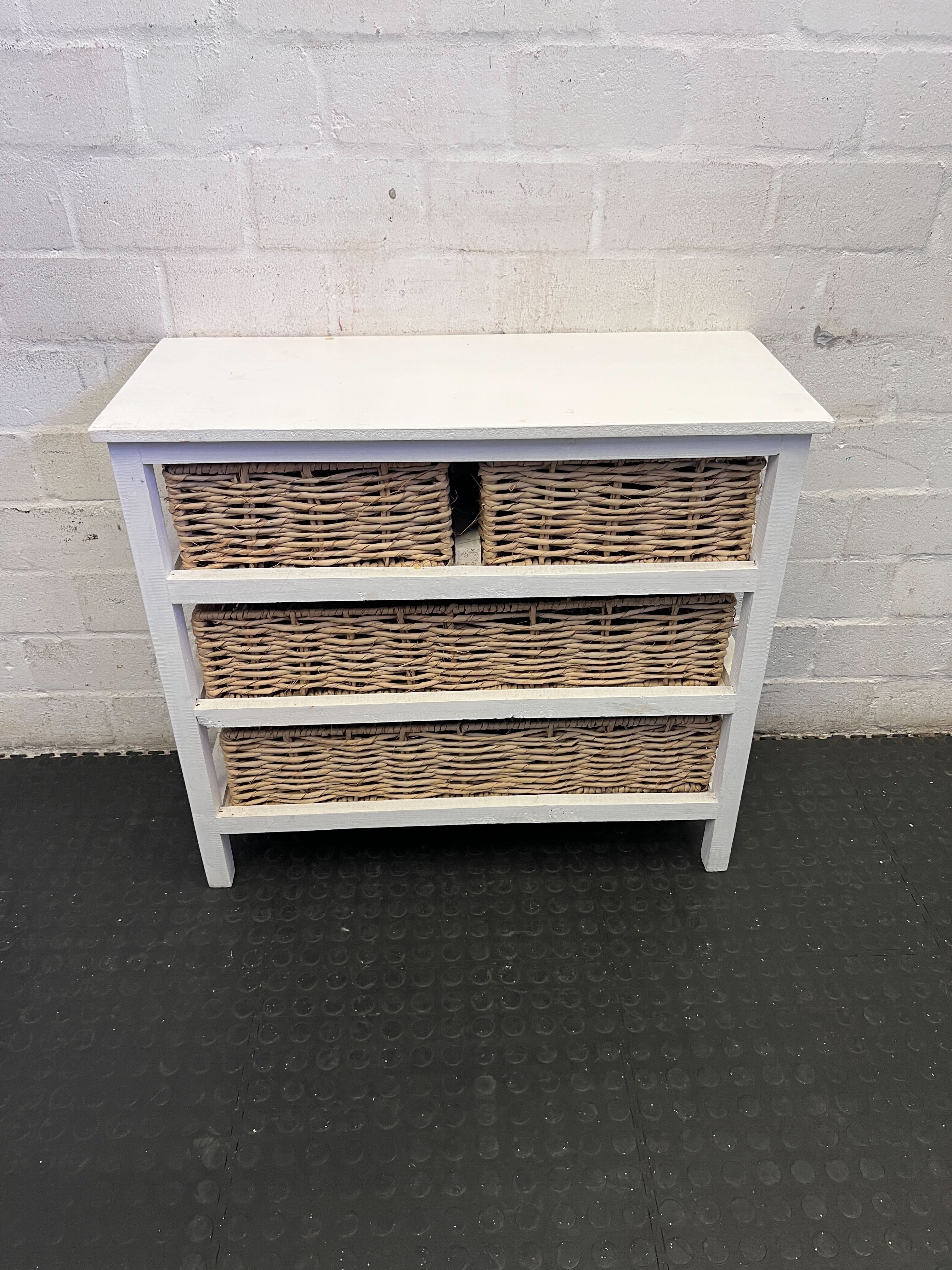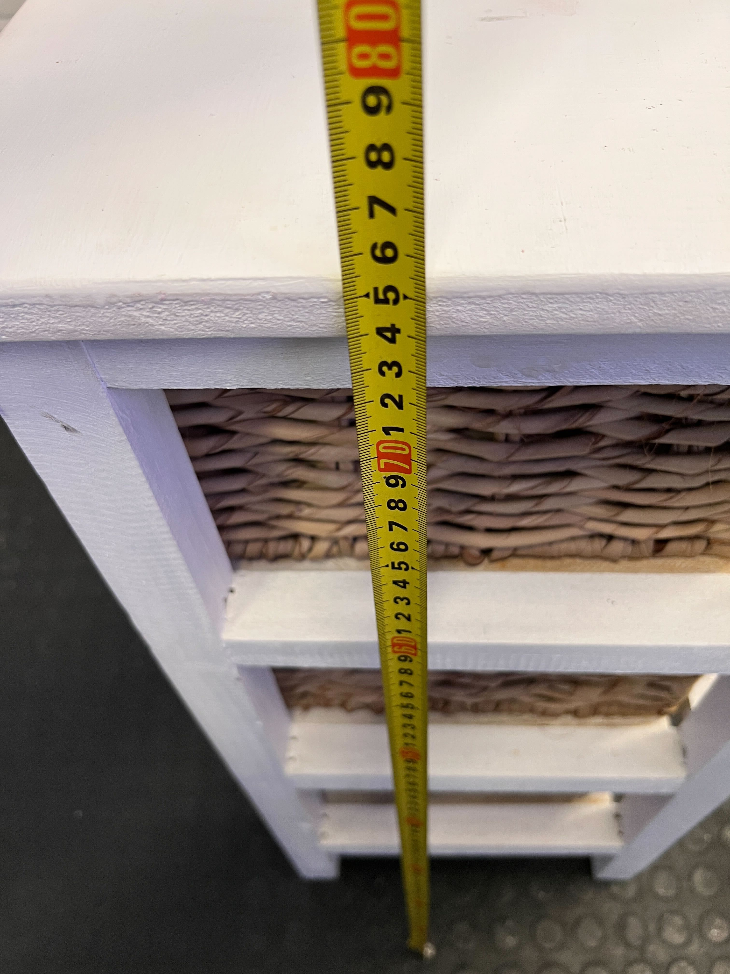 Bring a touch of charming coastal or shabby chic style to your home with this lovely white storage chest featuring six spacious wicker baskets! ✨ Perfect for adding character and practical storage to your bedroom, living room, or entryway. Organize anything from clothes and linens to toys and magazines with ease, keeping your space tidy and stylish. This versatile piece offers a blend of rustic warmth and clean lines, making it a delightful addition to any decor. 🧺 This chest is in good pre-owned condition. The white painted frame shows some light signs of wear and minor distressing consistent with its age and charming shabby chic aesthetic, adding to its character. The wicker baskets are intact and fully functional, ready for use. Please refer to the images for a detailed view of its current state. 💎