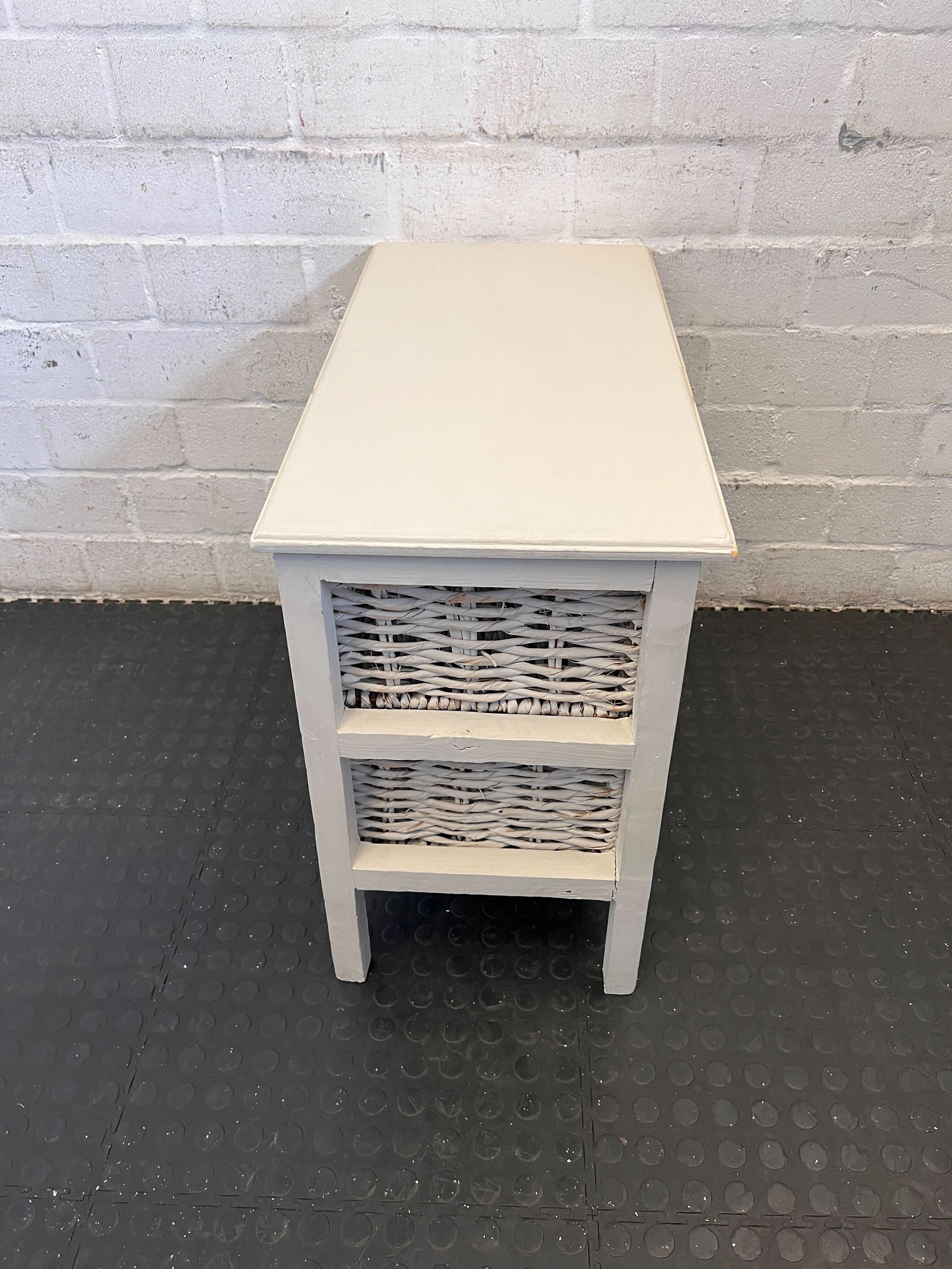 Discover this delightful and versatile storage unit, featuring a sturdy light-coloured wooden frame topped with a smooth surface, perfect for displaying your favourite decor. It boasts two spacious, natural woven wicker baskets that slide out effortlessly, offering a charming solution for organising essentials. This piece is ideal for adding a touch of rustic charm or coastal elegance to any room. Use it as a quaint bedside table, a practical entryway organizer, or a stylish compact storage solution in a living room or bathroom. Its neutral tones allow it to blend seamlessly with various decor styles, offering both beauty and functionality! ✨🛋️ The unit is in good pre-loved condition. There are minor scuffs and marks consistent with normal use on the wooden frame, particularly visible on the top surface and legs. The wicker baskets are intact with no major structural damage, though they show slight signs of wear on the edges from use. Please refer to the images for a detailed view of its current state.