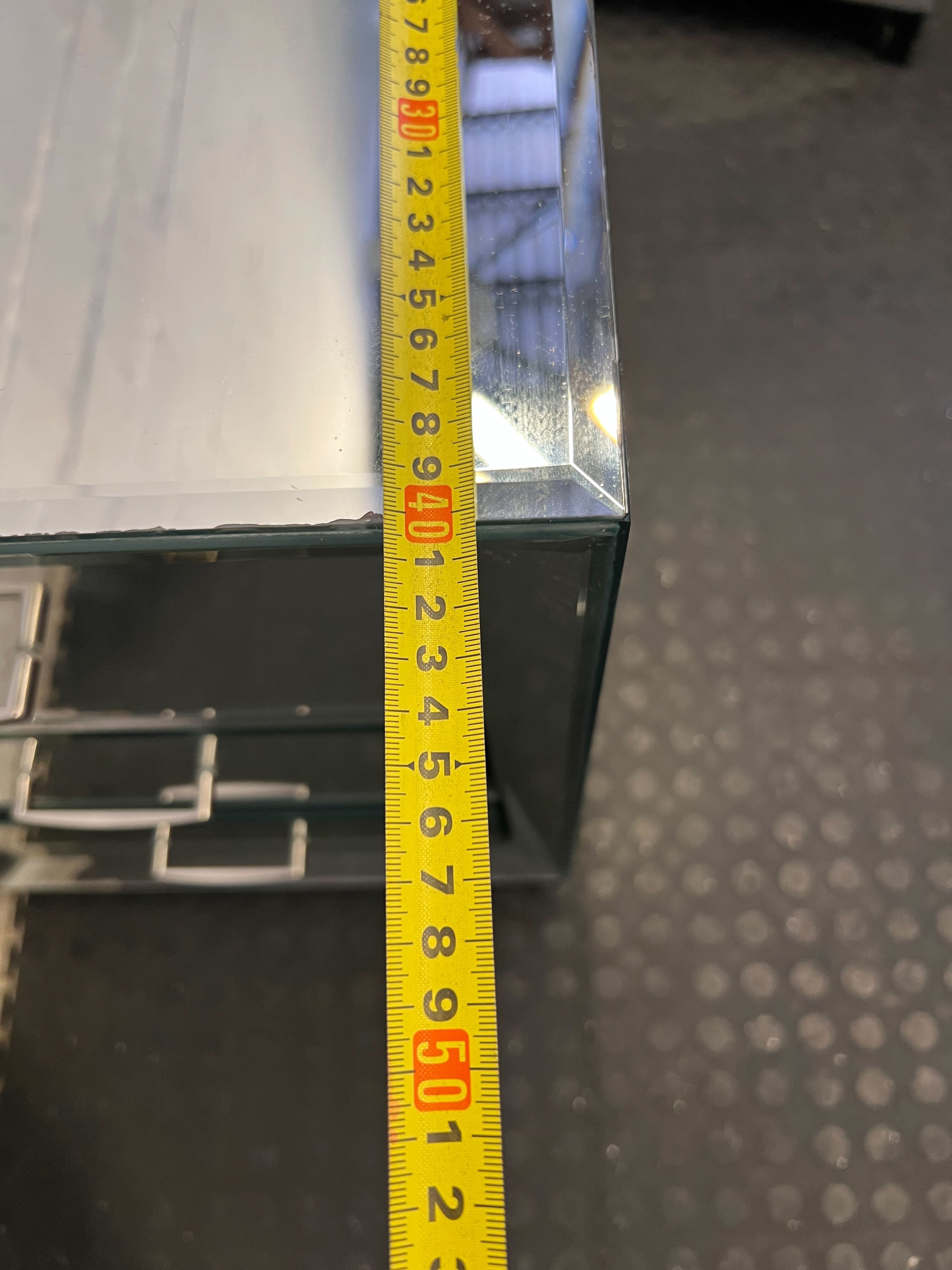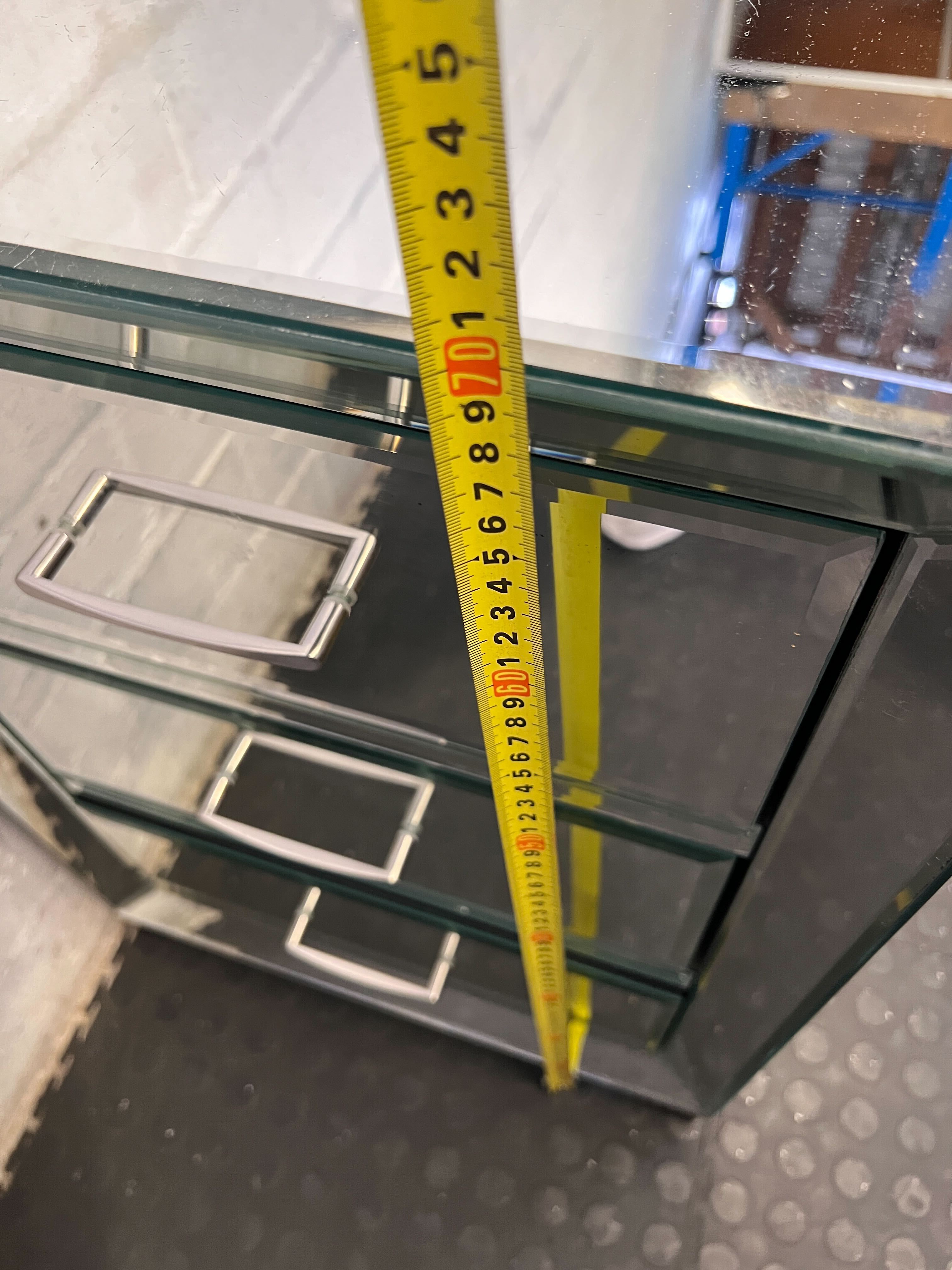 Add a touch of radiant sophistication to your home with this stunning mirrored 3-drawer bedside table! ✨ Its reflective surfaces will beautifully bounce light around any room, creating an open and airy feel. Perfect as a glamorous nightstand in your bedroom, a chic accent table in your living room, or even a stylish storage solution in an entryway. The three spacious drawers offer practical storage for your essentials, while the intricate dotted detailing along the top edge adds a unique charm. A true statement piece for any modern or art deco inspired interior. 🛋️💎 This pre-loved mirrored cabinet is in good used condition. There are some minor surface marks, dust, and smudges consistent with its age and previous use, which are common for mirrored furniture and can be cleaned. Please refer to the images for a detailed view of its current state.