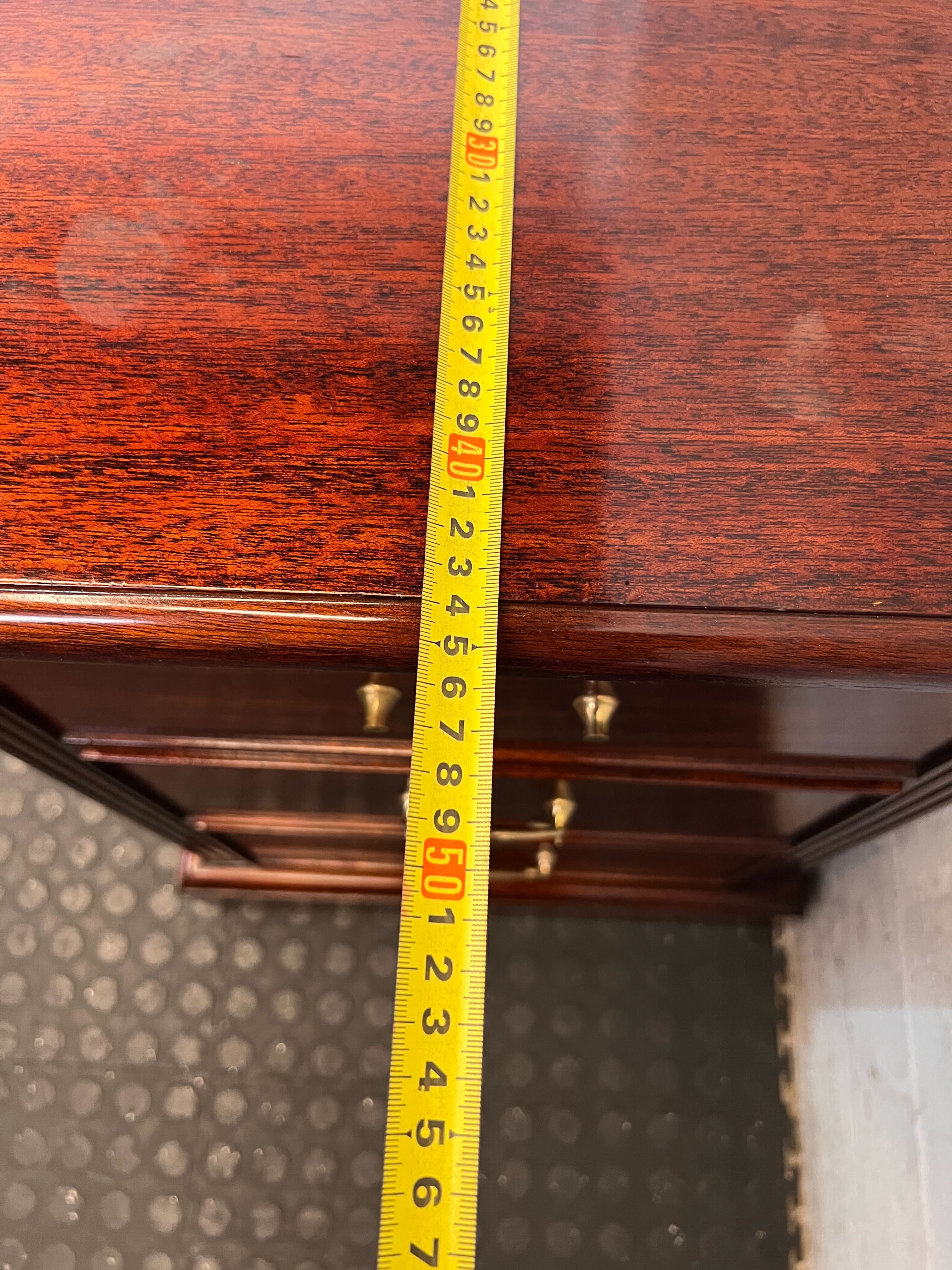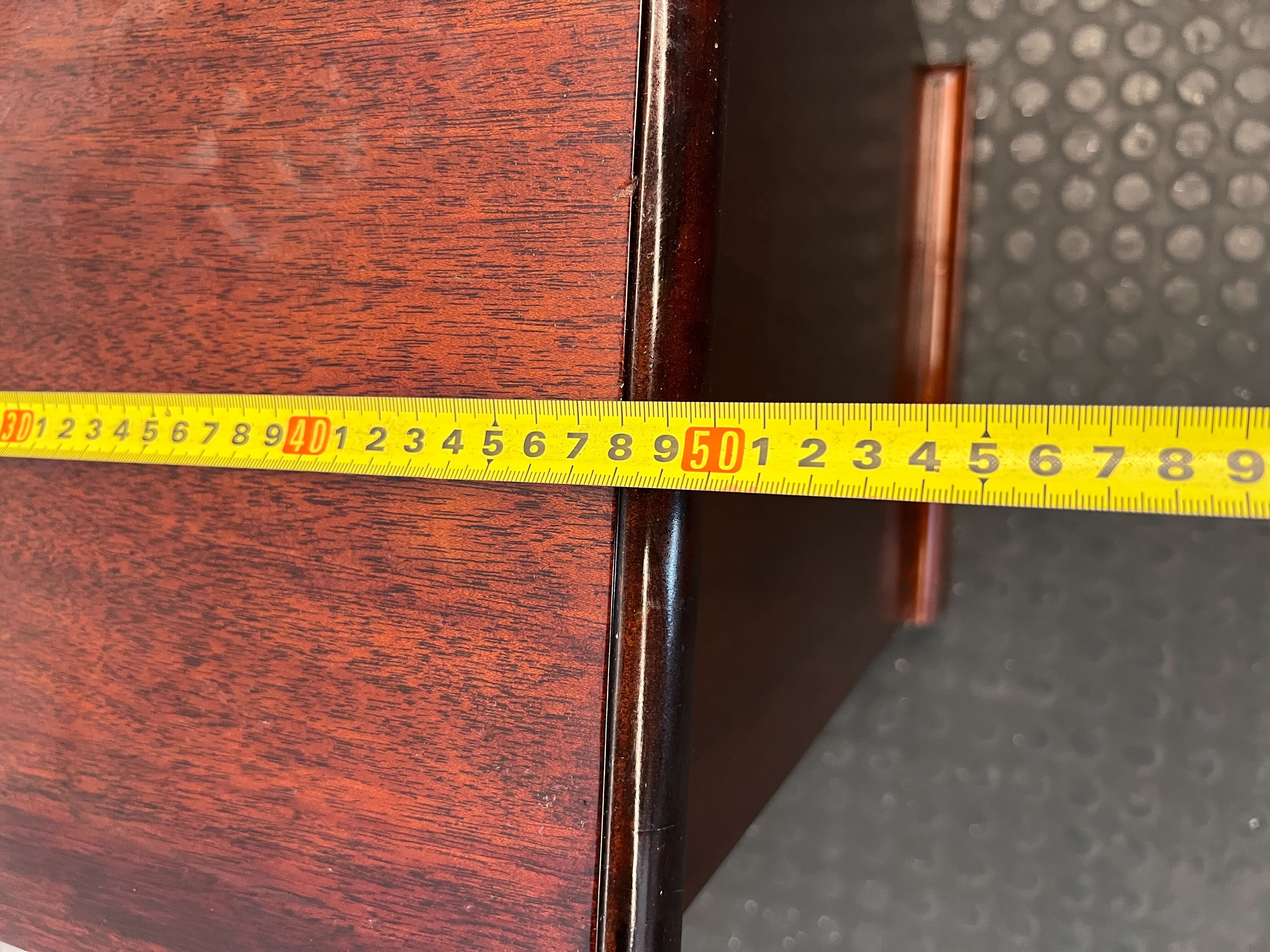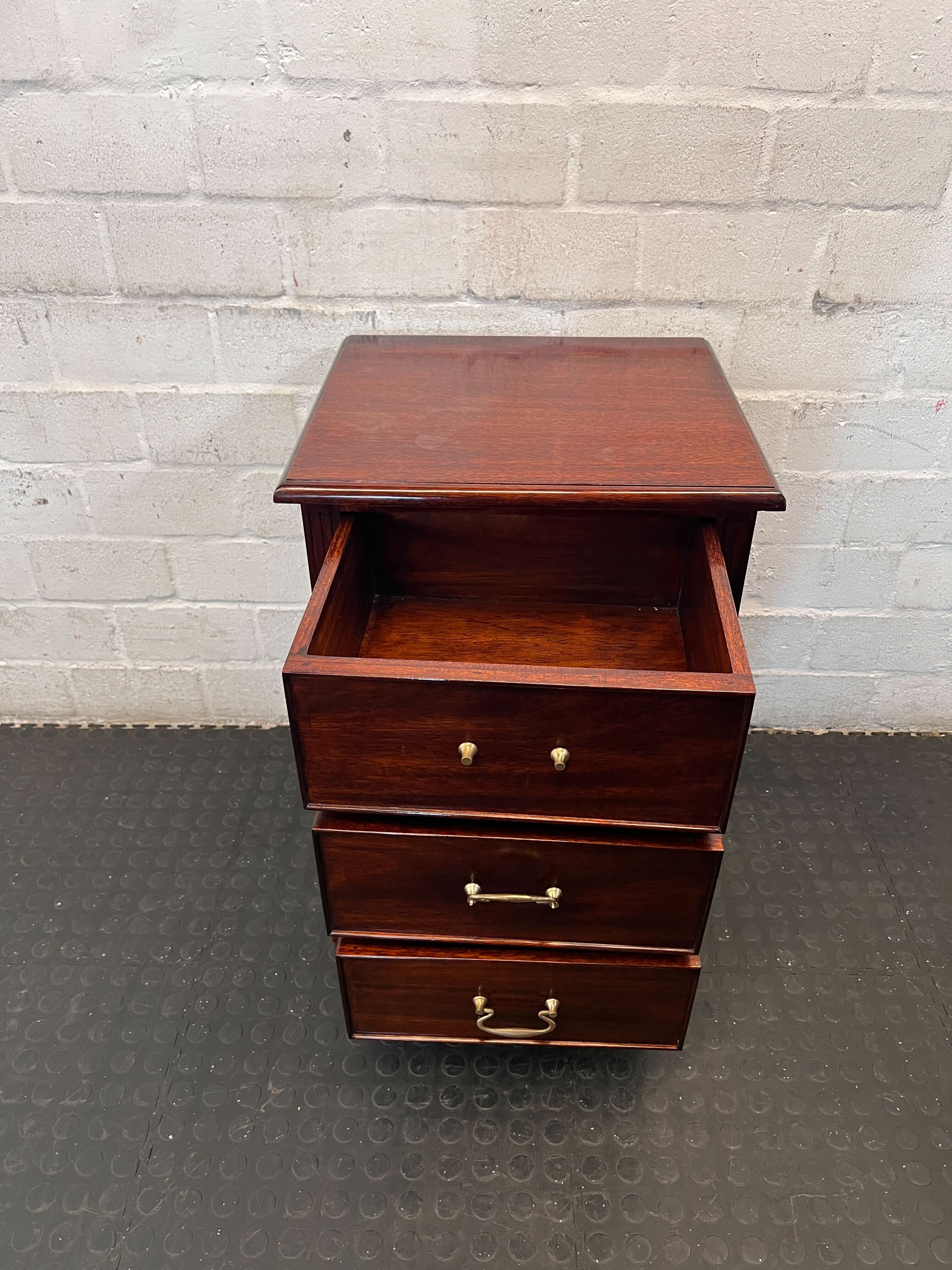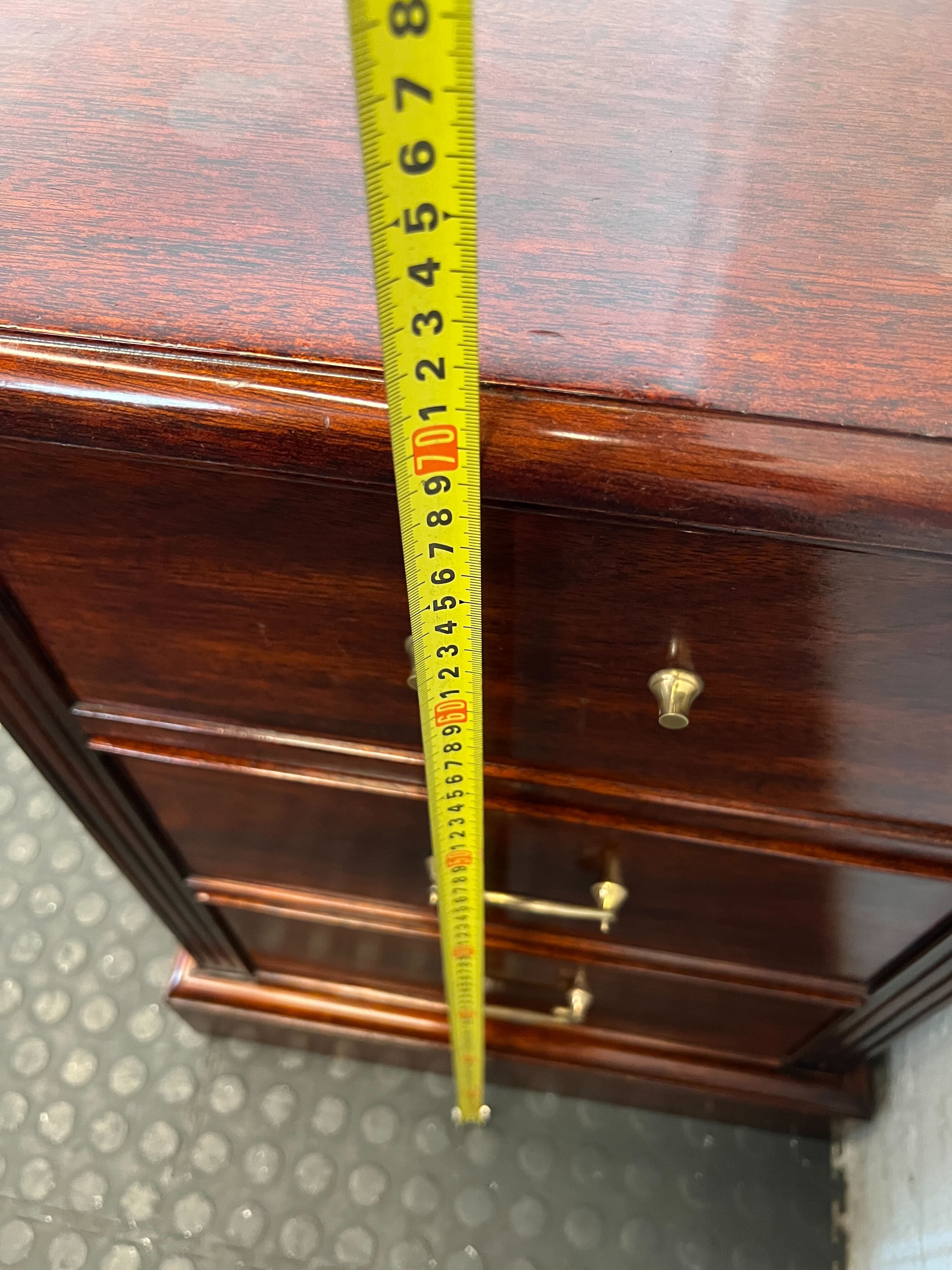 Add a touch of timeless elegance to your home with this beautiful classic dark wood 3-drawer cabinet! Perfect as a charming bedside table, a practical side table in your lounge, or even a compact storage solution in a hallway. Its rich, deep wood tone and traditional brass hardware evoke a sense of heritage and sophistication, making it a versatile piece for various decor styles. Whether you're looking for bedroom storage or an accent piece, this cabinet offers both functionality and style. 🛋️💎 This cabinet is in good pre-loved condition, showing some minor signs of wear consistent with its age and use. There are a few light surface scratches and scuffs on the wood, particularly on the top surface and edges, as can be seen in the images. The brass hardware has developed a lovely patina. These imperfections add to its vintage character and do not detract from its overall appeal.