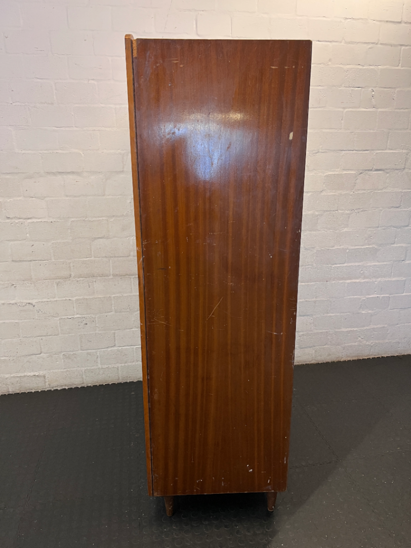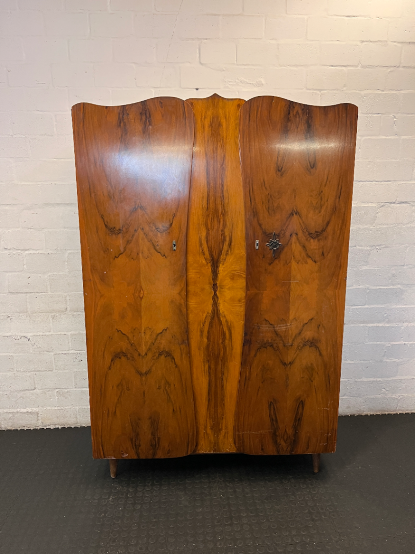 Add a touch of mid-century character to your home with this vintage-style wooden wardrobe. Featuring a beautiful contrasting wood grain pattern on the front and unique curved door details, this piece offers a striking aesthetic that you won't find in modern furniture. The interior is well-equipped with a hanging rail and a convenient set of three small drawers, one of which includes a mirror-fronted panel, perfect for organizing your essentials.