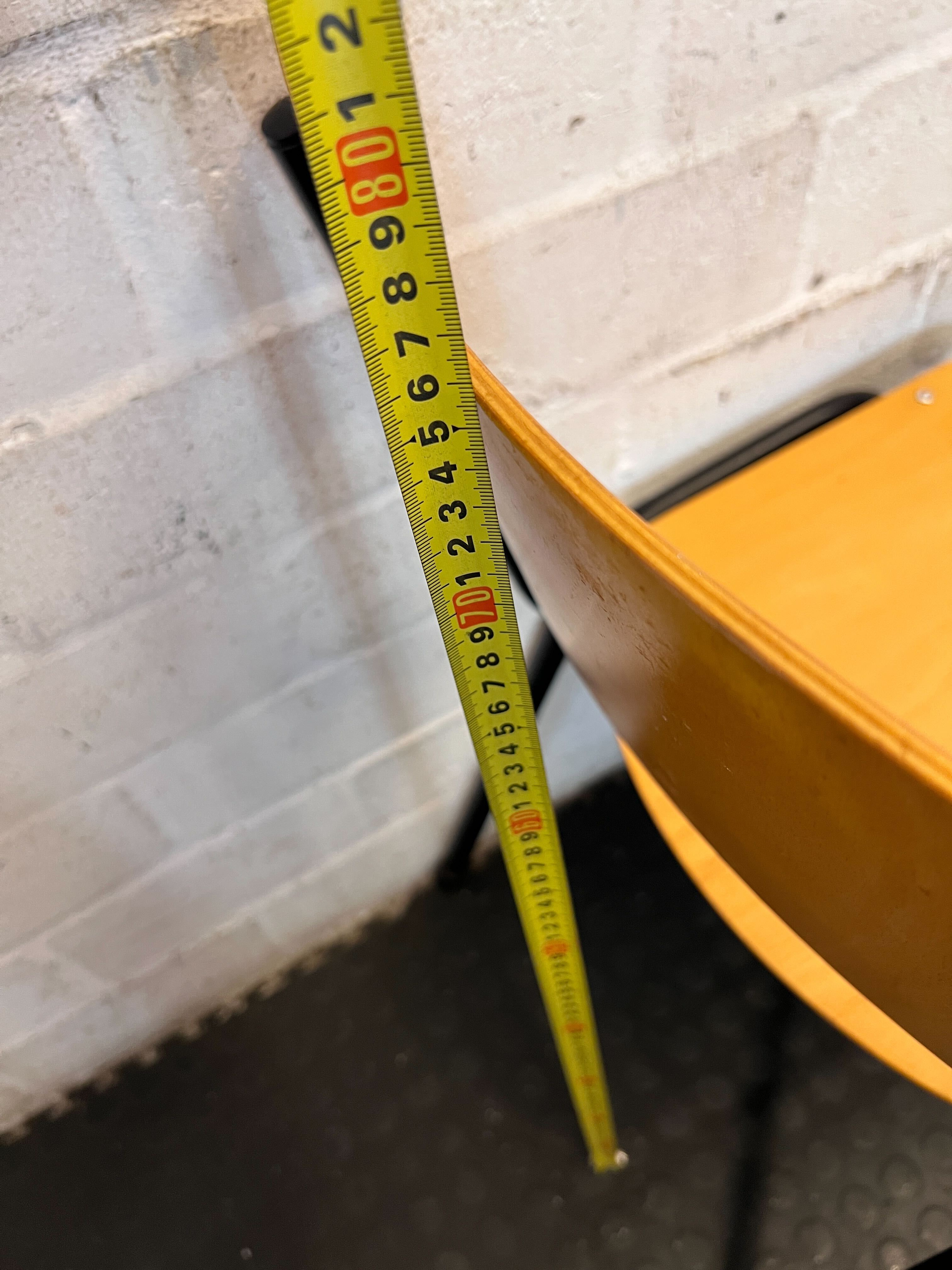 Add a touch of retro charm to your space with this sturdy vintage utility chair! ✨ Featuring a classic design with a warm wooden seat and backrest contrasted by a robust black metal frame, this chair is as practical as it is stylish. Perfect for a desk, a dining nook, or as extra seating in any room, its timeless aesthetic blends seamlessly with various decor styles, from industrial to minimalist. This chair is in good, used condition consistent with its age. There are visible scuffs, scratches, and minor marks on the wooden surfaces of both the seat and backrest, adding to its authentic vintage character. The black metal frame shows some wear and paint chips, but remains sturdy and structurally sound. Please review all images for a comprehensive view of its condition.