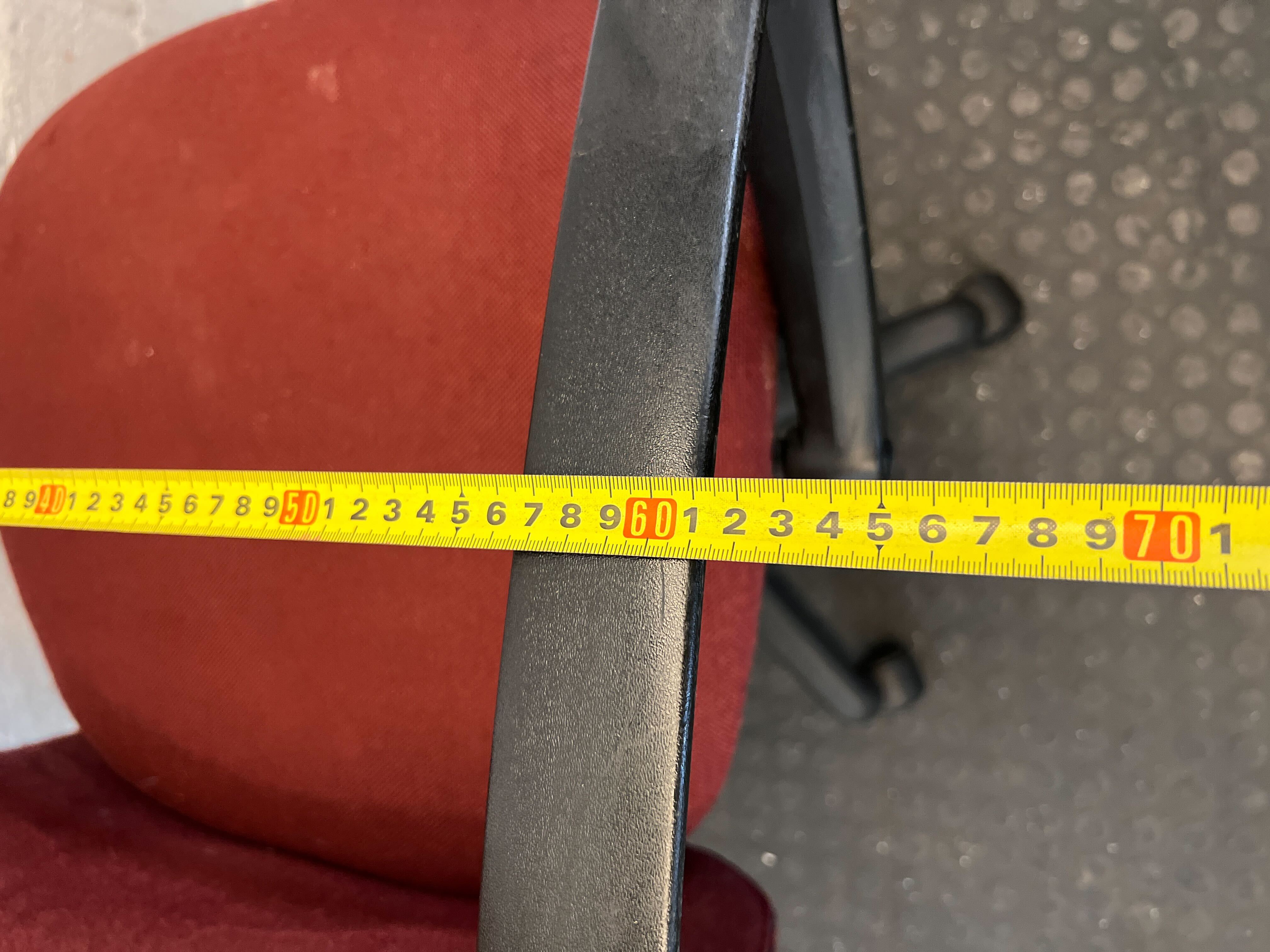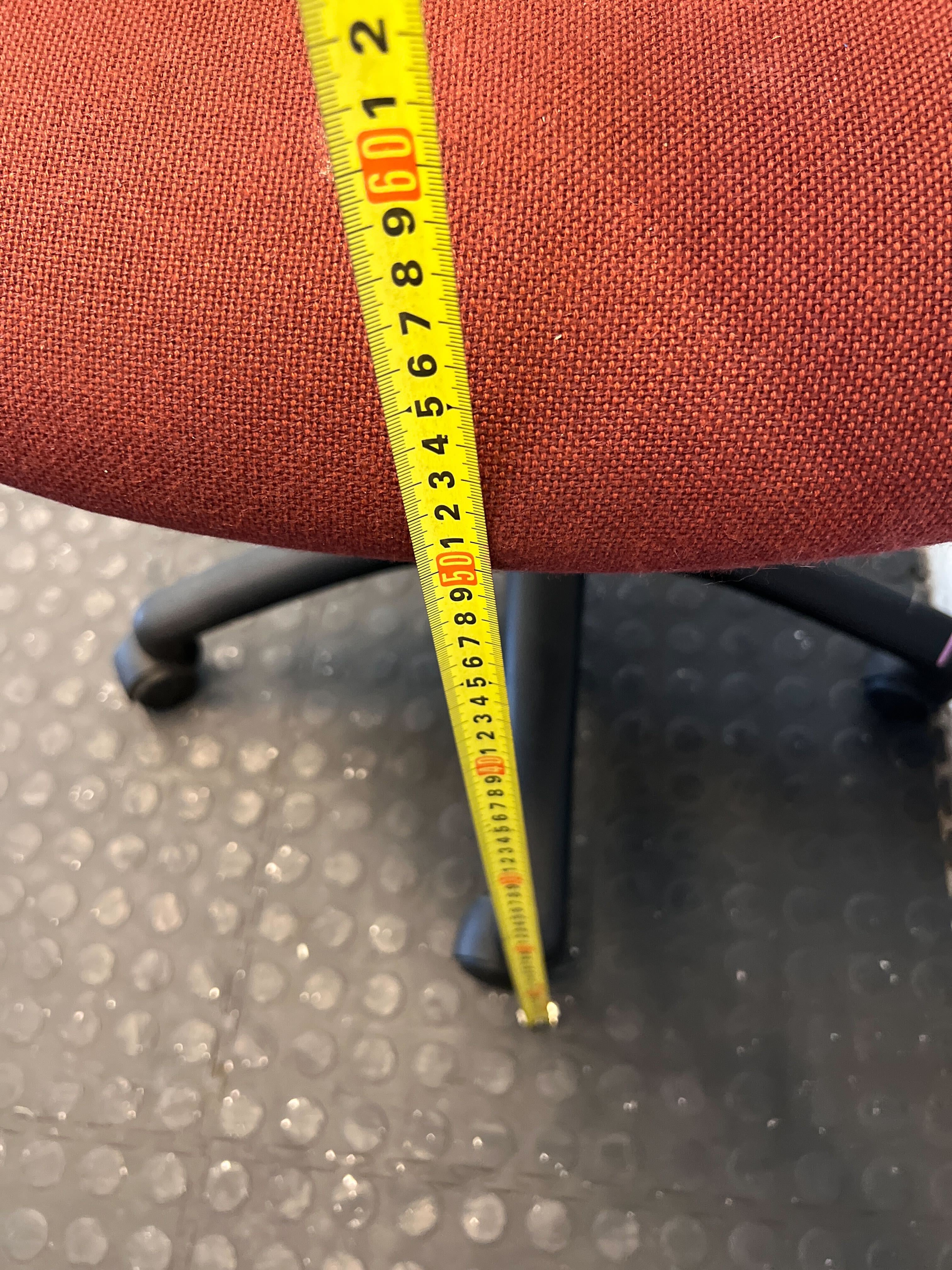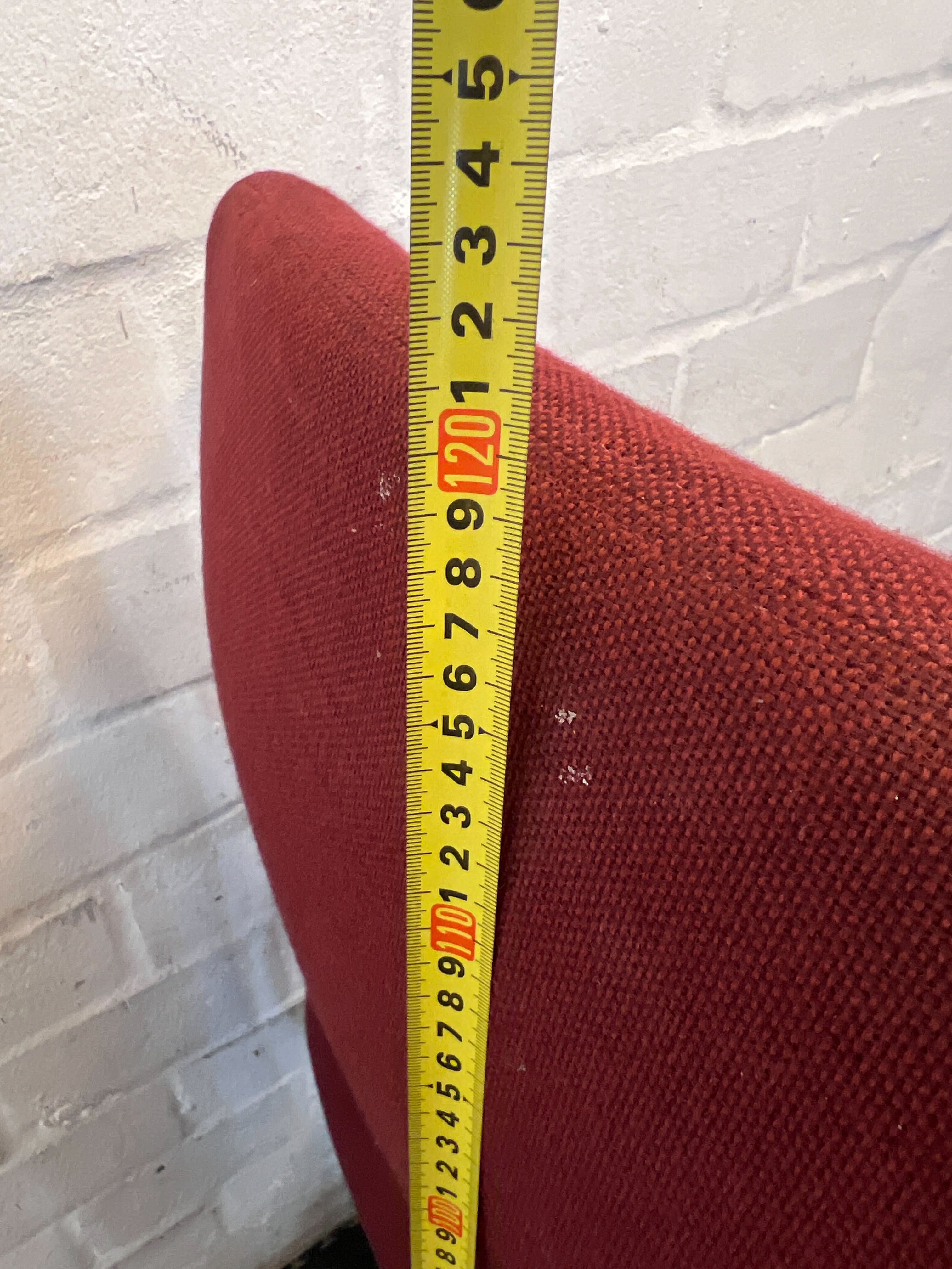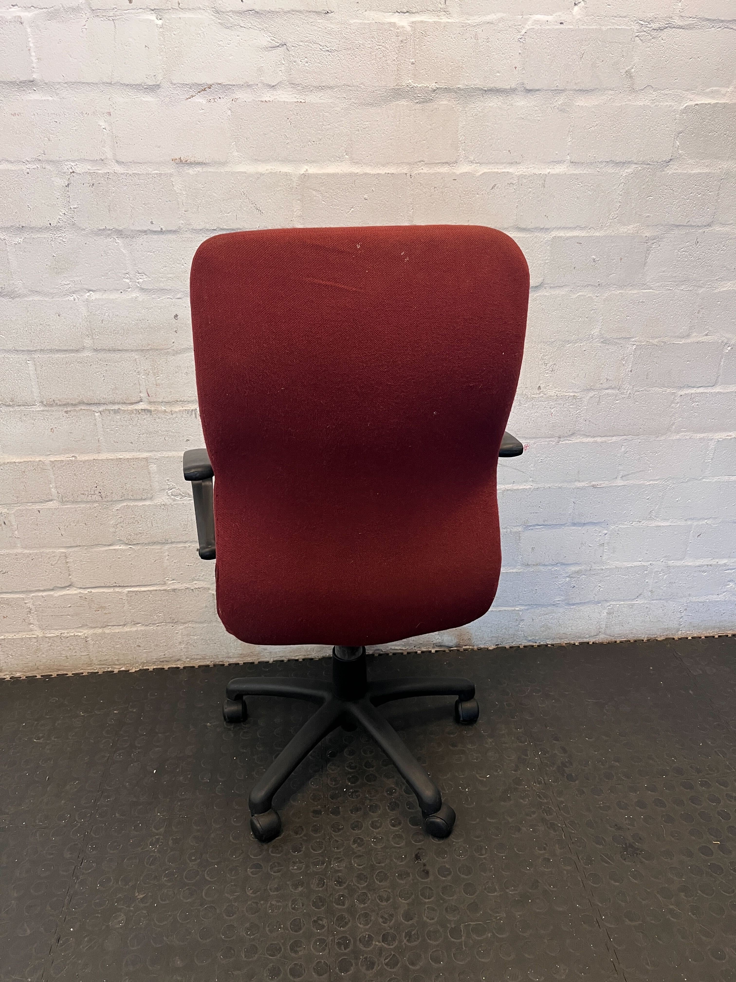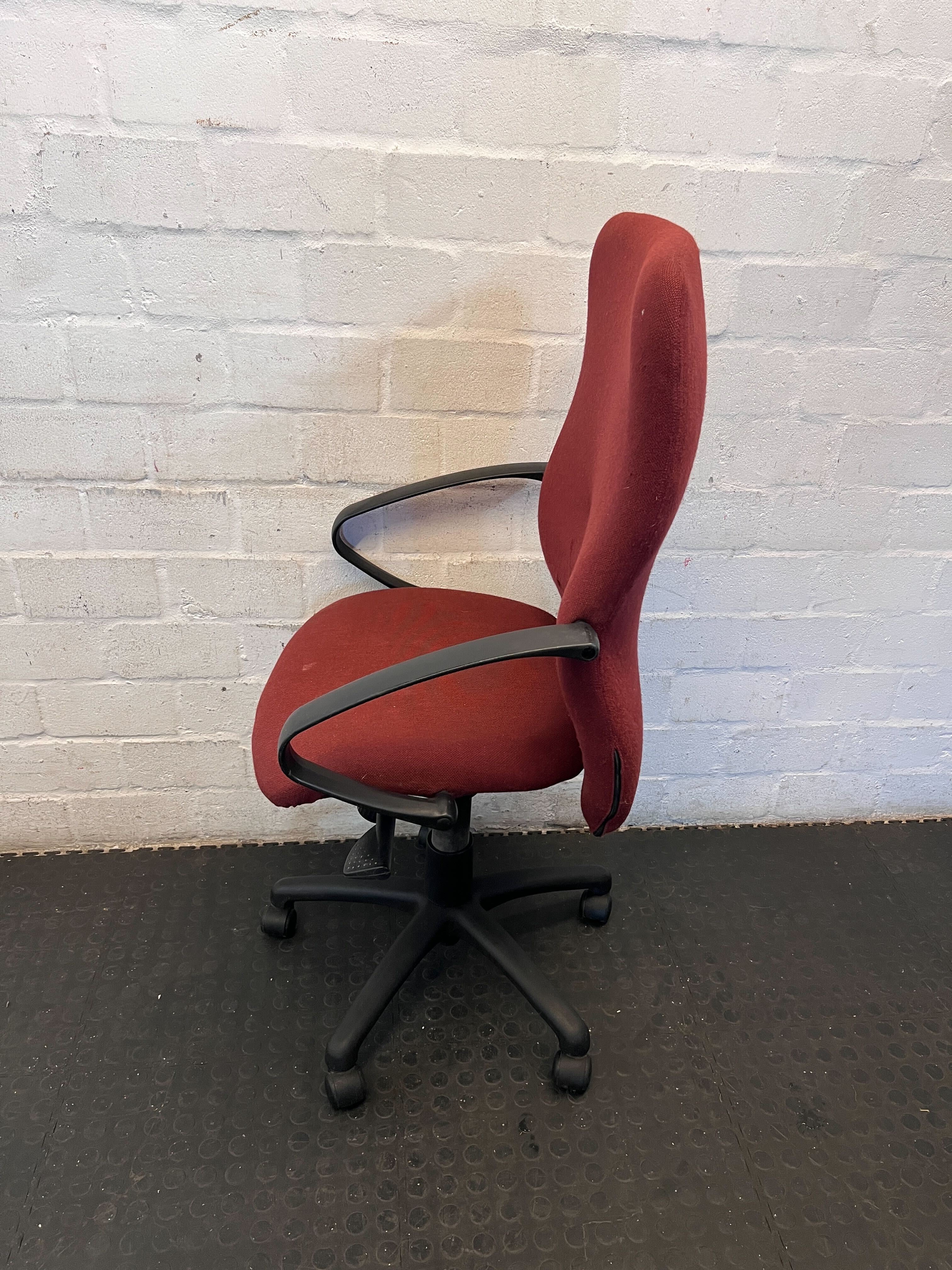 Upgrade your workspace with this comfortable and stylish pre-owned red swivel office chair! ✨ Perfect for a home office, study nook, or a professional business environment, this chair offers a practical and ergonomic seating solution. Its high back and armrests provide good support for long hours at your desk. 🛋️ This chair is in good used condition, showing typical signs of wear consistent with its age and previous use. The red fabric upholstery has some minor marks and a slight indentation on the backrest, as visible in the image. The armrests and five-star wheeled base are sturdy and fully functional, with general scuffs expected on a second-hand item. It's ready for its next chapter!