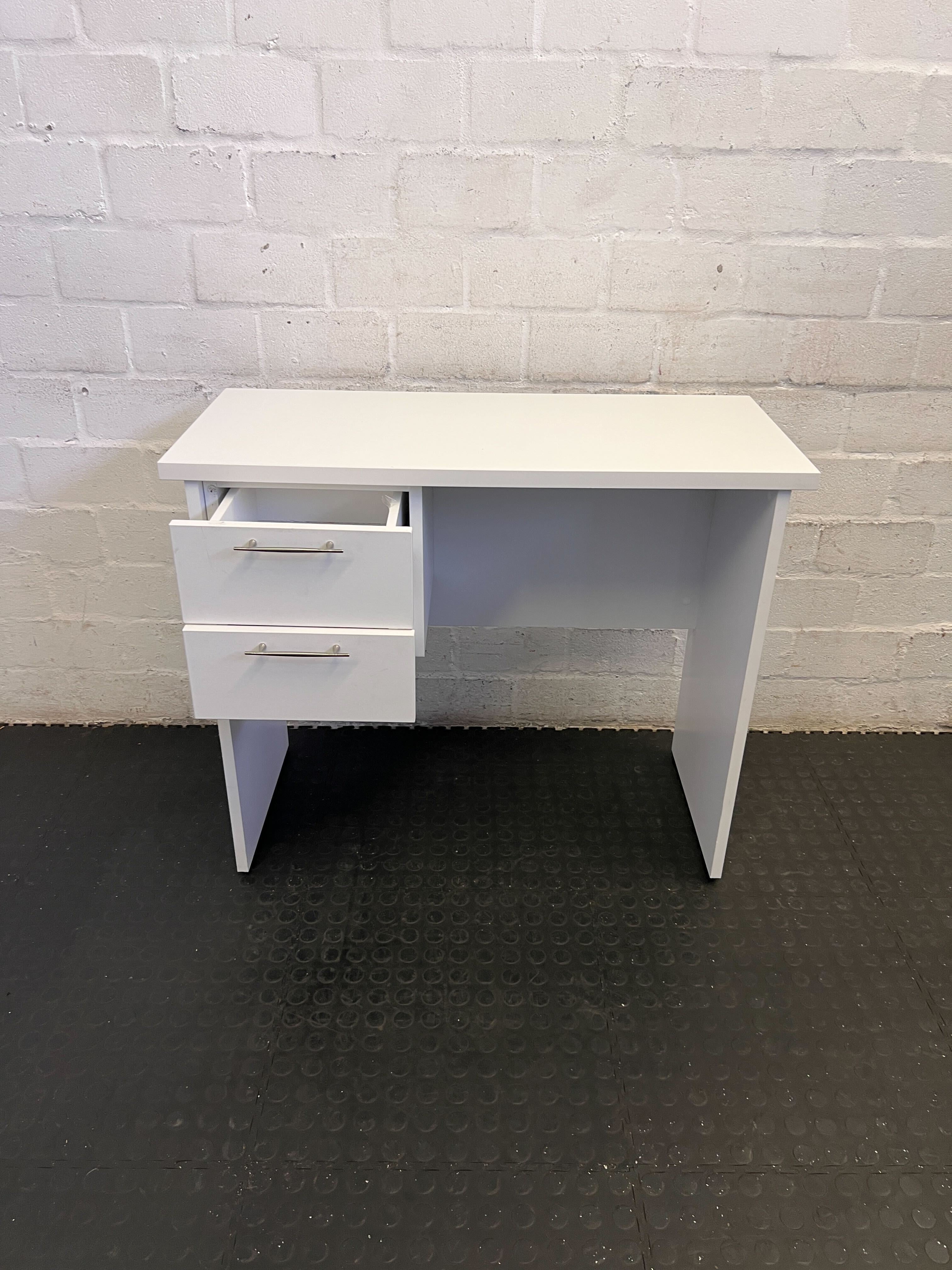 Enhance your workspace with this chic and functional White Minimalist Desk! ✨ Perfect for a home office, student room, or even as a compact vanity, this desk offers a clean design that complements any decor. It features two convenient drawers on the left, providing discreet storage for your essentials, keeping your desktop clutter-free. The open space on the right offers ample legroom and versatility for various setups. A stylish and practical addition to any small space! 💻 This desk is in good second-hand condition with general signs of use consistent with its age. There may be minor surface scuffs or small marks, but overall it presents very well and is ready for its next home. Please refer to the images for a detailed view of its current state.