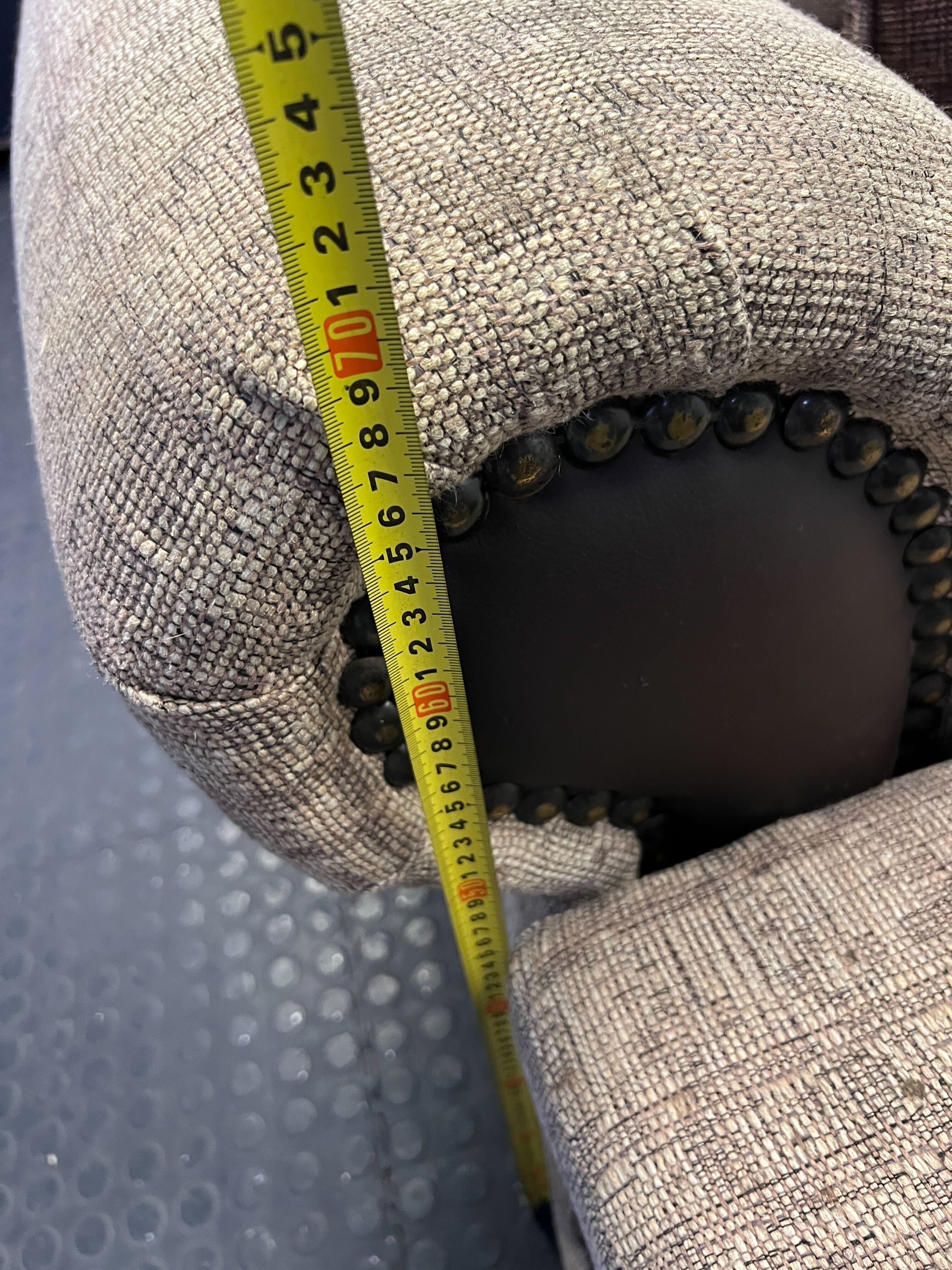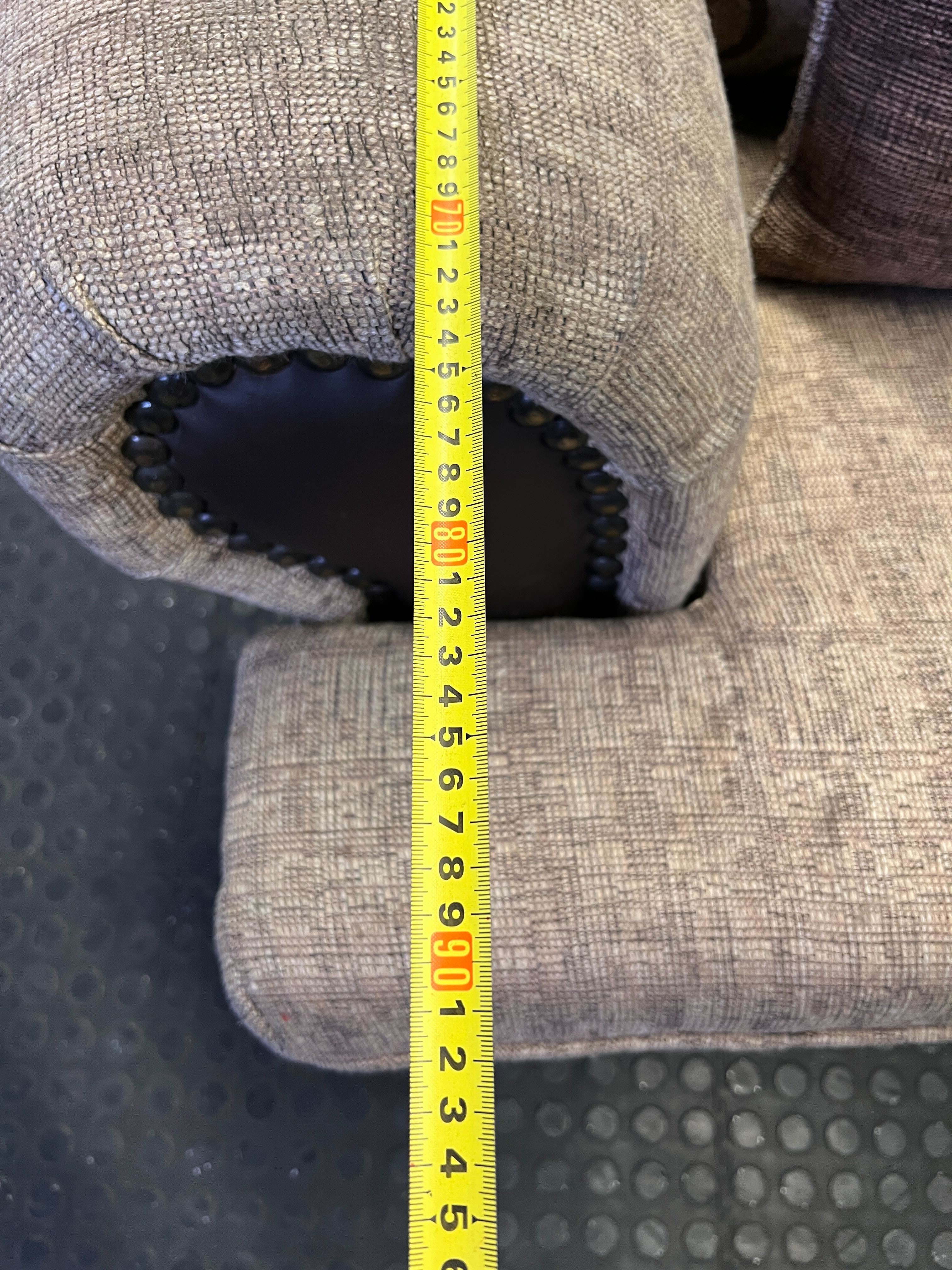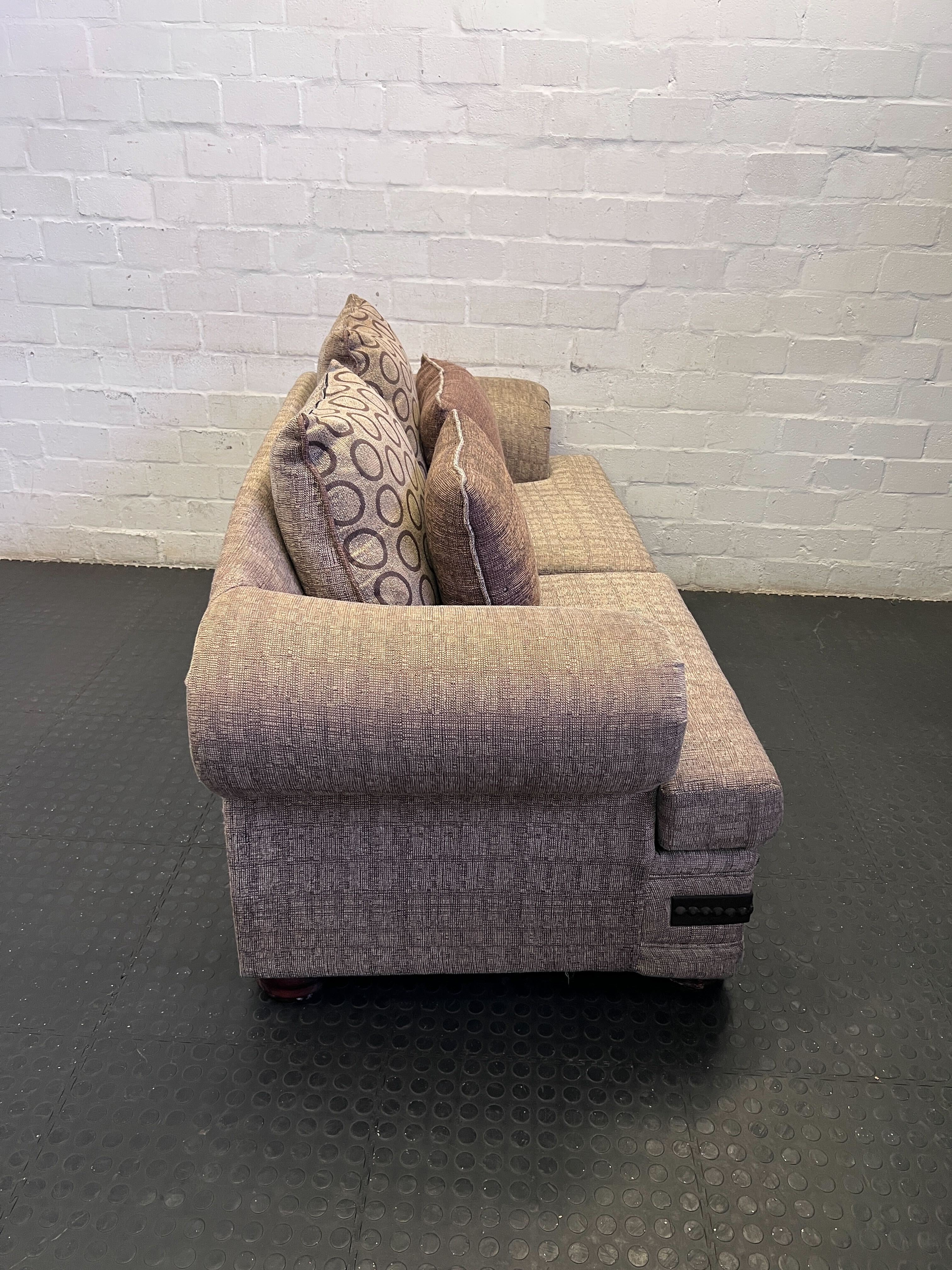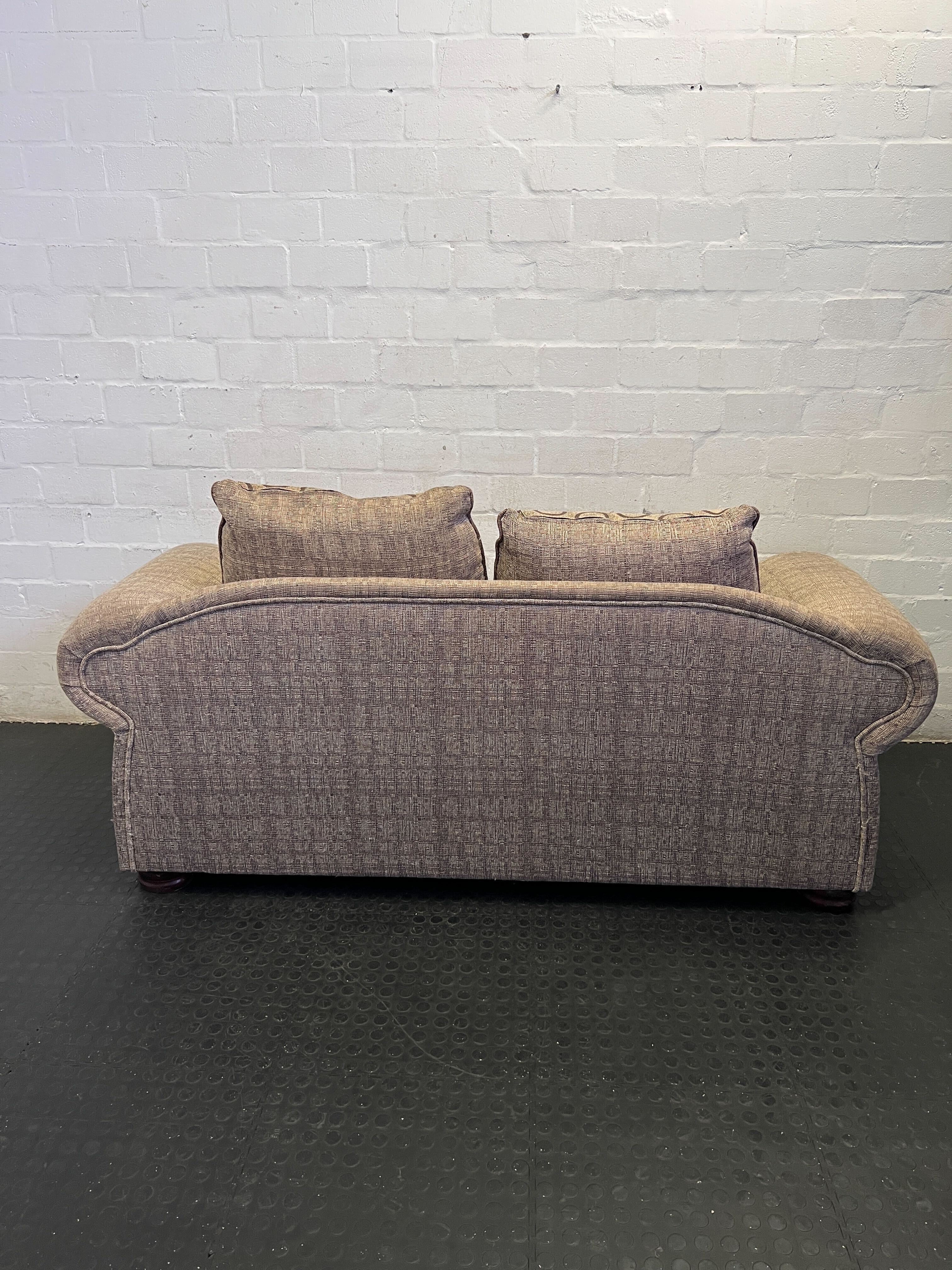 A56941Bring warmth and classic style to your living space with this charming two-seater sofa! 🛋️ Featuring a delightful patterned fabric in neutral tones, this cozy loveseat is designed for comfort and elegance. It boasts rounded armrests accented with rich dark faux leather and sophisticated stud detailing, adding a touch of vintage flair. Two plush, plain brown throw pillows are included, perfectly complementing the sofa's design and enhancing its inviting appeal. Ideal for a smaller living room, a reading nook, or as extra seating, this sofa is ready to make your home more comfortable.Condition: This sofa is in good pre-owned condition, showing minor signs of use consistent with a cherished second-hand item. The fabric is generally clean, and the structure is sound. Please refer to the images for a detailed view of its current state. #Sofa #Loveseat #PreOwnedFurniture #HomeDecor #2ndhandwarehouse🧡