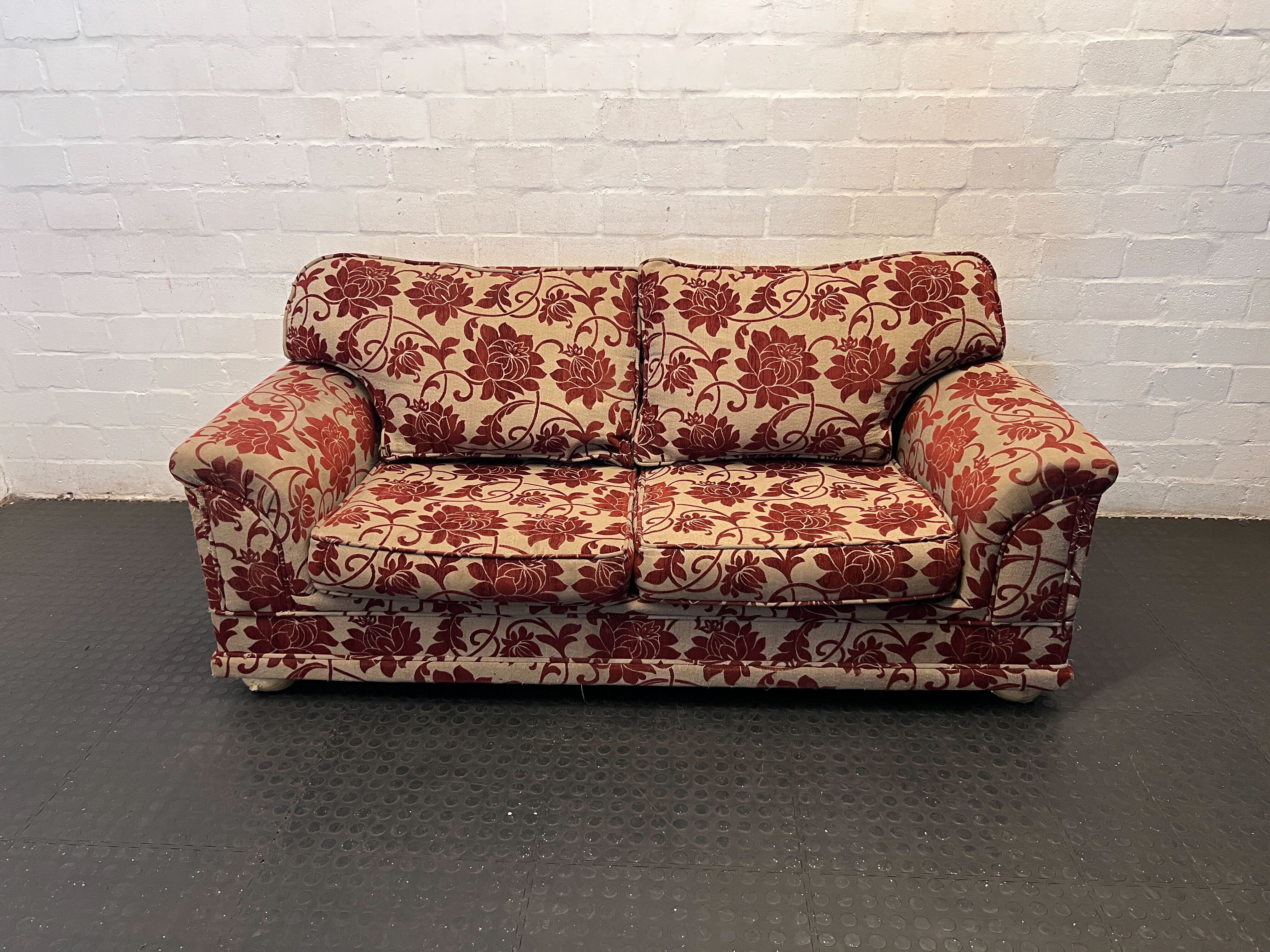 Add a touch of vintage charm and coziness to your living space with this delightful 2-seater sofa! ✨ Featuring a beautiful red floral pattern on a warm beige background, this classic couch is perfect for creating a warm and inviting atmosphere in any room. Its compact size makes it ideal for smaller apartments, studies, or as an accent piece in a larger lounge. Imagine curling up with a good book or enjoying a cuppa on this lovely piece! 🛋️ This pre-loved sofa is in good condition with general wear consistent with its age and use. The fabric shows minor signs of fading and light marks, but no rips or significant damage are visible from the images. It remains a sturdy and comfortable piece, ready to find its new home.
