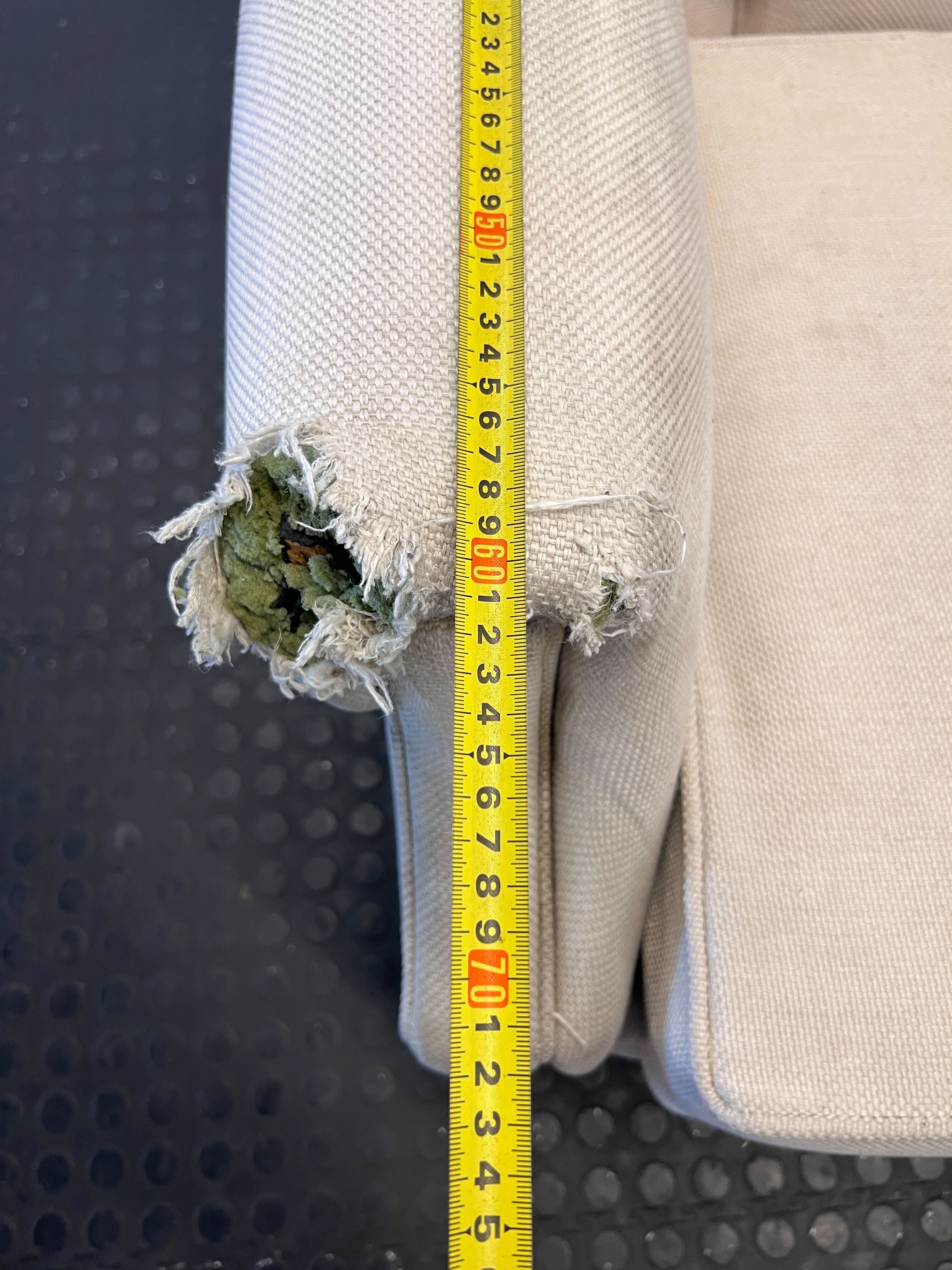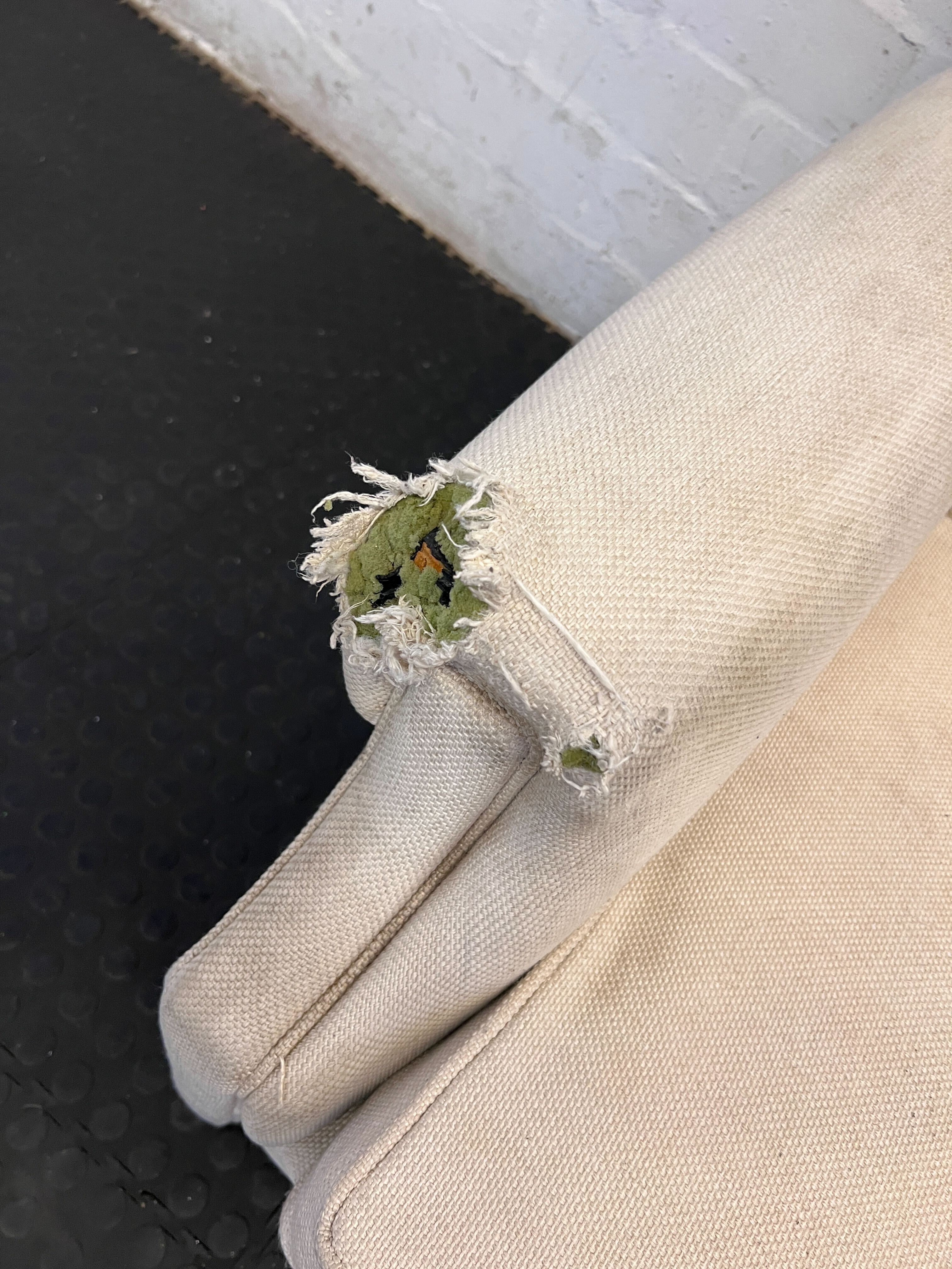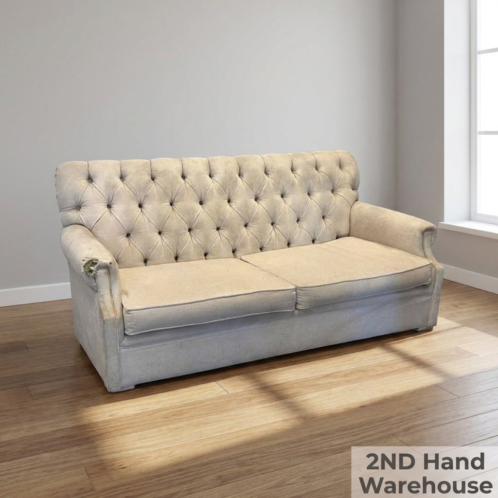 Add a touch of classic elegance to your home with this charming cream two-seater sofa. ✨ Featuring beautiful button-tufted detailing on the backrest, reminiscent of the timeless Chesterfield style, this loveseat is perfect for creating a cozy and inviting atmosphere in your living room, study, or even a spacious bedroom. Its neutral tone allows it to seamlessly blend with various decor styles, from traditional to shabby chic. Imagine curling up with a book or enjoying intimate conversations on this lovely piece! 🛋️ This pre-loved sofa is in good used condition, showing signs of its previous life that add to its character. Please note there is visible wear and tear on the left armrest, including some fraying of the fabric, as shown in the images. There may also be minor marks or scuffs consistent with a second-hand item. We recommend a professional clean to bring out its full potential.
