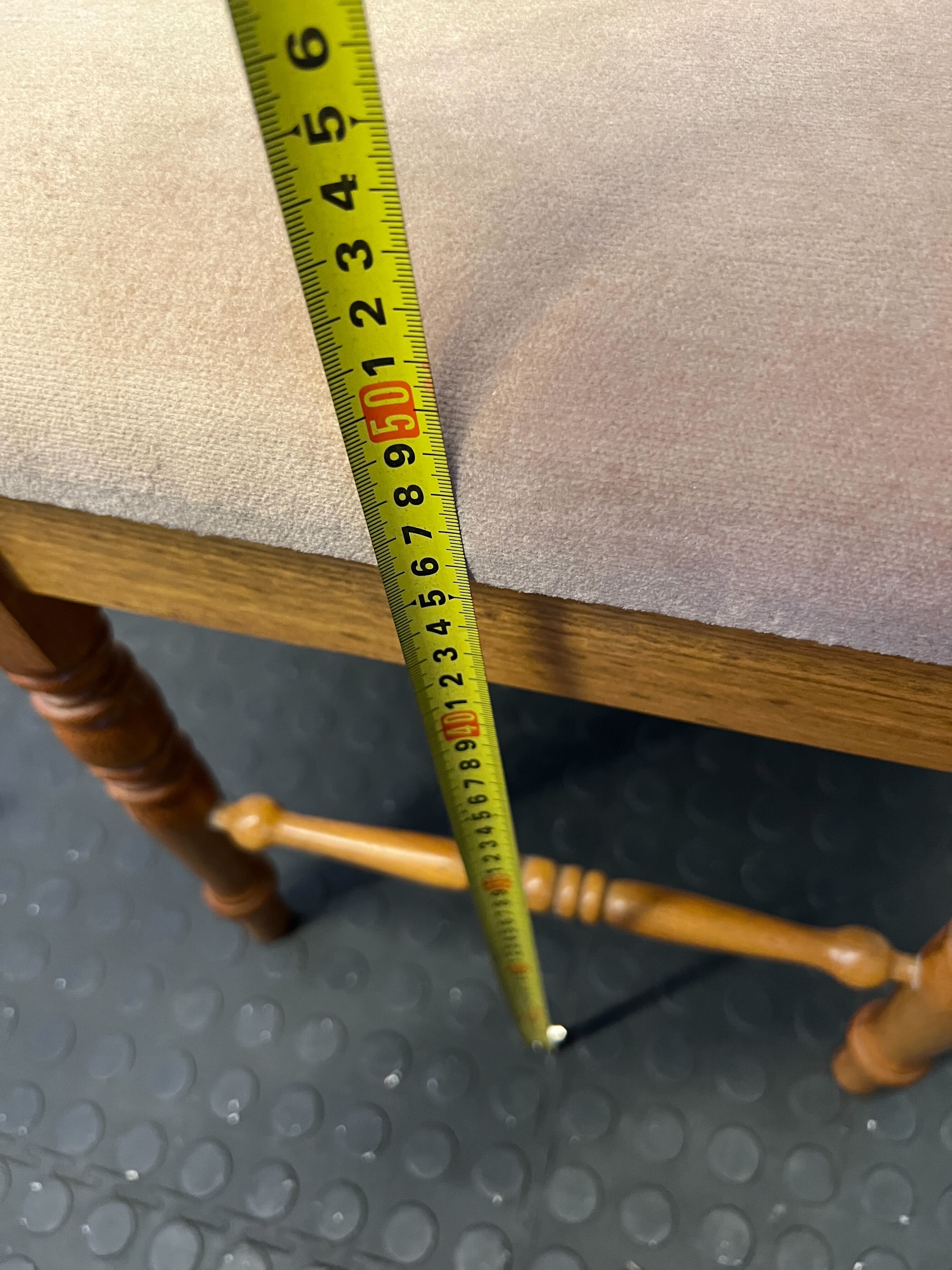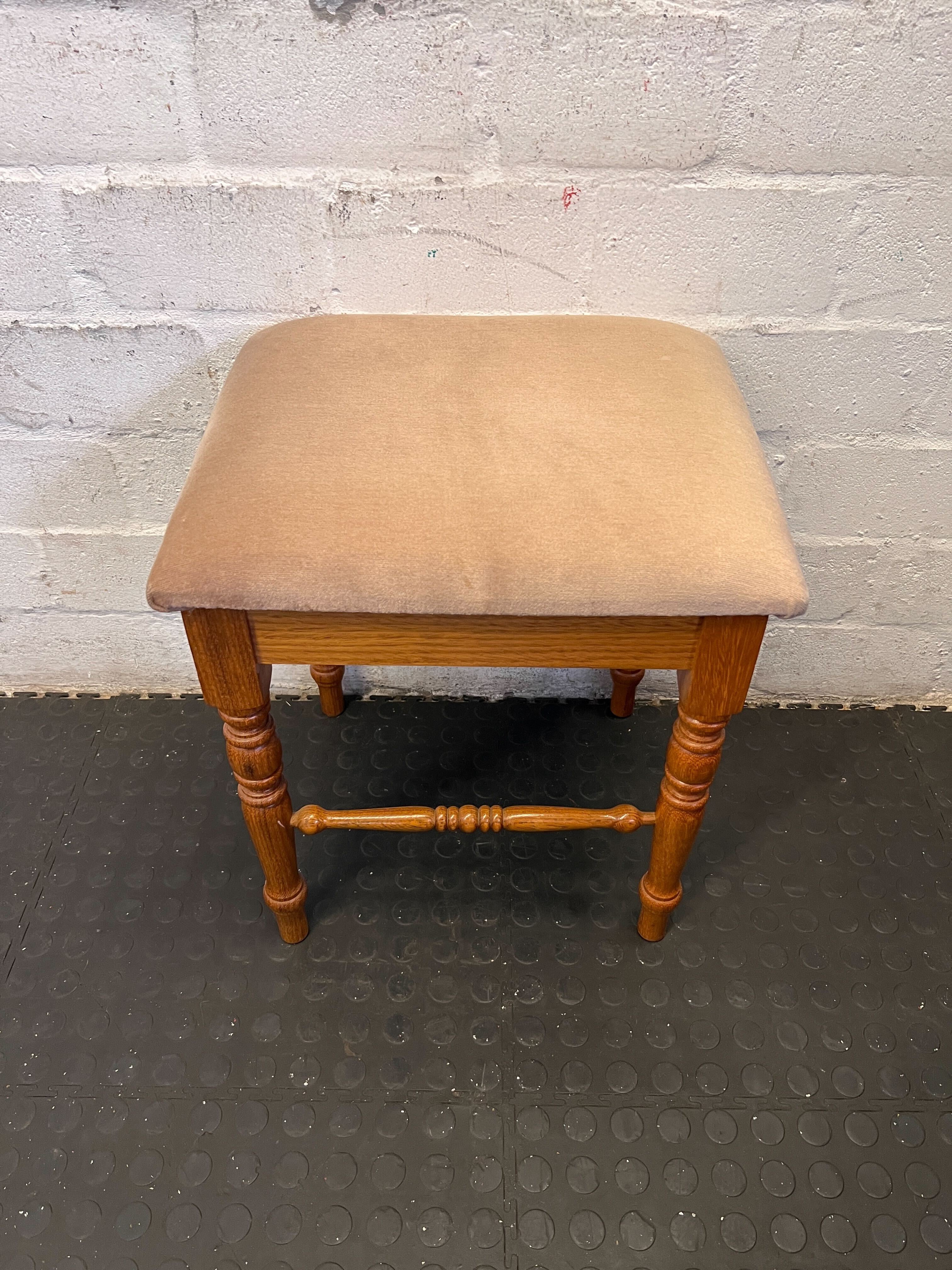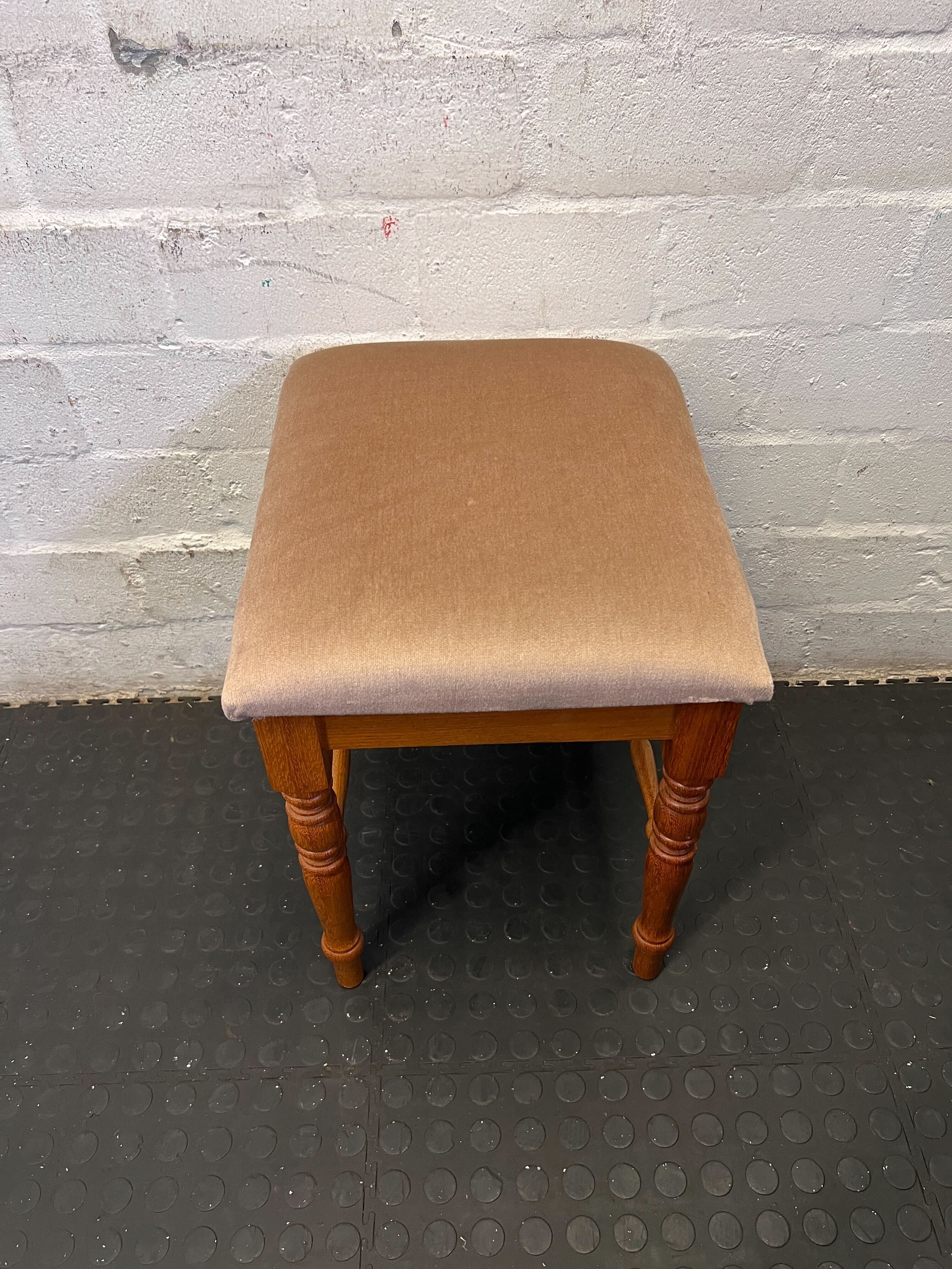 Add a touch of classic charm to your space with this elegant wooden stool! ✨ Featuring beautifully turned legs and a comfortable padded seat upholstered in a soft, inviting fabric, this versatile piece is perfect as a dressing table stool, an accent in your living room, or even a quaint addition to a hallway. Its timeless design blends seamlessly with various decor styles, offering both functionality and aesthetic appeal. 🛋️ This lovely stool provides extra seating or a comfortable spot to rest your feet, making it a delightful addition to any room. This stool is in good second-hand condition with some signs of age-appropriate wear. The sturdy wooden frame shows minor scuffs and marks consistent with its vintage nature. The upholstered velvet-like seat exhibits some subtle discoloration or fading, as visible in the image, but there are no major rips or tears. It is ready to bring its charm into a new home!