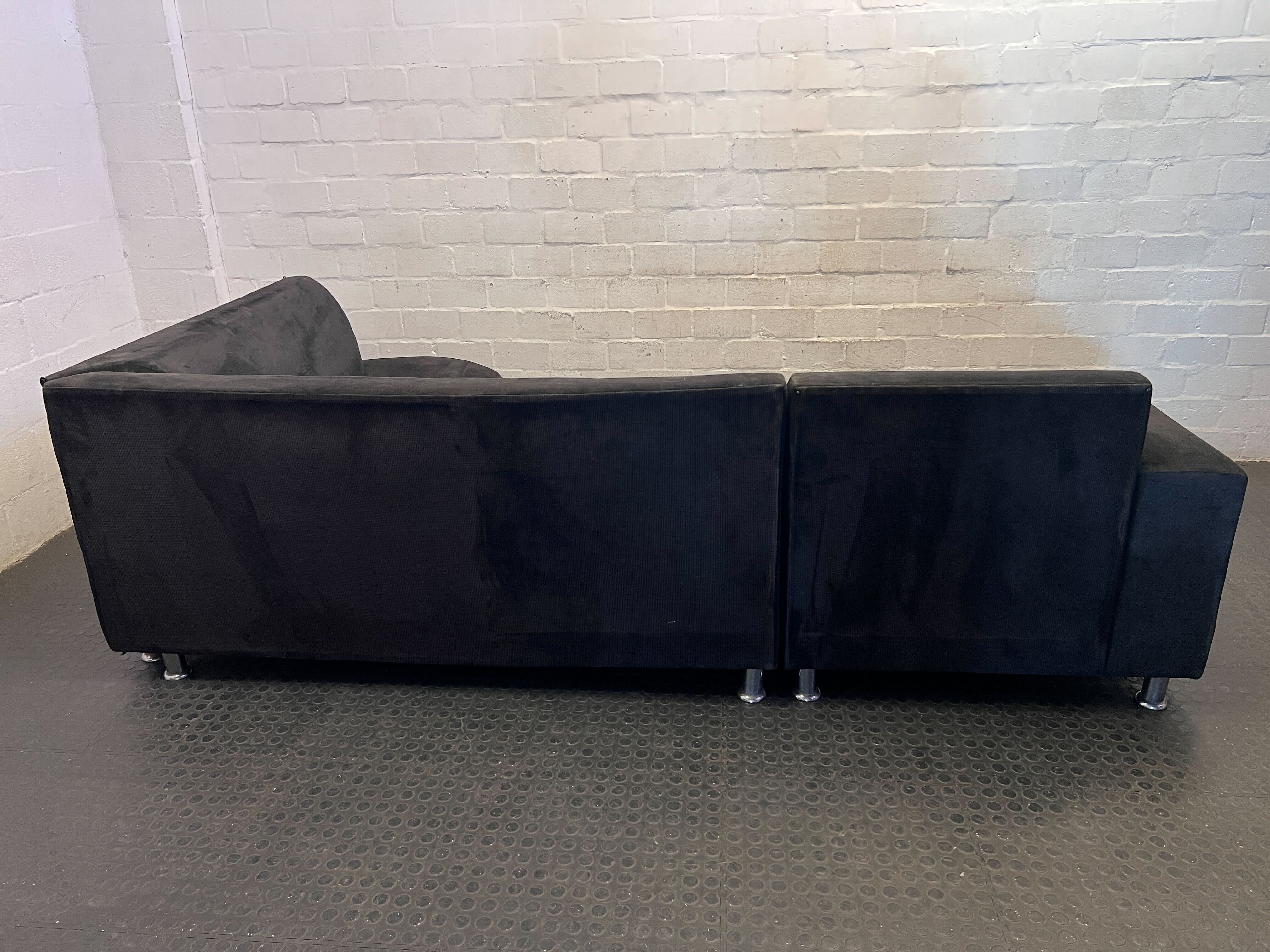 Transform your living space with this sleek and comfortable modern black sectional sofa! ✨ Perfect for creating a cozy corner in your home, this stylish couch features a generous chaise lounge, ideal for stretching out and relaxing after a long day. Its dark, inviting upholstery and contemporary design with chrome-finish feet will effortlessly complement a variety of decor styles, from minimalist to chic industrial. Whether you're hosting guests or enjoying a quiet evening in, this sectional offers ample seating and undeniable comfort. 🛋️💎 This pre-loved sectional sofa is in good overall condition. The dark fabric appears well-maintained with no major rips or tears visible in the image. As expected with a second-hand item, there may be minor signs of general wear consistent with use, such as slight surface rubbing or dust. The chrome feet are intact and contribute to its modern aesthetic. Please refer to the images for a detailed view of its current state.