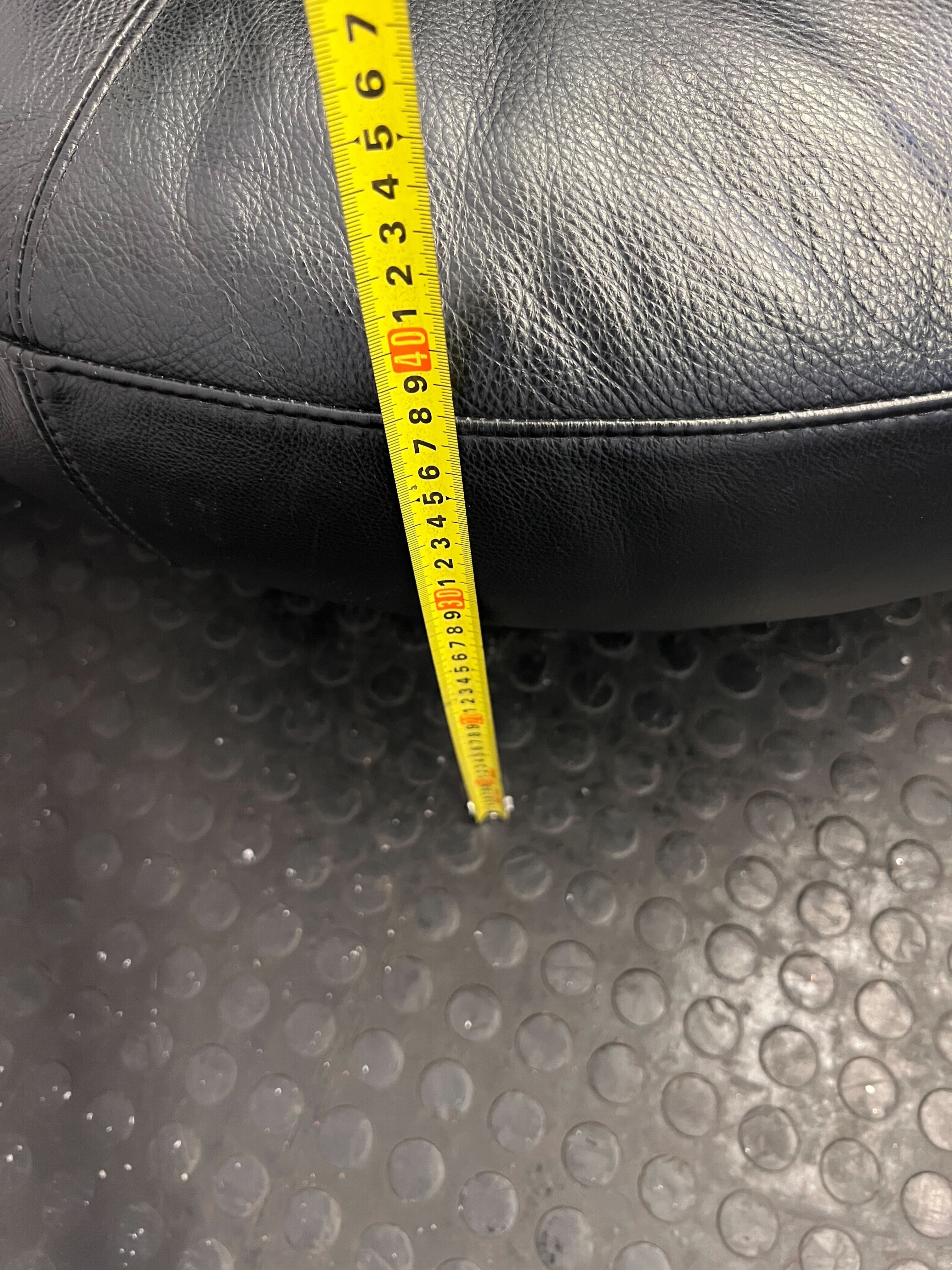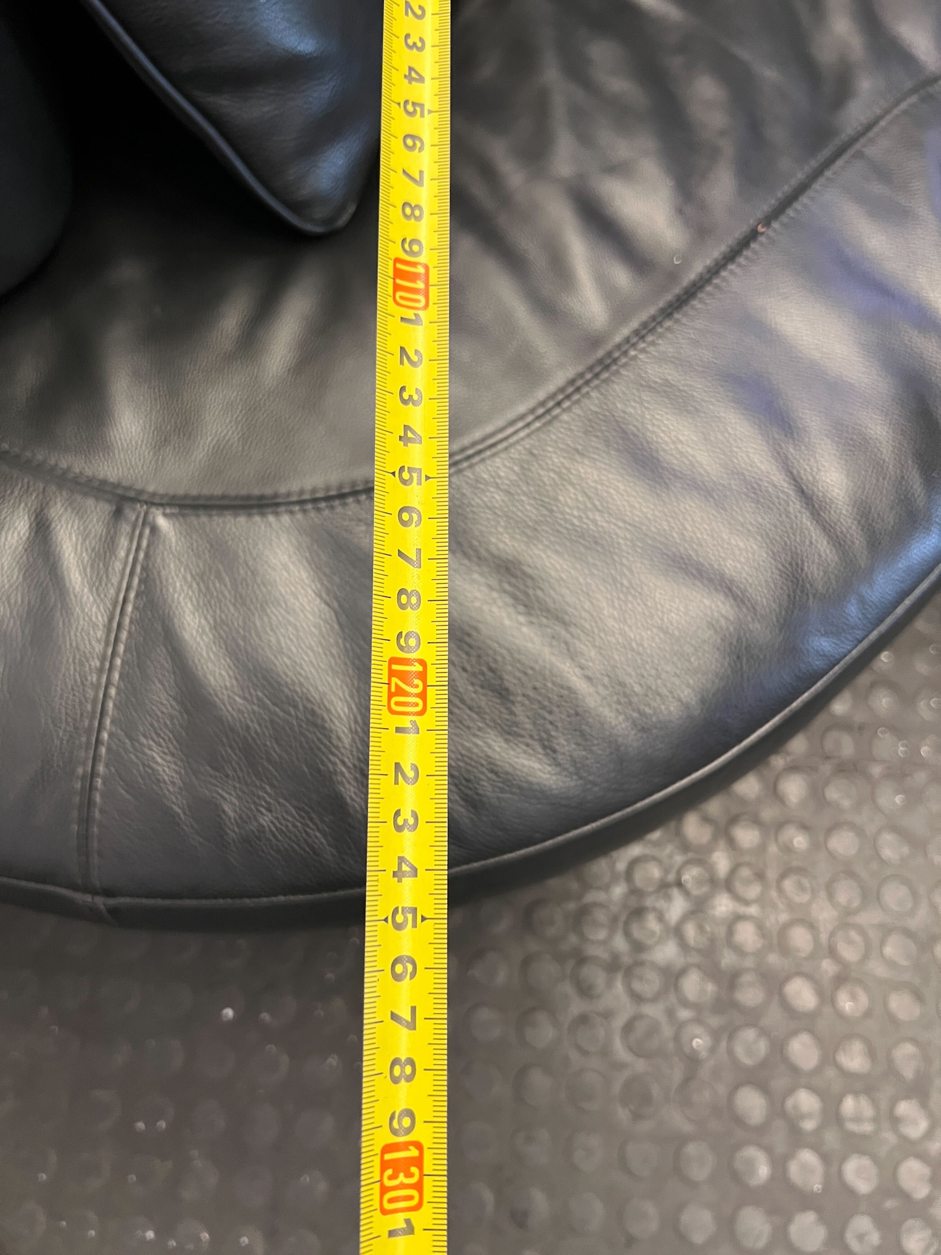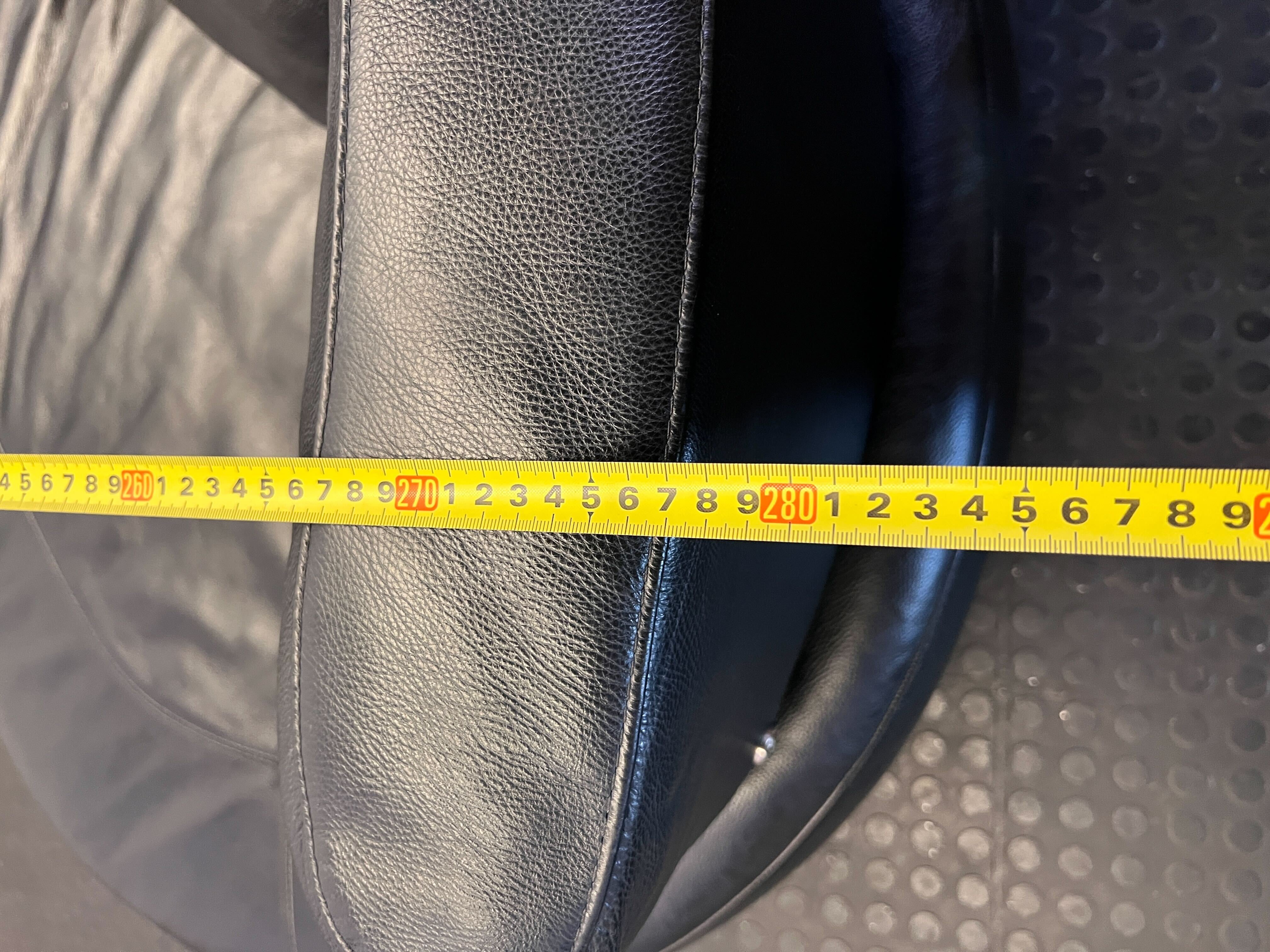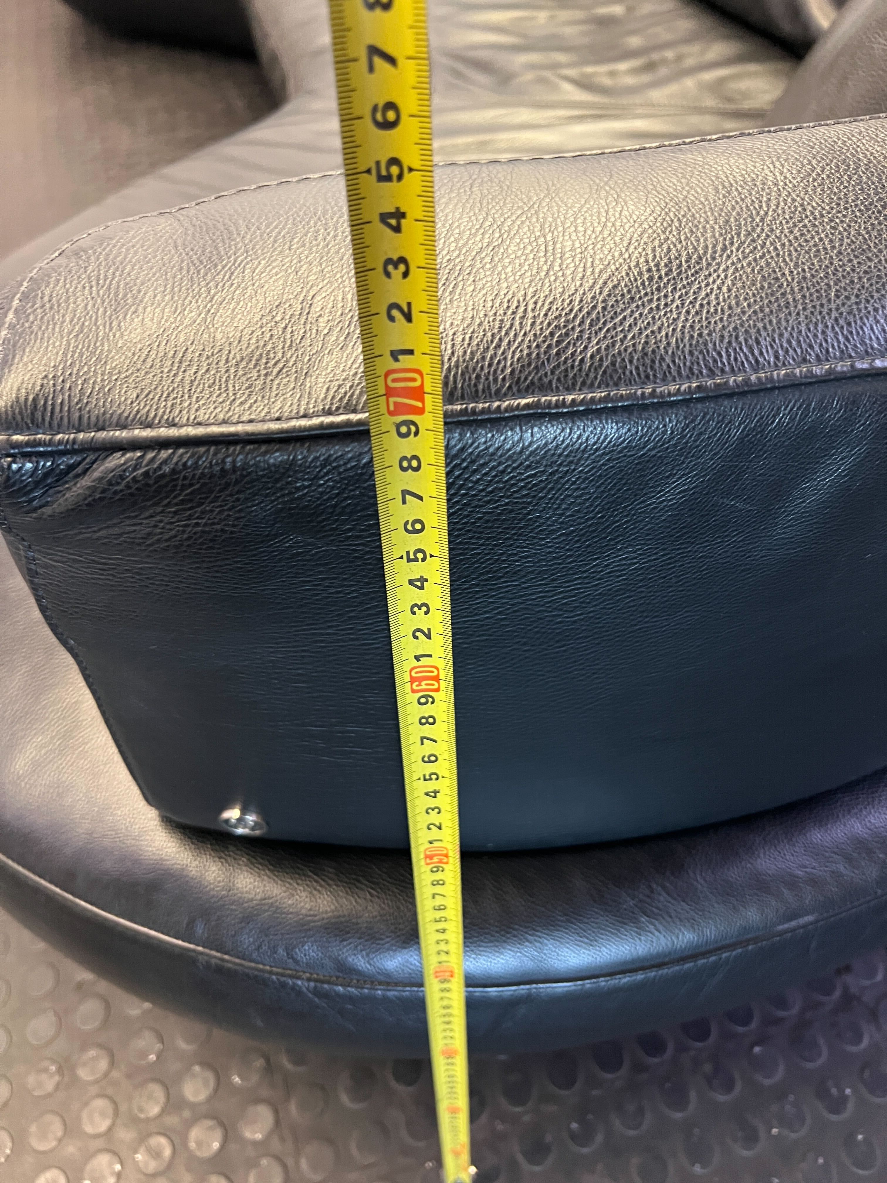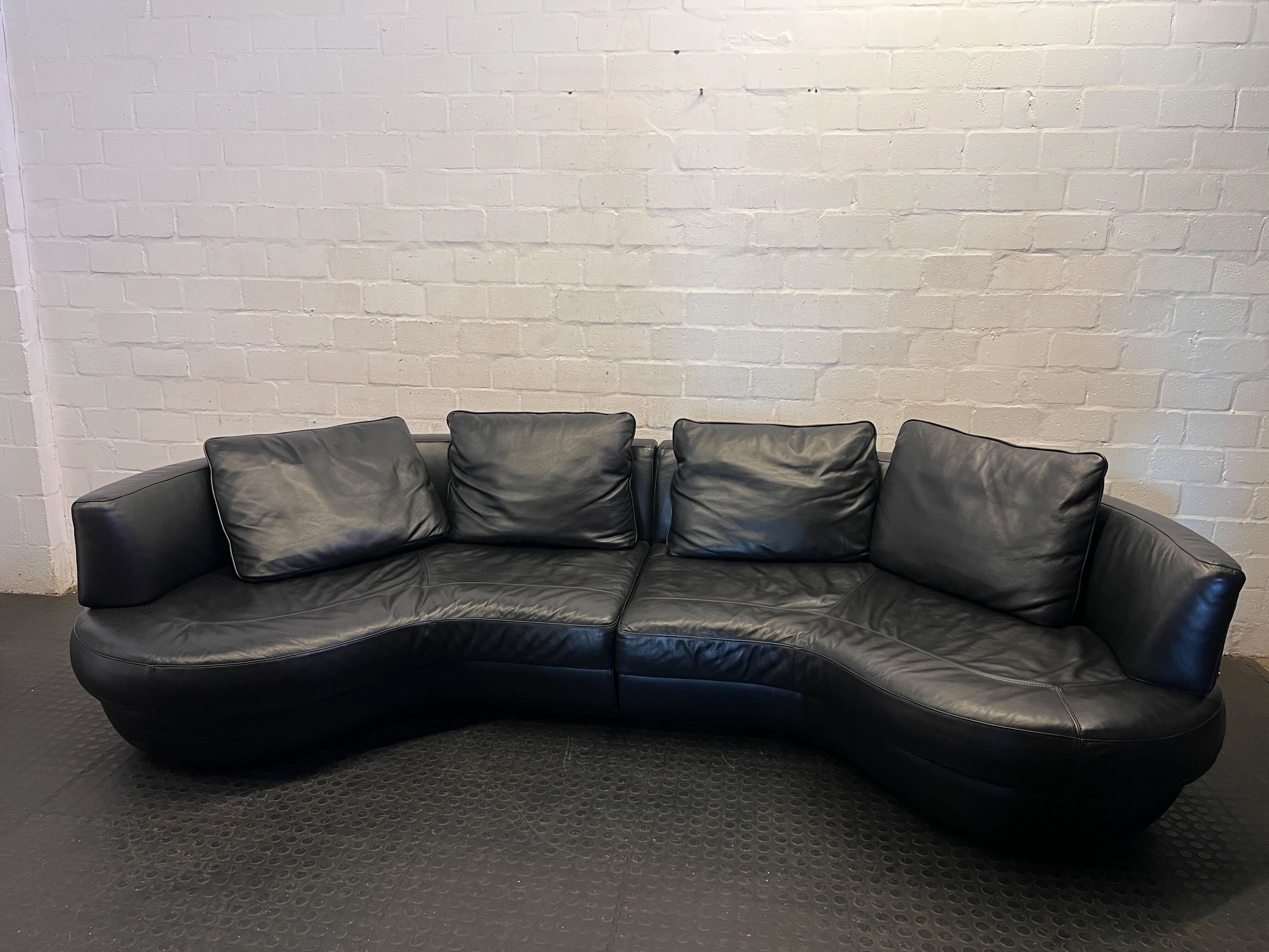 Transform your living space with this striking black leather curved modular sofa! ✨ Its unique, elegant design and smooth, dark leather make it a sophisticated centerpiece for any modern home. Perfect for cozy evenings or entertaining guests, this comfortable couch offers a stylish blend of form and function. Its modular nature suggests flexibility in arrangement, allowing you to adapt it to your space. Imagine unwinding on this chic piece after a long day! 🛋️ This sofa is in good pre-loved condition, showcasing the natural character that comes with a quality leather piece. There is noticeable wear, creasing, and minor scuffing on the leather surfaces, particularly on the seat cushions and armrests, consistent with regular use. These imperfections contribute to its unique vintage charm. Please review all images for a comprehensive view of its current state.