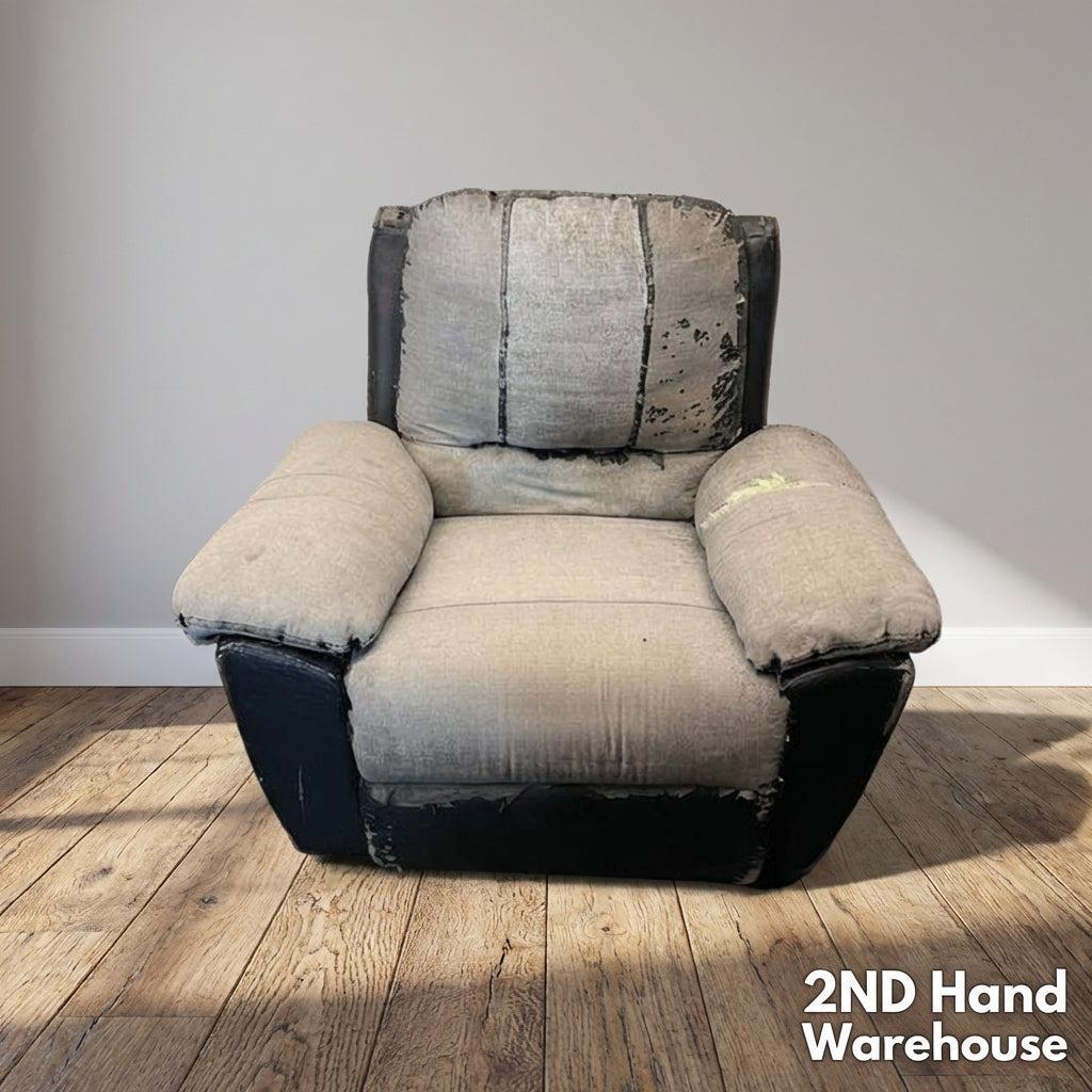 Discover the potential in this cozy armchair, perfect for someone looking to undertake a rewarding furniture restoration project! ✨ With its classic armchair shape, it offers a comfortable base just waiting to be brought back to life. Imagine it reimagined with a vibrant new fabric or a chic slipcover, ready to be the focal point of your reading nook or a stylish addition to any living space. 🛋️ This piece is ideal for DIY enthusiasts, upcyclers, or anyone seeking a budget-friendly option with character. This armchair shows significant signs of wear and tear, making it a true restoration candidate. The light grey fabric upholstery on the seat, backrest, and armrests is faded and shows discoloration and some visible marks, with minor fraying and small tears on the armrests. The dark faux leather on the sides and base is heavily peeled and cracked in multiple areas, revealing the underlying material. Structurally, it appears sound, but cosmetic revitalization is definitely required.