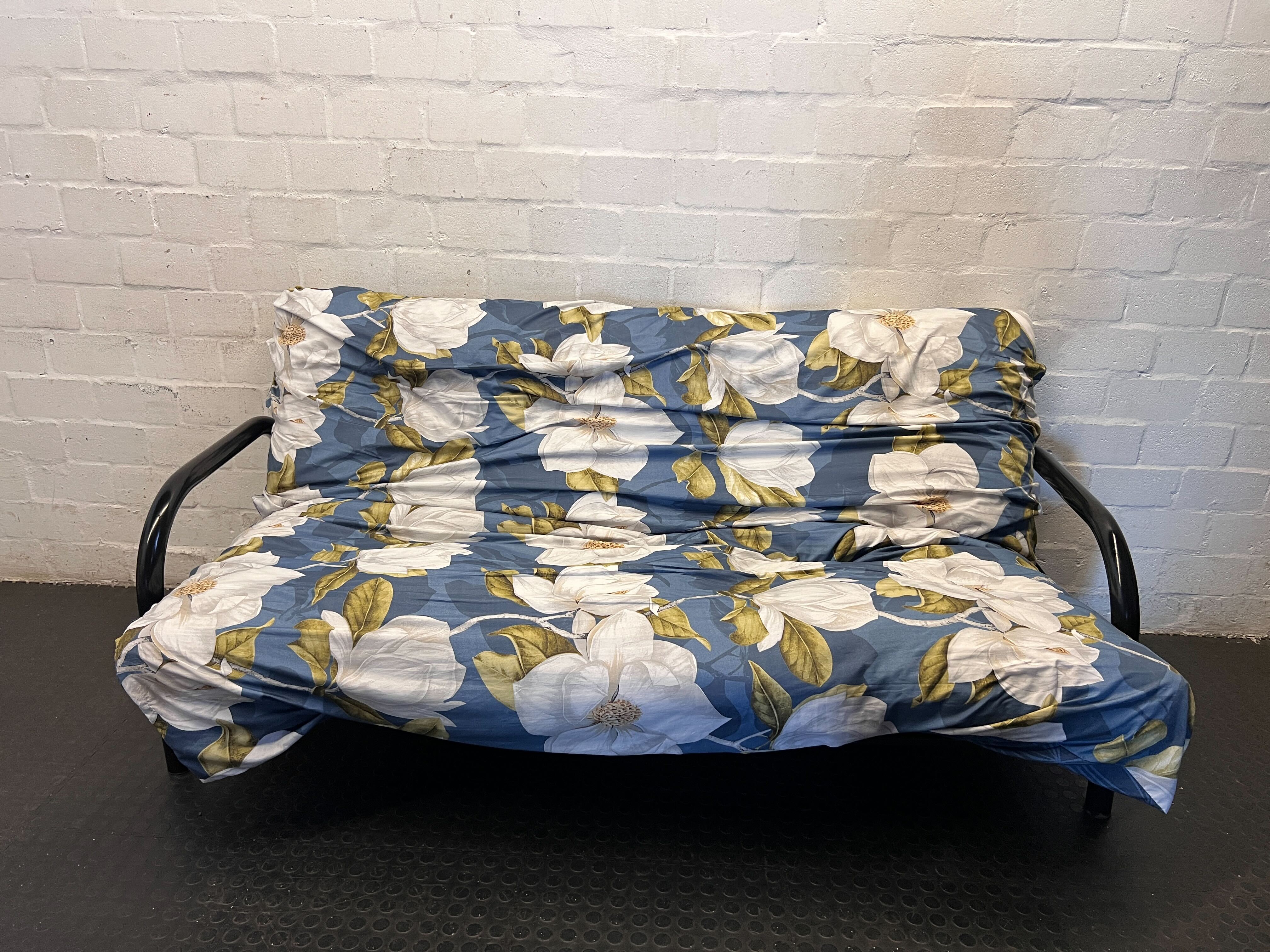 Add a touch of floral elegance to your space with this charming futon sofa! 🛋️ Perfect for compact living areas, guest rooms, or even a sunroom, this 2-seater couch features a lovely blue slipcover adorned with vibrant white magnolia flowers and green leaves. It's a versatile piece that can easily transform to suit your needs, offering both comfortable seating and a cozy spot for an overnight guest. Bring a fresh, inviting vibe into your home with this delightful and practical sofa. ✨The futon is in good second-hand condition. The floral slipcover is present and offers a beautiful aesthetic, though it shows some wrinkles and general signs of use consistent with a pre-loved item. The black metal frame appears sturdy, ready for many more years of use. Please note the slipcover's slightly rumpled appearance as seen in the images.