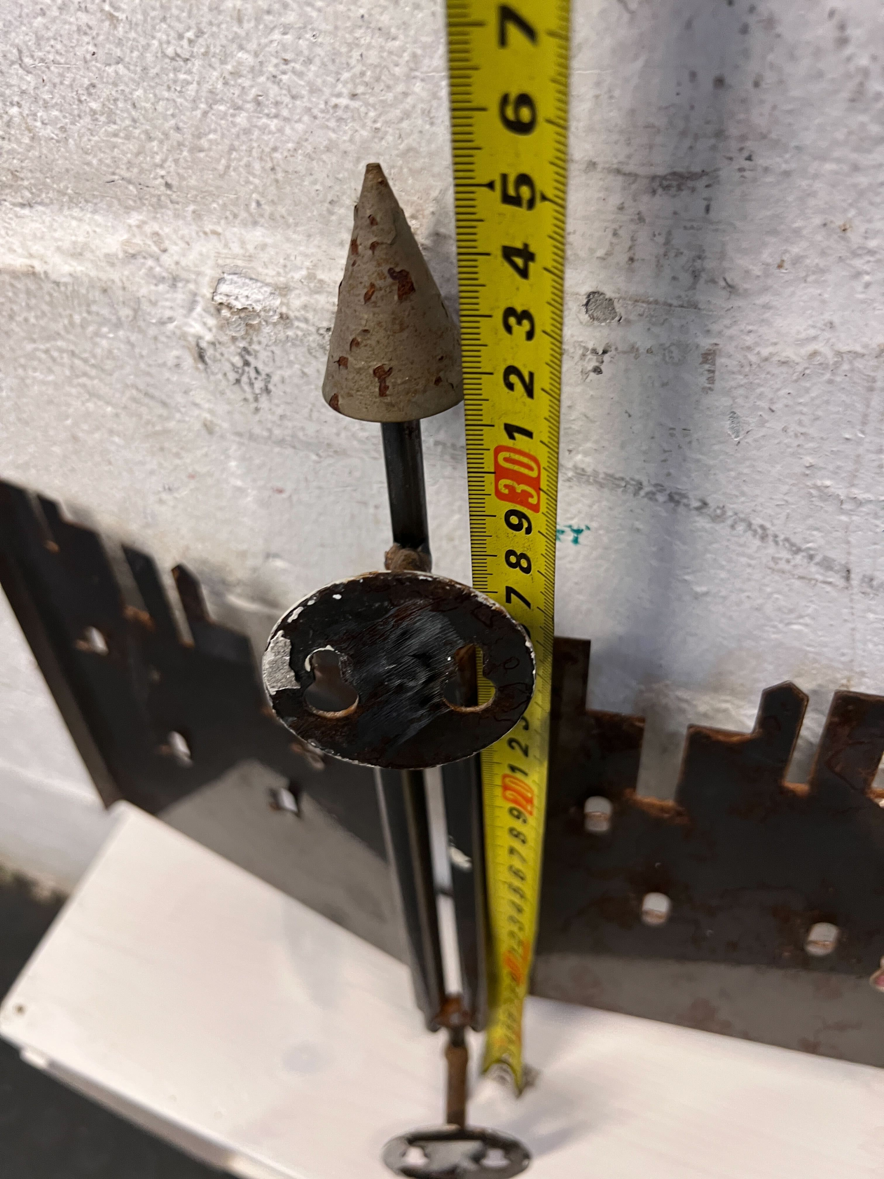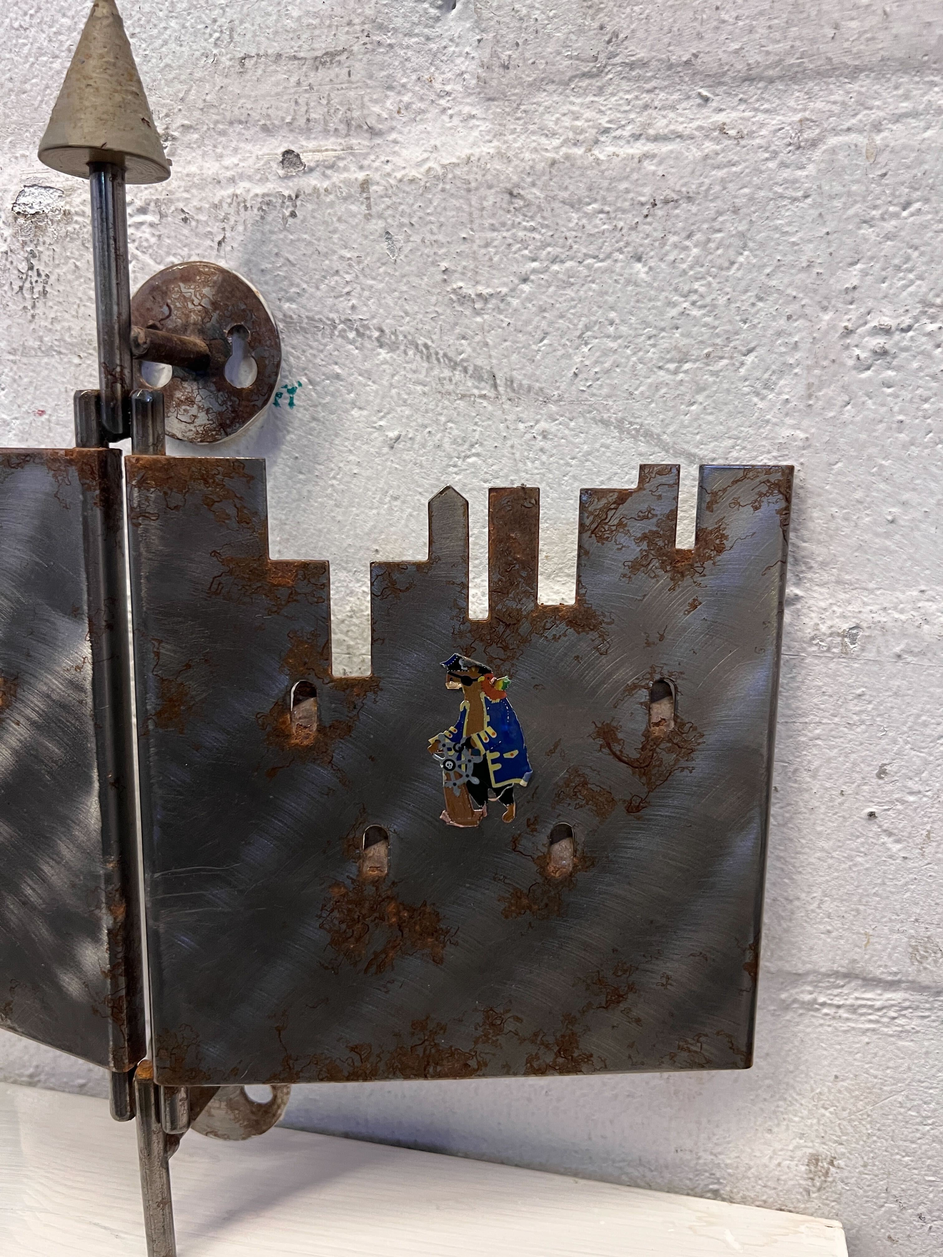 Add a touch of medieval charm or industrial chic to your home with this unique metal castle-inspired piece! ✨ Crafted from durable metal with a distinctive distressed finish, it features a striking silhouette reminiscent of a fortress, complete with battlements and a pointed finial. Whether used as an eye-catching wall decoration, a functional key holder with its multiple hooks, or simply a standalone art piece, it promises to be a conversation starter. Perfect for entryways, living rooms, or any space needing a dash of character. 🏰 This piece embraces its rustic aesthetic with intentional distressed metalwork, including visible surface rust and scratches, which contribute to its antique and industrial appeal. All components appear intact and sturdy, consistent with its design. The small colorful emblem is attached securely. Please review all images to appreciate its unique patina. 🛠️