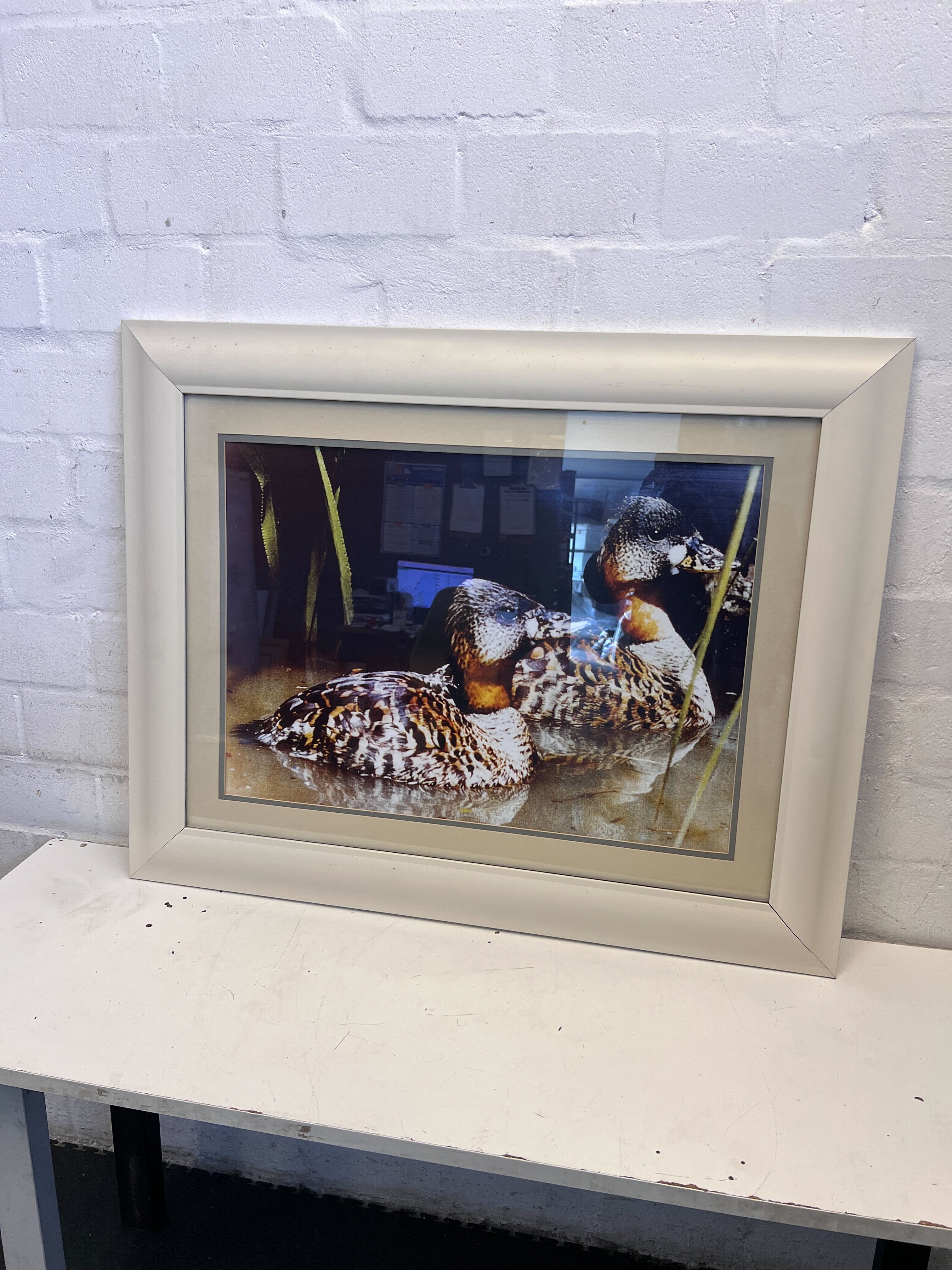 A55952 This charming framed art print features serene ducks in their natural habitat, beautifully captured in vibrant colors. Set in an elegant white frame, this piece adds a touch of nature to your décor. While it shows minor scuffs, it remains a lovely addition to any living room or office space, sparking joy and conversation. Bring nature indoors today! 🦆🧡 HASHTAGS: #ArtPrint #FramedArt #HomeDecor #2ndHandWarehouse