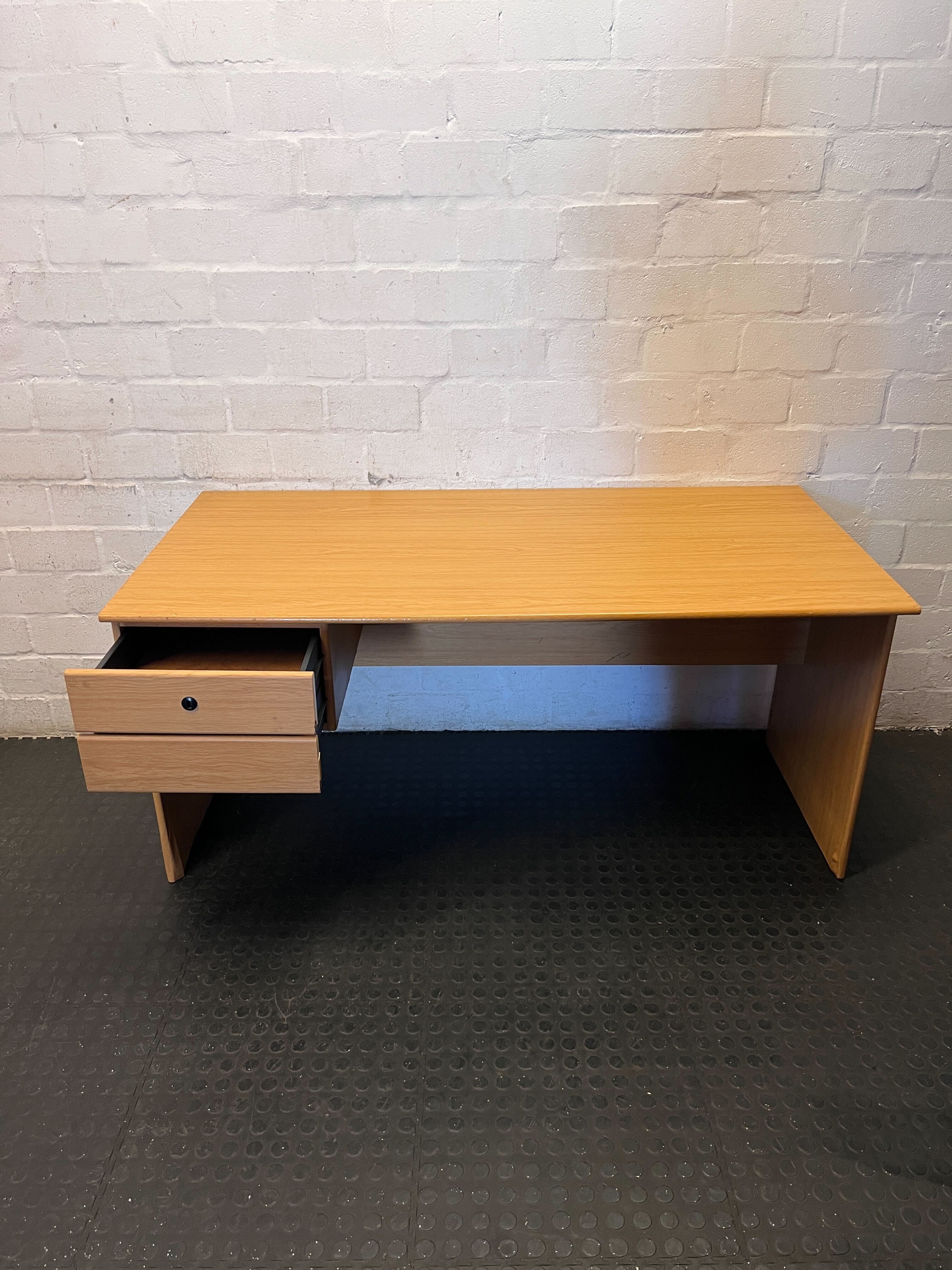 Spruce up your workspace with this versatile and functional light wood desk! ✨ Perfect for a home office, student study area, or even a craft corner, this desk offers a generous surface for all your tasks. The integrated two-drawer unit on the left provides convenient storage for your essentials, helping you keep your workspace tidy and organized. Its clean lines and neutral tone will blend seamlessly with various decor styles, offering both practicality and a touch of modern simplicity. This desk is in good second-hand condition. As expected with pre-loved furniture, there may be minor superficial signs of wear consistent with normal use, such as small scratches or scuffs on the surface or edges. No major damage or structural issues are apparent from the image, making it ready for its next chapter!