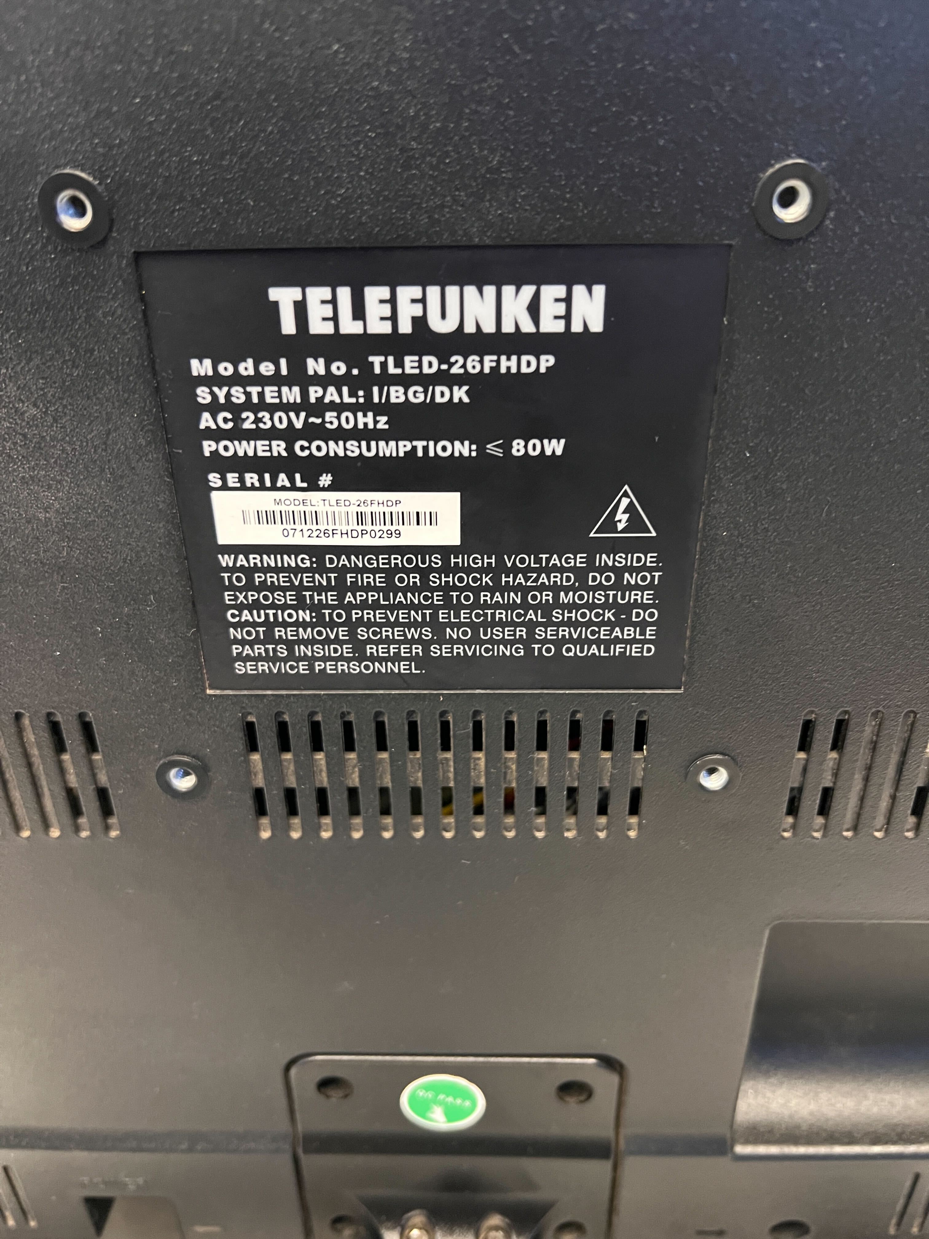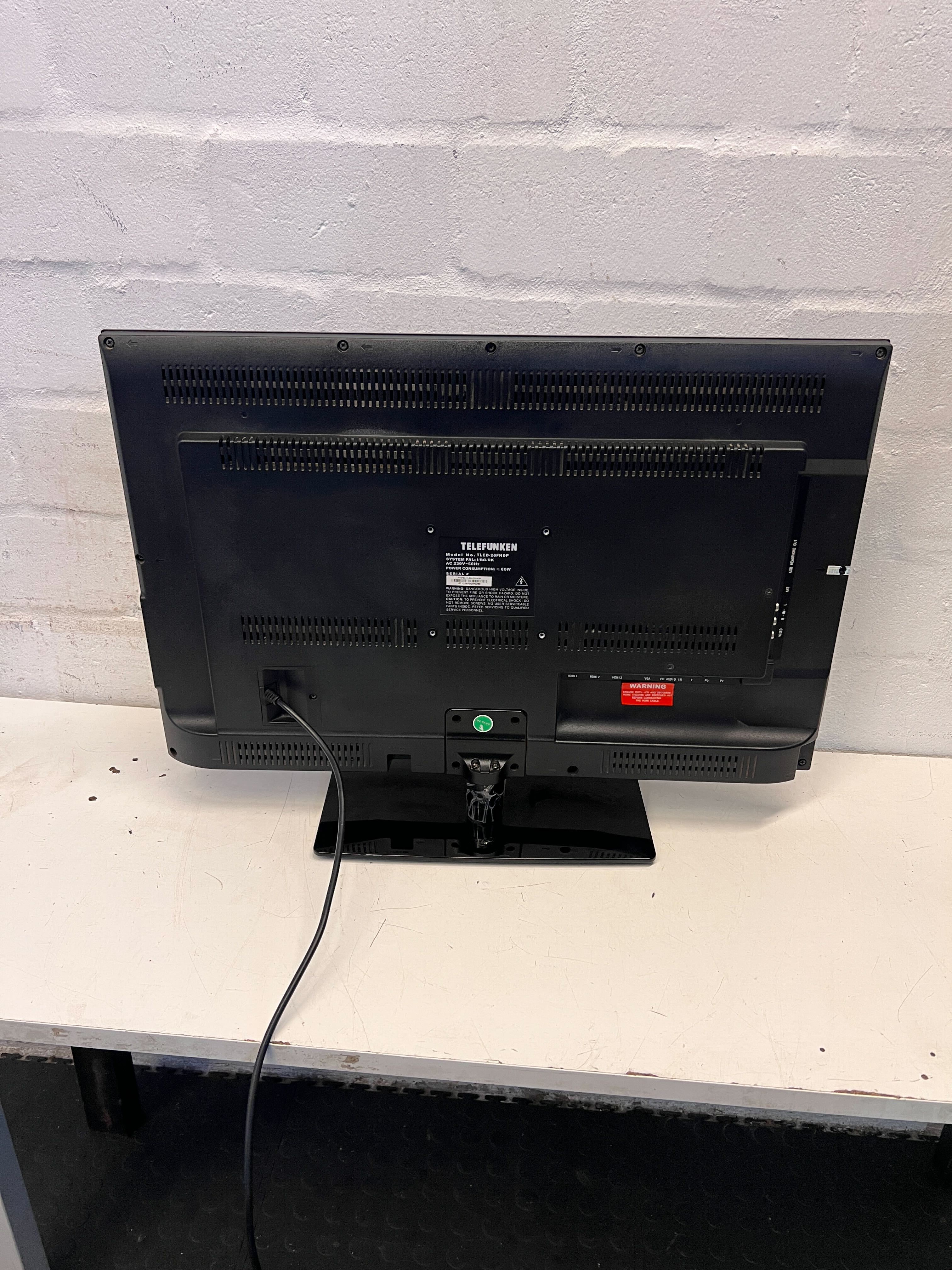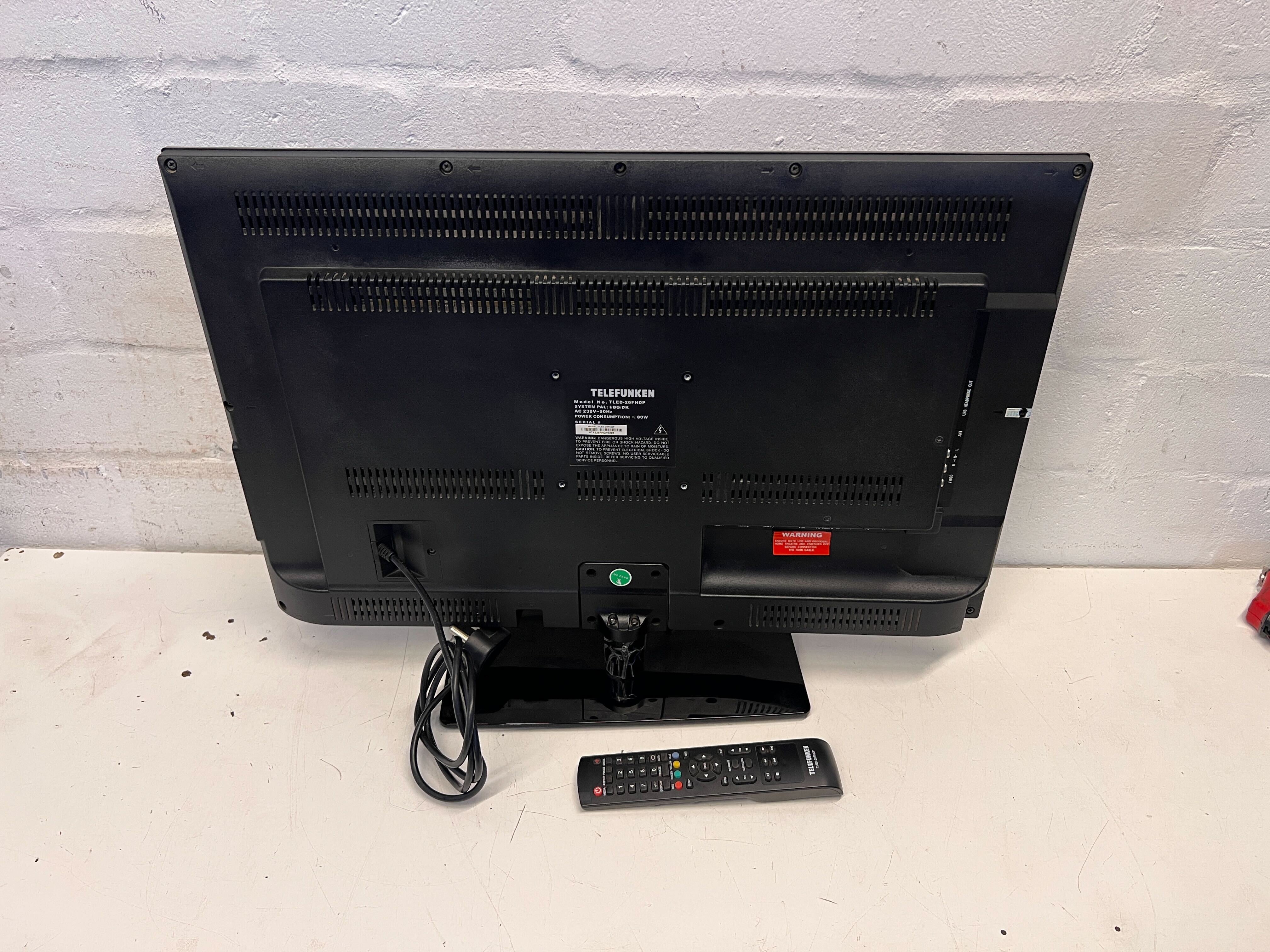 A54819 This sleek 26-inch Telefunken LED TV offers vibrant picture quality and a stylish black finish, making it an excellent addition to your living space. Despite a minor scratch on the frame, it's in good condition and ready for your movie nights or gaming sessions! Bring home this fantastic entertainment piece today! 📺🧡 HASHTAGS: #TelefunkenTV #SecondHandElectronics #AffordableTV #2ndHandWarehouse