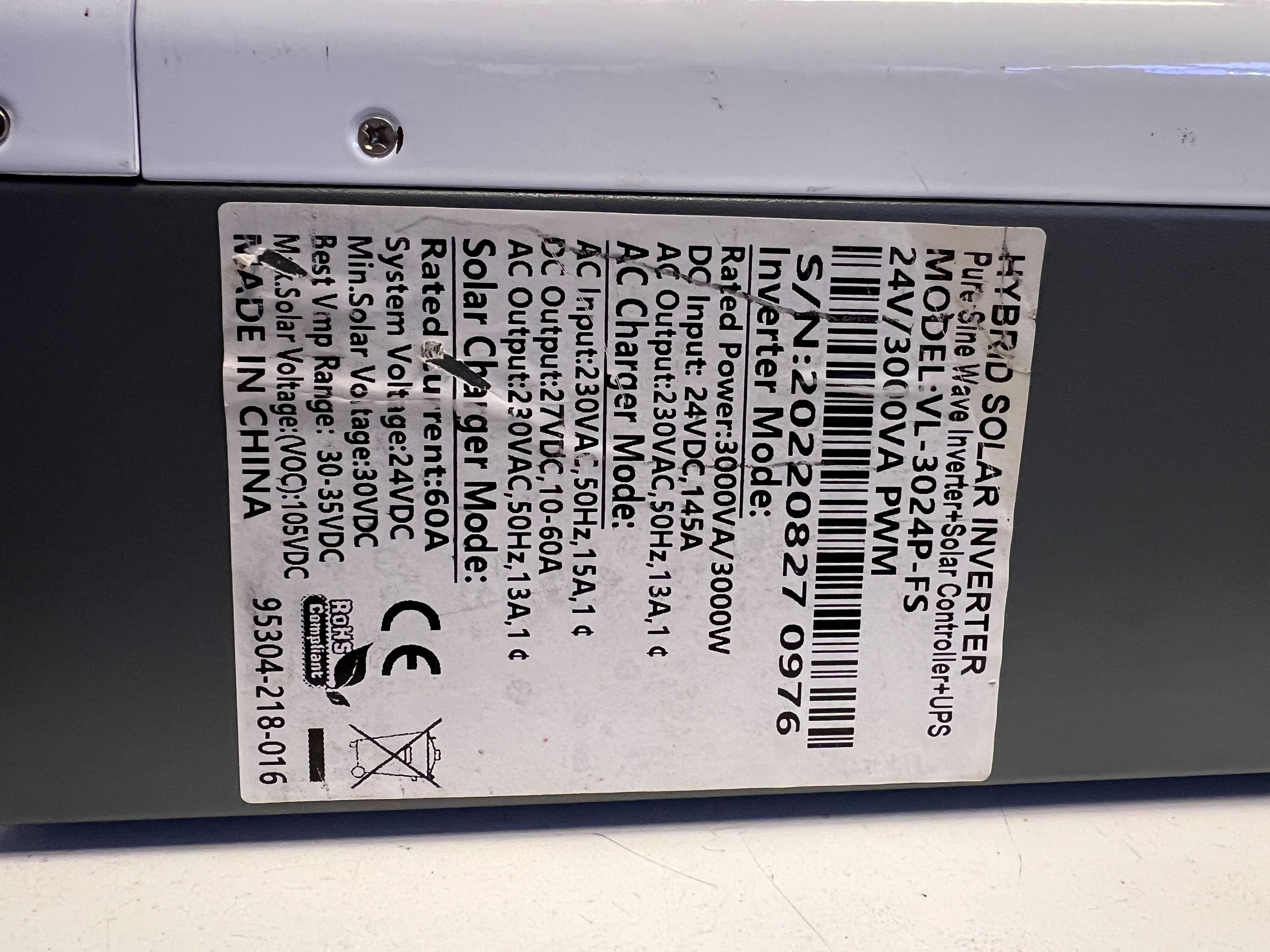 🔌Fivestar VL-3024P-FS hybrid inverter —24 V / 3000 VA (3000 W) pure sine, 230 V AC input/output, 50 Hz