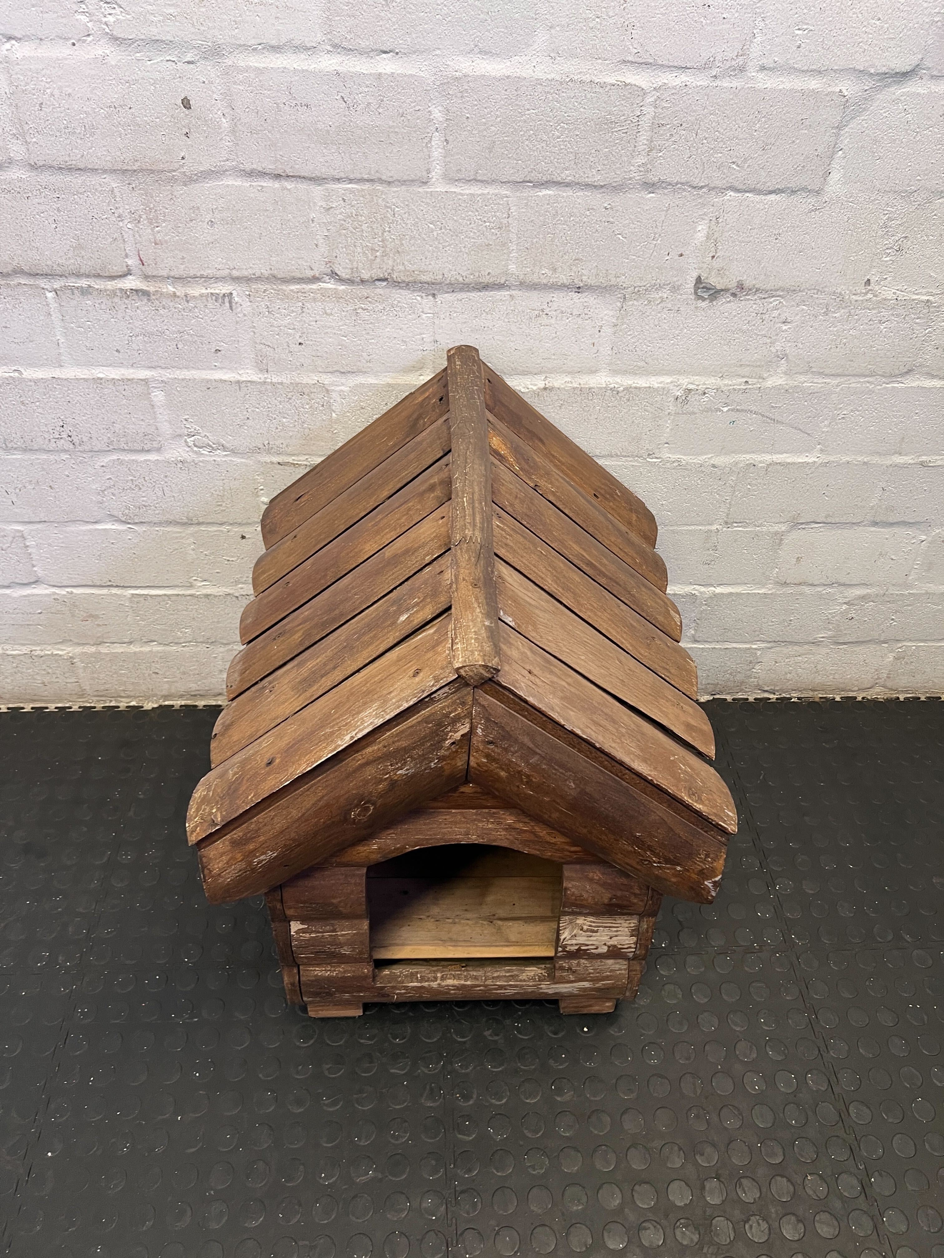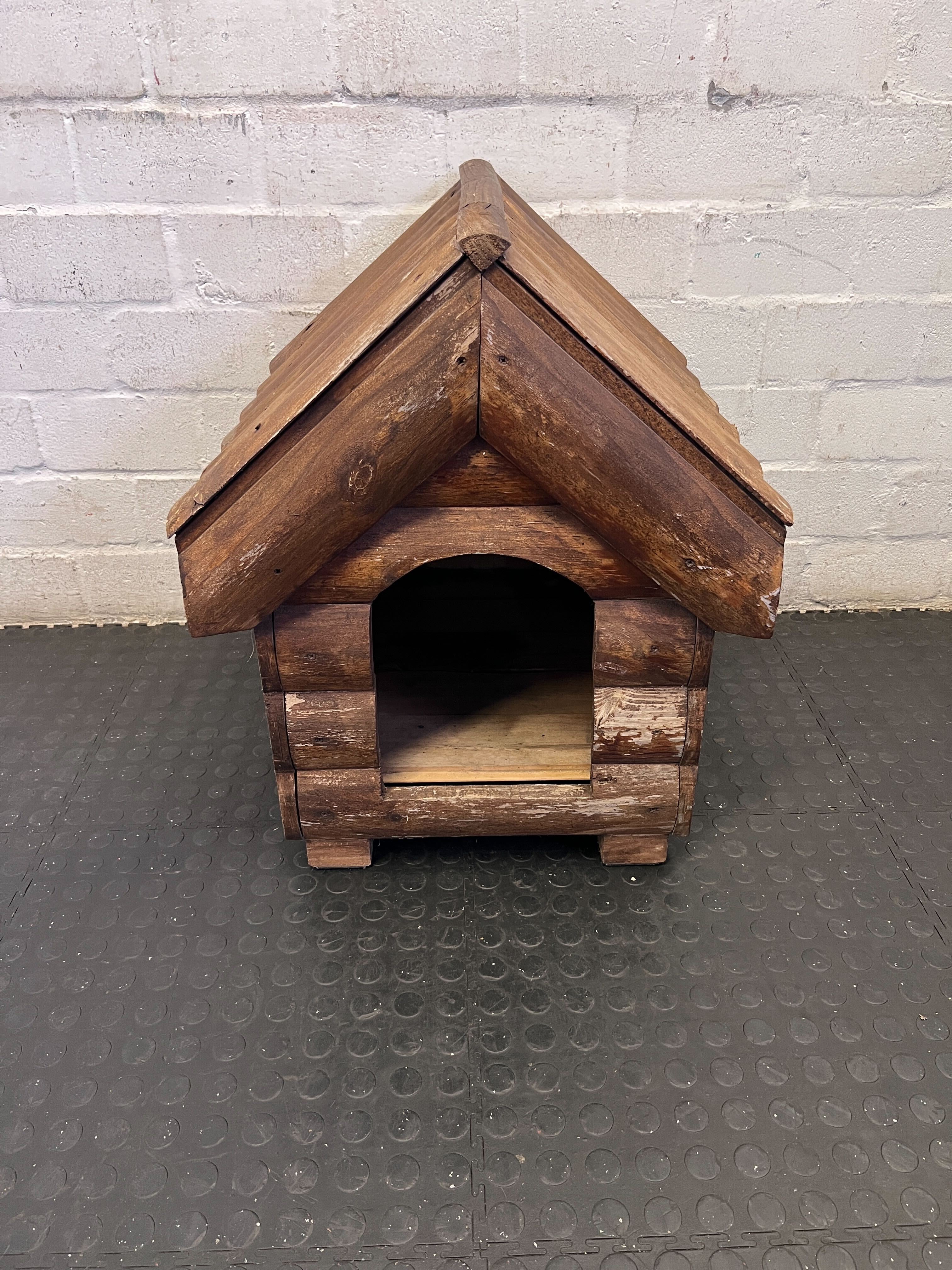 Give your furry friend a cozy and stylish retreat with this charming rustic wooden dog house! 🐶 Crafted in a classic log cabin style, it provides a comfortable shelter for your beloved pet, whether in your garden, patio, or even indoors as a designated den. Its natural wood aesthetic blends beautifully with outdoor settings, offering both comfort and a touch of rustic charm to your home. ✨ This pre-loved dog house is in good, used condition. As visible in the images, there are signs of natural wear and tear consistent with its age and use. This includes some fading and chipping of the wood stain on the exterior logs and edges, giving it a weathered, rustic look. The interior is clean and intact. Overall, it's structurally sound and ready for its next occupant!