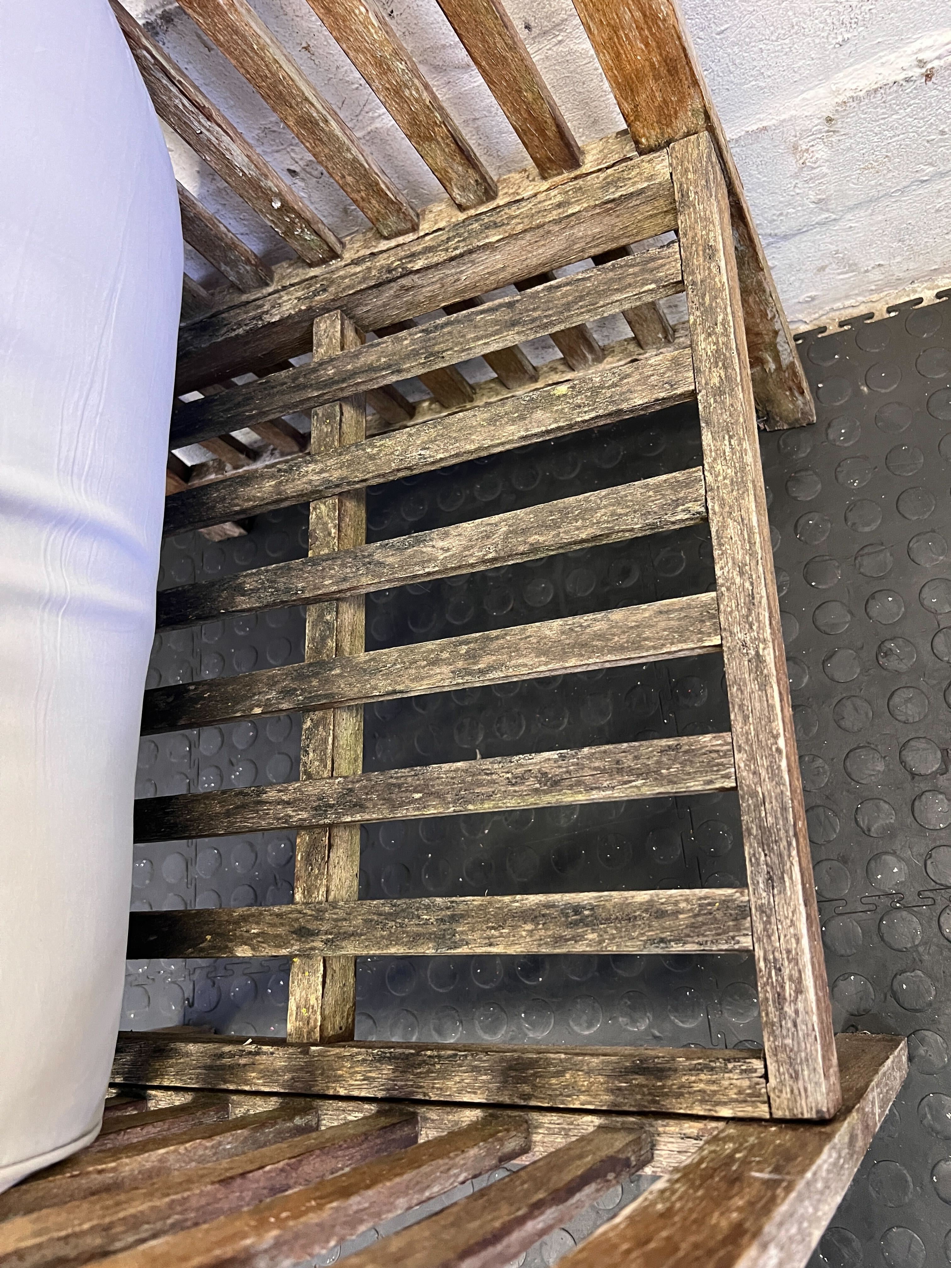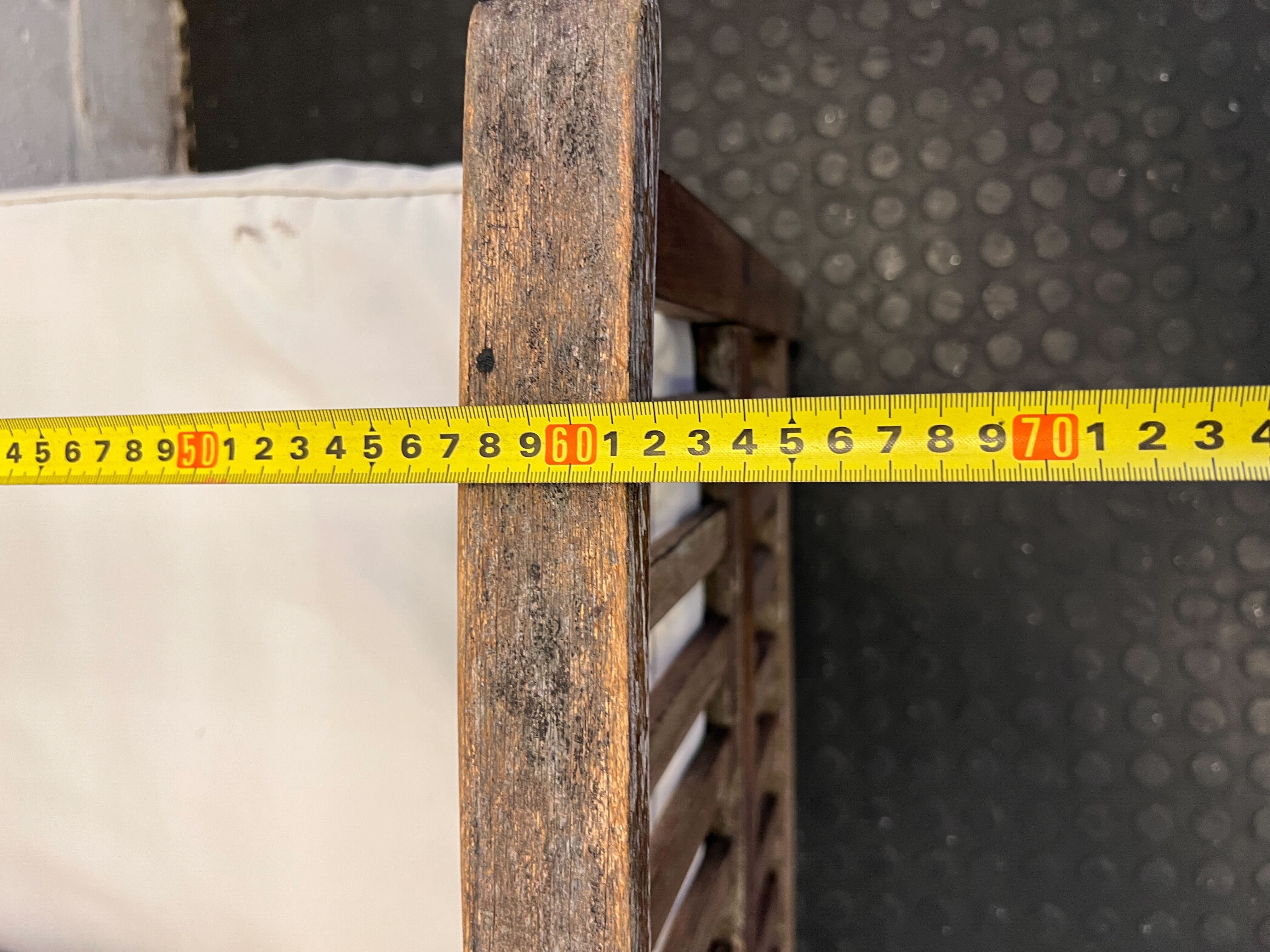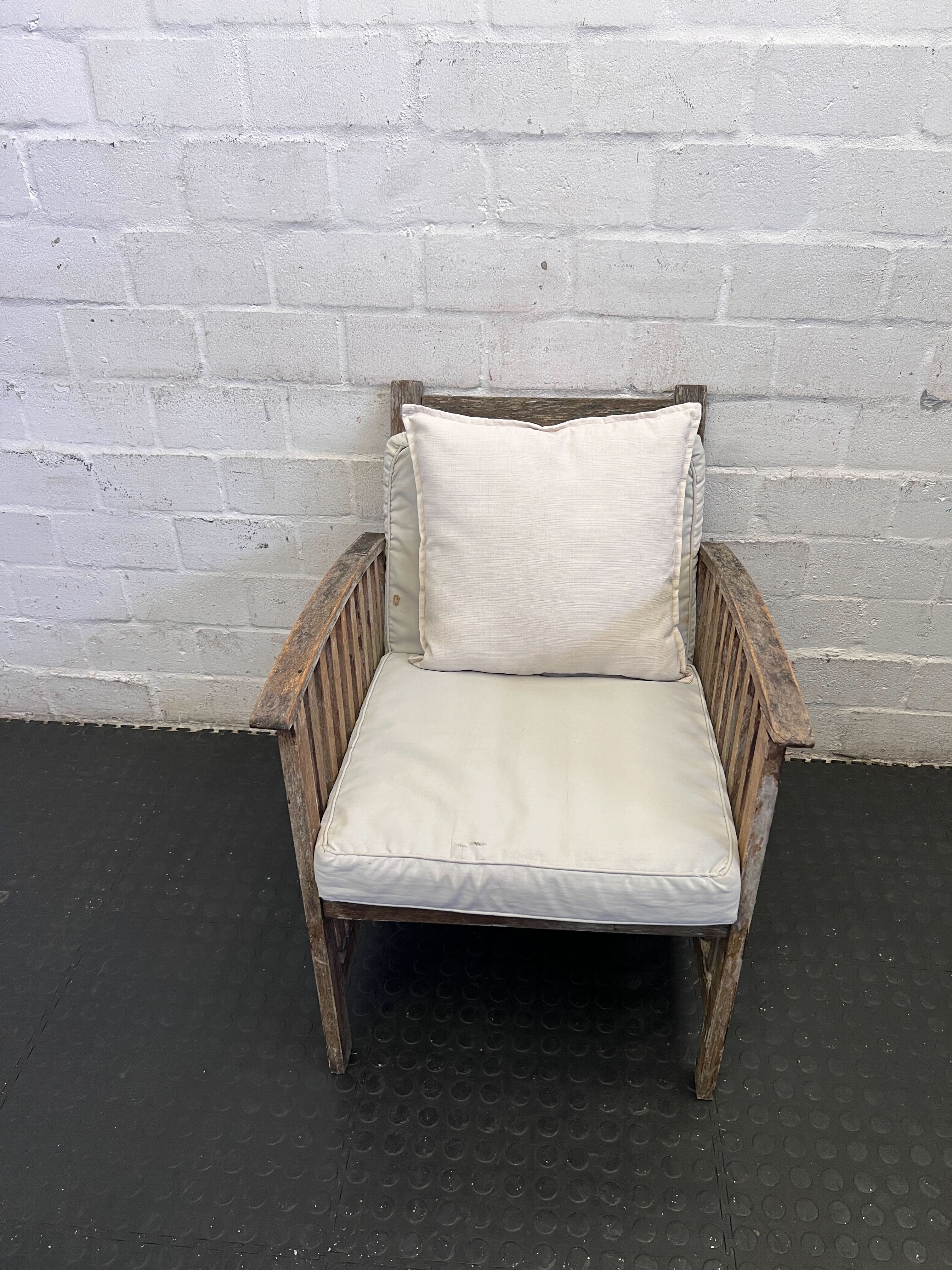 Add a touch of timeless elegance and comfort to your space with this lovely rustic wooden armchair. Perfect for a cozy reading nook, a sunny patio corner, or as a charming addition to your living room, it brings a warm, inviting feel wherever it's placed. The sturdy wooden frame is complemented by plush, cream-colored cushions, offering a delightful spot to relax. Imagine sipping your morning coffee or unwinding after a long day in this inviting seat! ✨🛋️ This armchair is pre-loved and shows signs of its journey, which only adds to its character. The wooden frame has a beautifully weathered appearance with some natural wear, scratches, and fading consistent with age and use, enhancing its rustic charm. The cream cushions are in good overall condition but show some minor marks and slight discoloration from previous use, as visible in the images. Despite these cosmetic imperfections, the chair is structurally sound and ready to offer comfort for years to come.