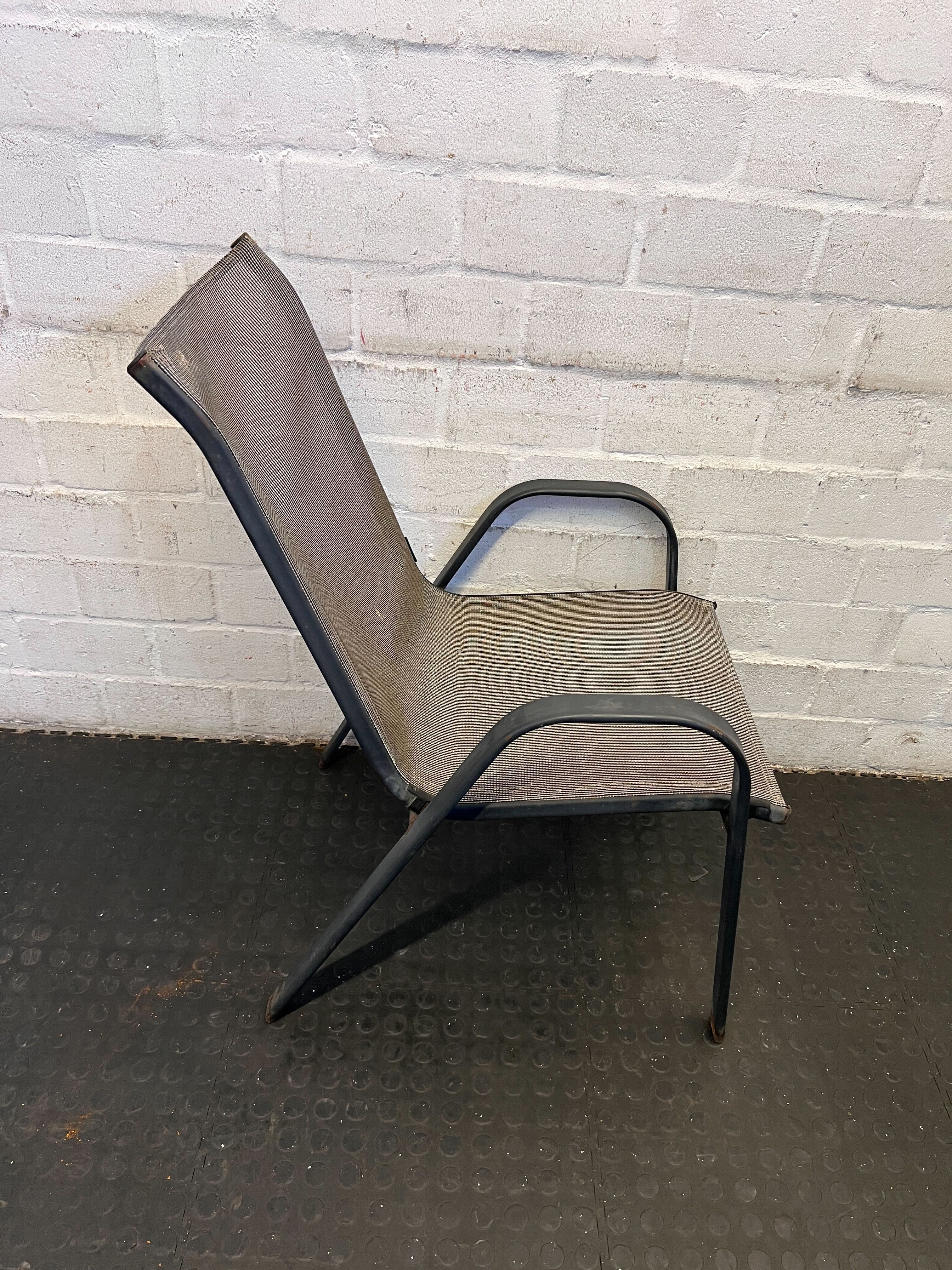 A53708 This practical black metal outdoor chair features a comfortable mesh seat, perfect for lounging on your patio or balcony. It showcases a minimalist design, ideal for modern or rustic settings, but does have some minor rust spots that add to its charm. Imagine enjoying a sunny day while sipping your favorite beverage—this chair will enhance your outdoor experience! ☀️🧡 HASHTAGS: #OutdoorChair #SecondHandFurniture #CapeTown #2ndHandWarehouse