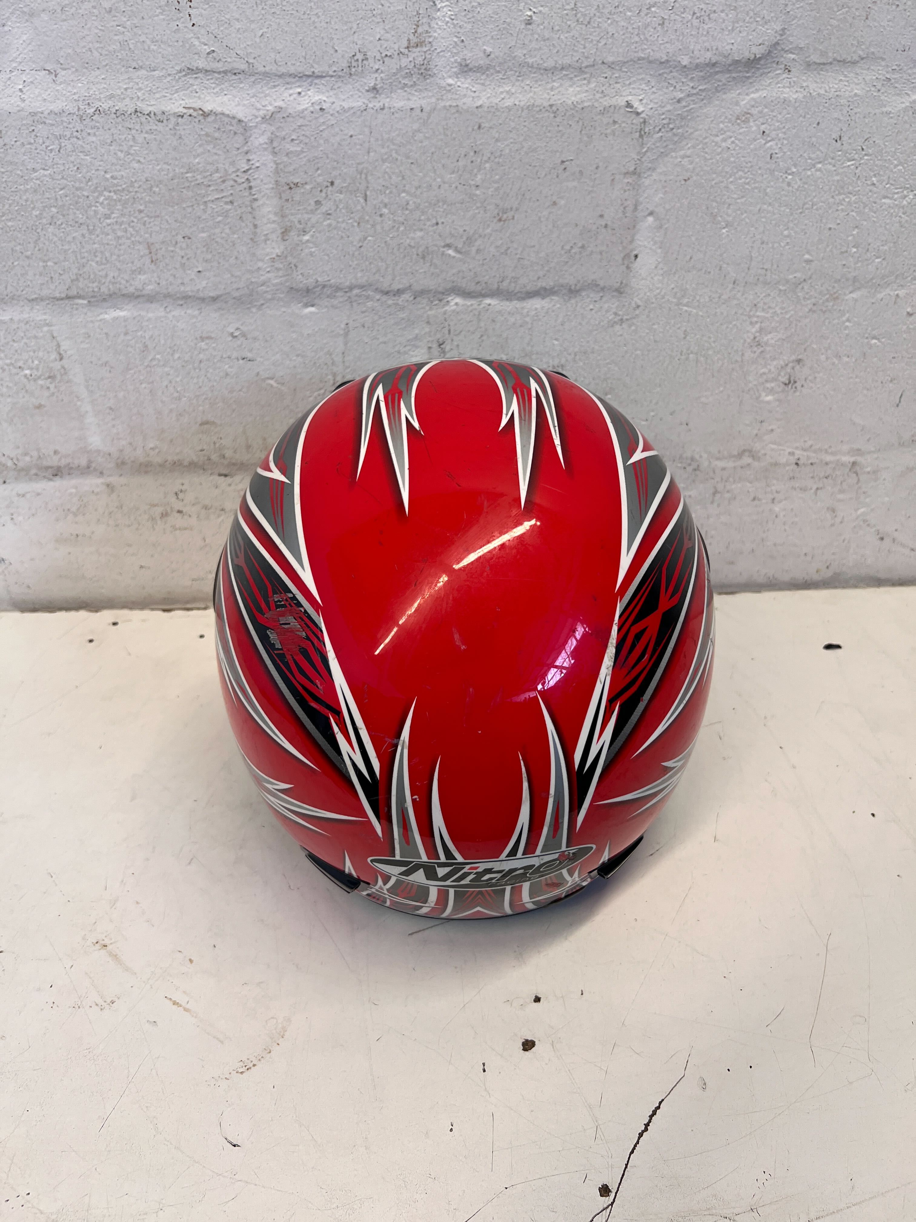 A56409 Hit the road in style and safety with this eye-catching Nitro Racing Motorcycle Helmet! 🏍️ Featuring a dynamic red, black, and white graphic design, this full-face helmet combines bold aesthetics with essential protection. Perfect for motorcycle enthusiasts looking for a distinctive look and reliable gear for their rides, whether cruising or racing.#NitroHelmet #MotorcycleGear #RacingHelmet #FullFaceHelmet #2ndhandwarehous🧡