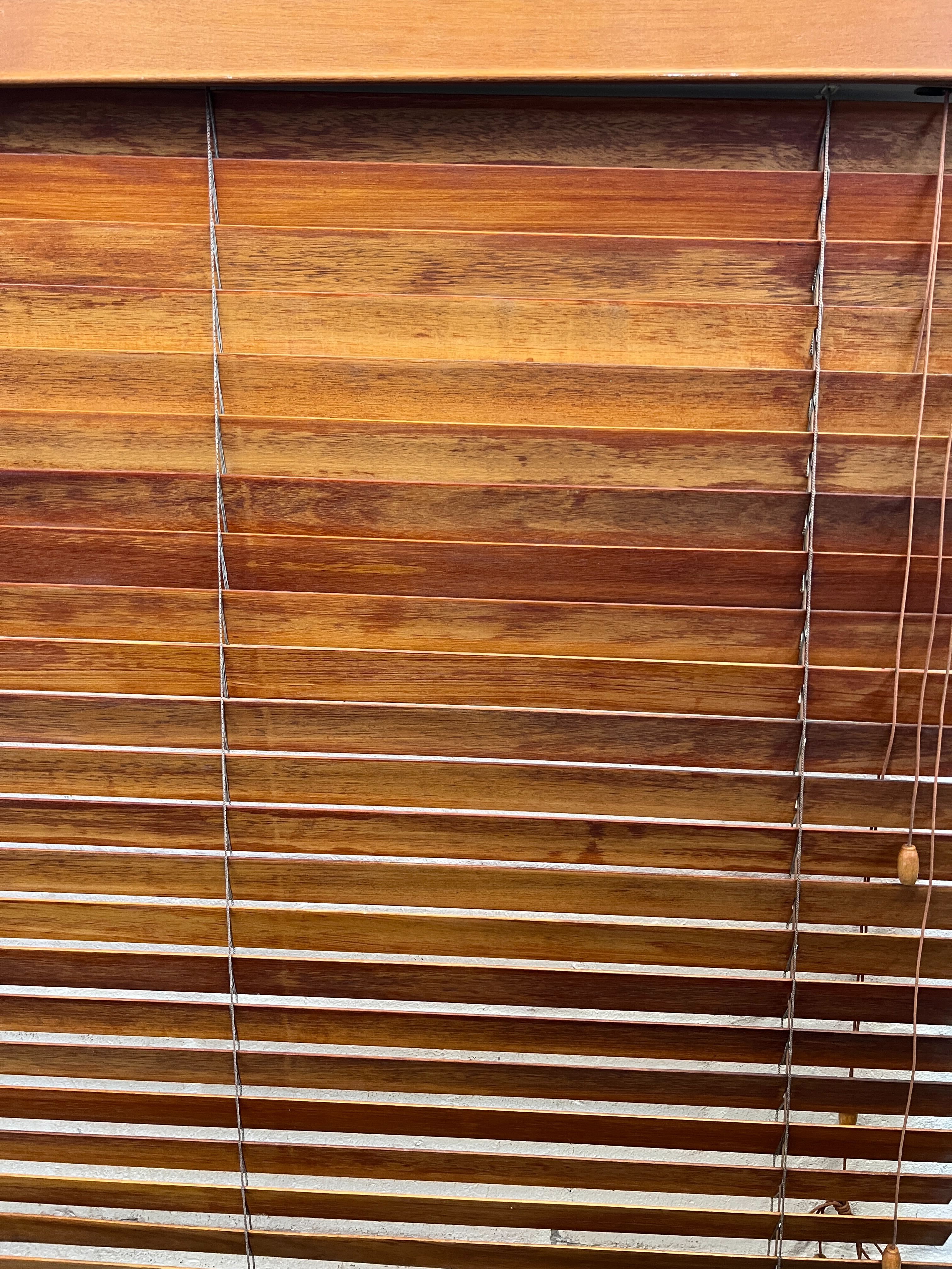 A55438 Transform your space with these elegant wooden Venetian blinds in a rich brown finish. Crafted from high-quality wood, these blinds offer both style and functionality, allowing you to effortlessly adjust light and privacy. The item is in good condition with minor wear, perfect for adding a touch of warmth to your home or office. ๐ŸŒž๐Ÿงก