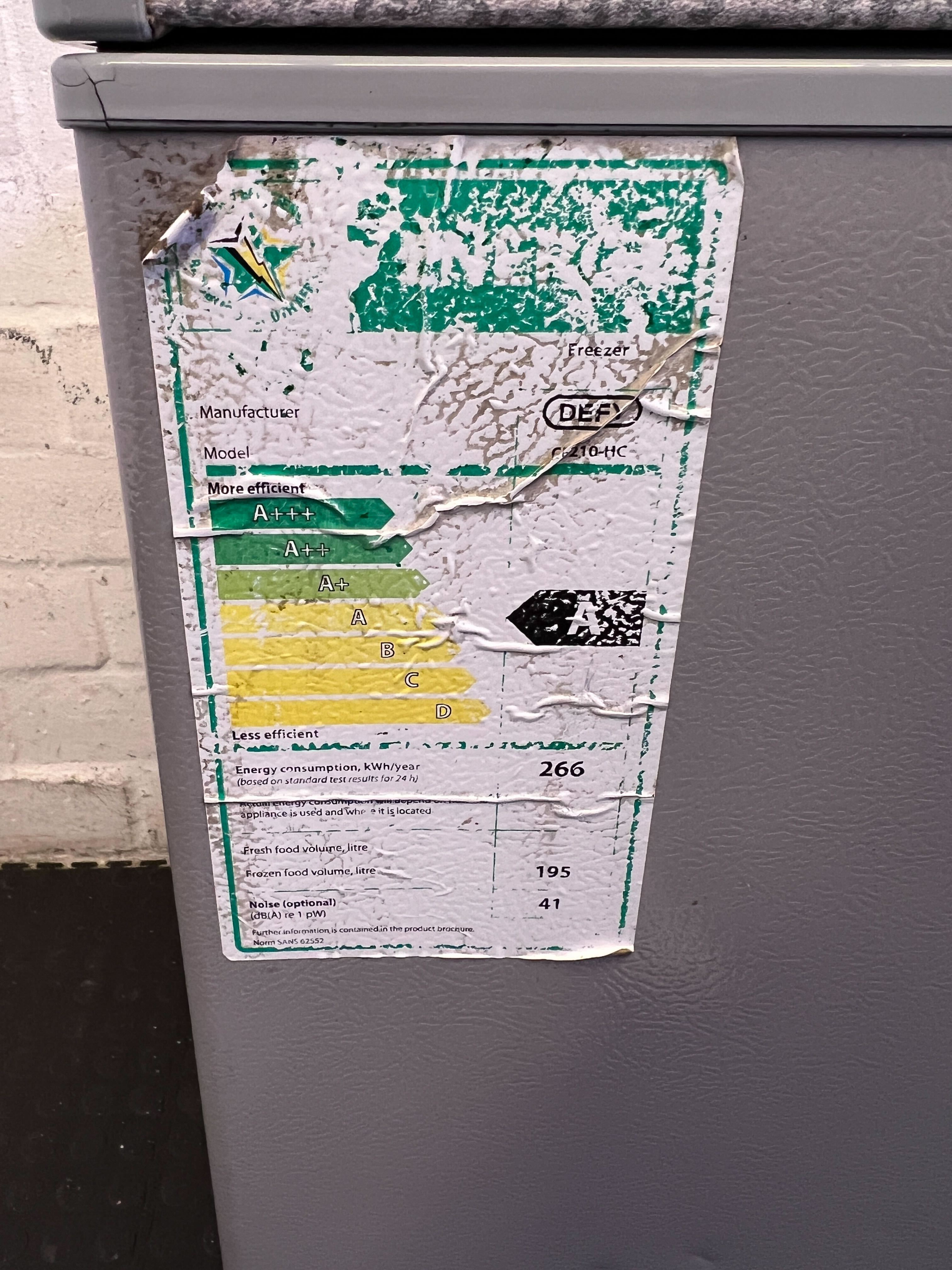 Keep your food fresh and organized with this reliable grey chest freezer! ✨ Perfect for families needing extra storage, bulk buyers, or anyone looking to expand their freezing capacity. Its classic design and spacious interior make it a practical addition to any home or garage. Enjoy peace of mind knowing your frozen goods are kept at optimal temperatures. This chest freezer is in good, used condition. There are some minor cosmetic scuffs and marks consistent with normal use, as visible in the images. The interior is clean, and it functions perfectly, ready for its next home. An energy label is still attached.