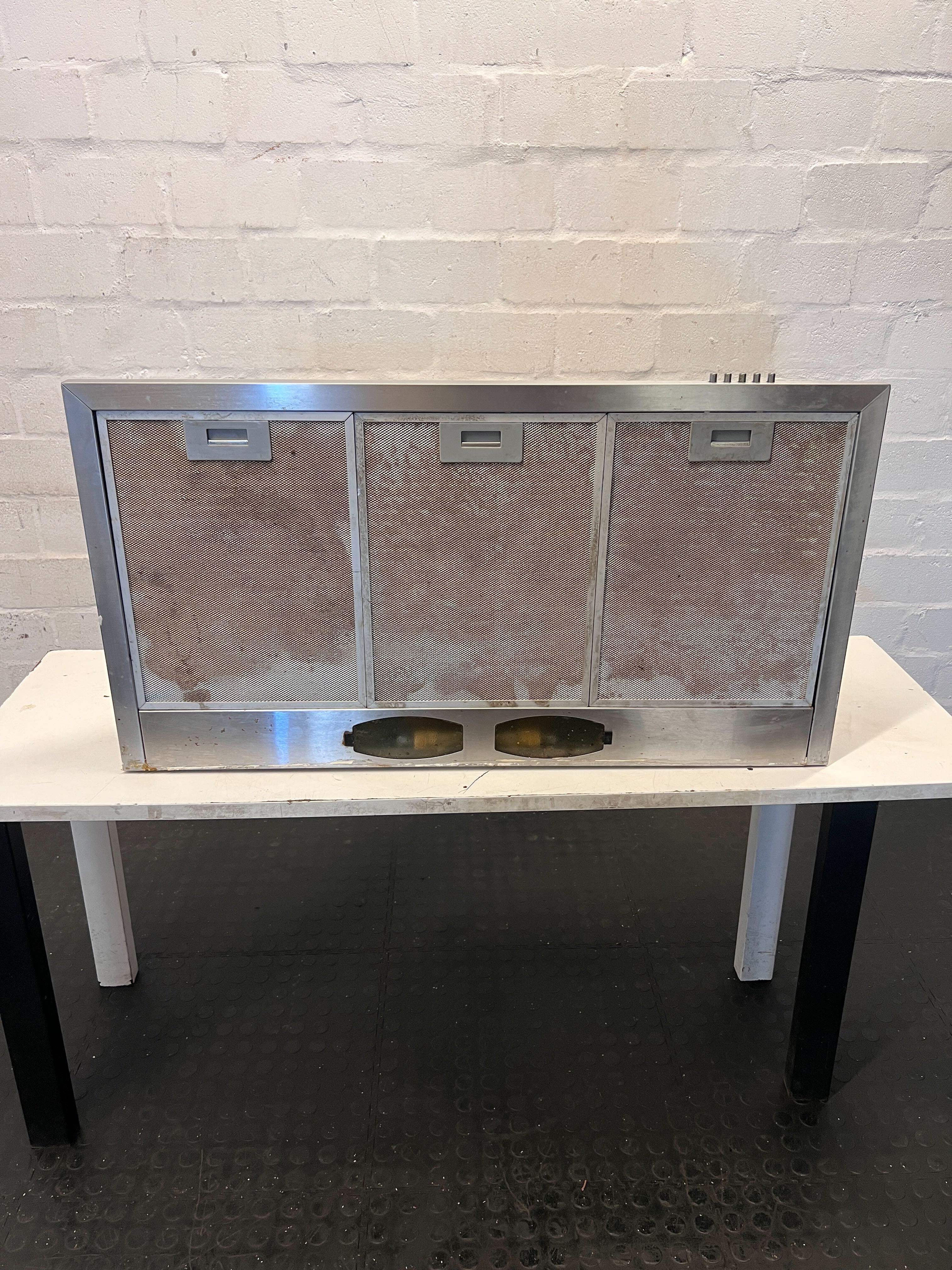 Enhance your kitchen's ventilation with this robust stainless steel extractor hood! ✨ Perfect for keeping your cooking space fresh and free from lingering odors, this unit features three removable filter panels and two integrated lights to illuminate your hob. It's a fantastic practical addition for any kitchen renovation or upgrade on a budget. This extractor hood is in a used, second-hand condition. The stainless steel frame shows visible signs of wear, including surface marks and residue consistent with kitchen use. The three filter panels are discolored and appear heavily soiled, requiring a thorough cleaning or replacement. The two light fixtures are present, but their operational status has not been tested. Please review all images carefully for a full understanding of its condition.