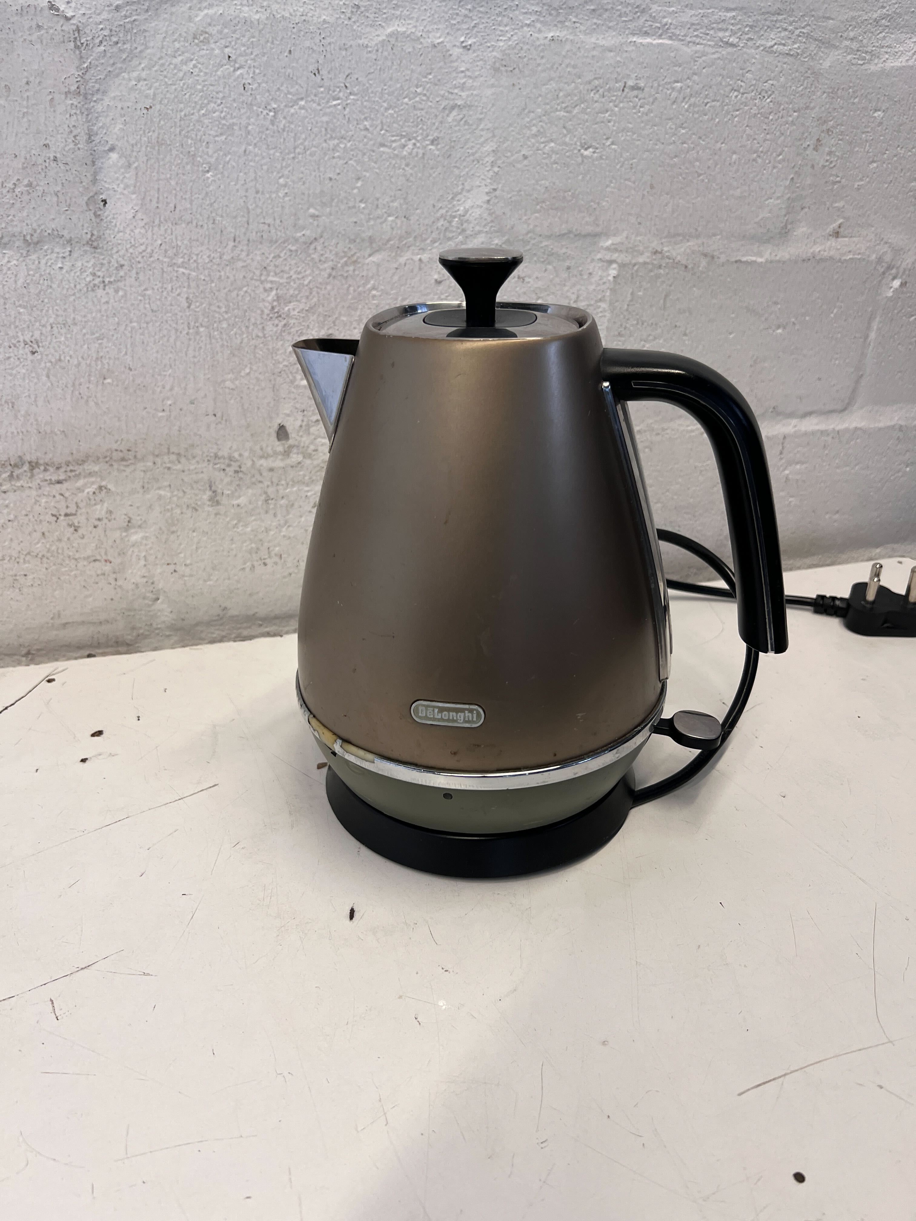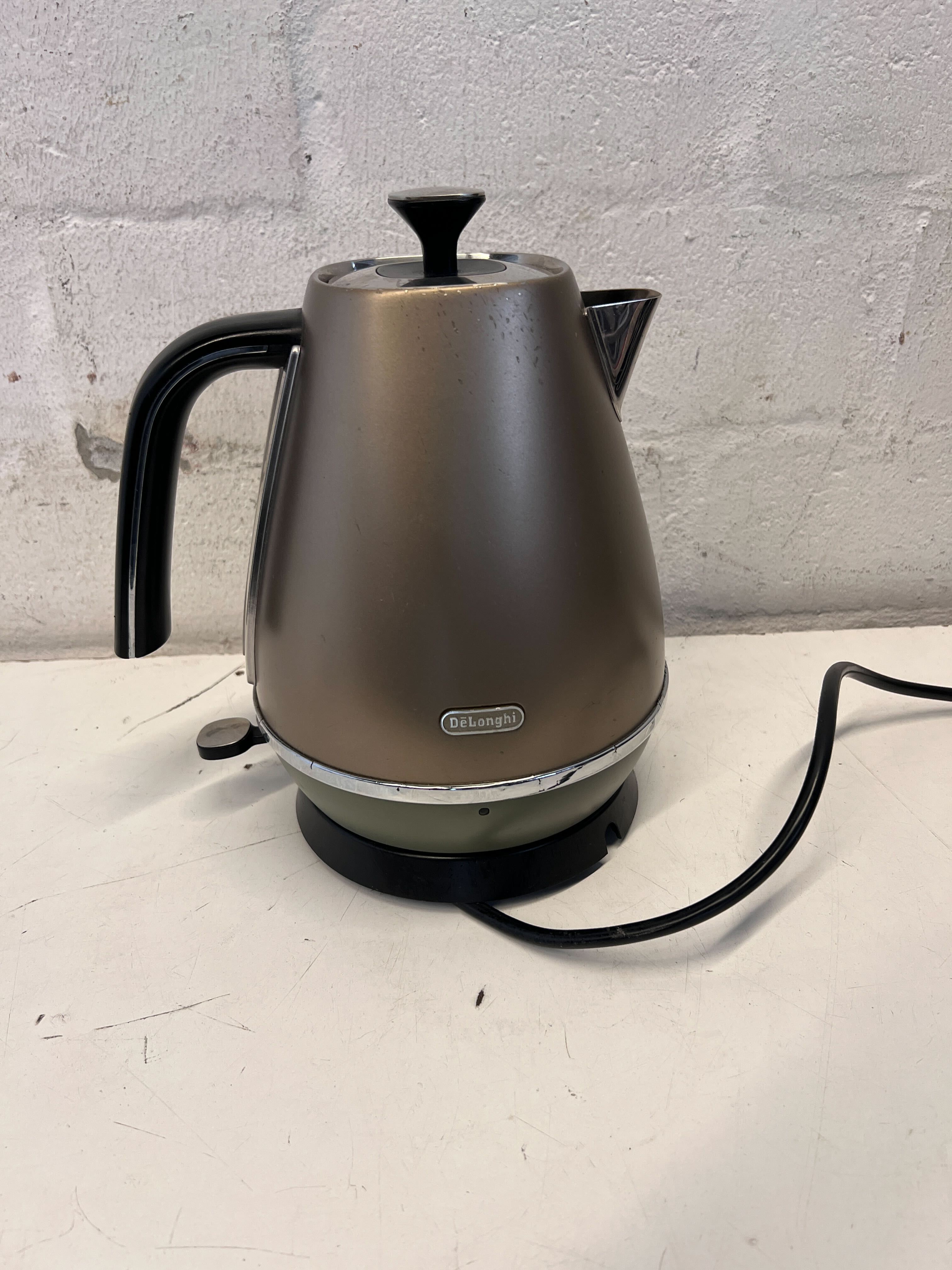 Elevate your kitchen with this stylish De'Longhi electric kettle, perfect for brewing your morning coffee or a relaxing evening tea! ☕ Its sleek, modern design with a unique bronze-toned finish adds a touch of understated elegance to any countertop. This pre-loved gem is ready to become a staple in your daily routine, offering quick and efficient boiling for all your hot beverage needs. ✨ This kettle is in good pre-owned condition, showing signs of regular use. There are visible scuffs and minor scratches on the metallic body, consistent with a second-hand item. The base also shows some wear and slight discoloration around the edges. Despite these cosmetic imperfections, the kettle appears fully functional and and ready for its next home.