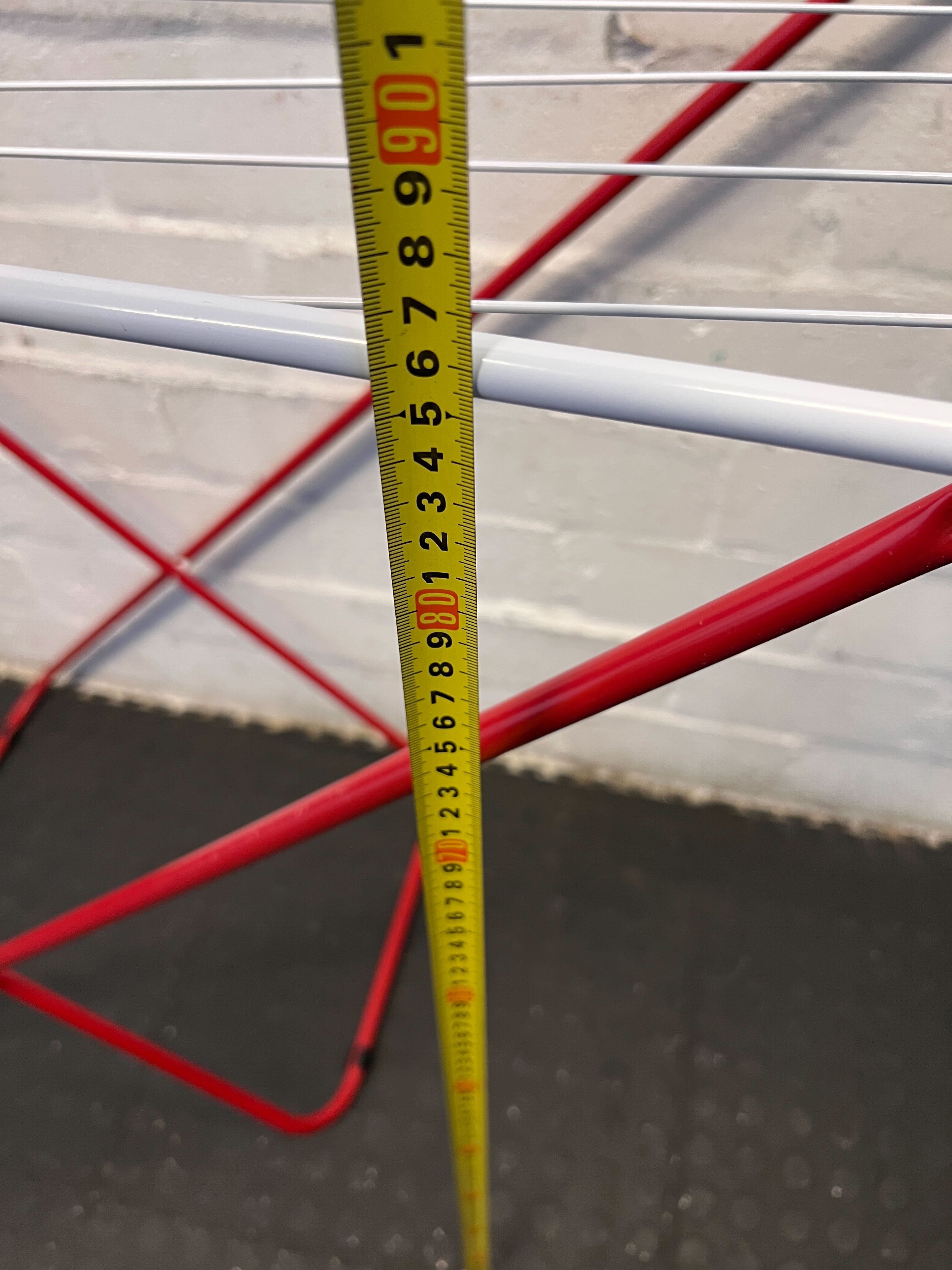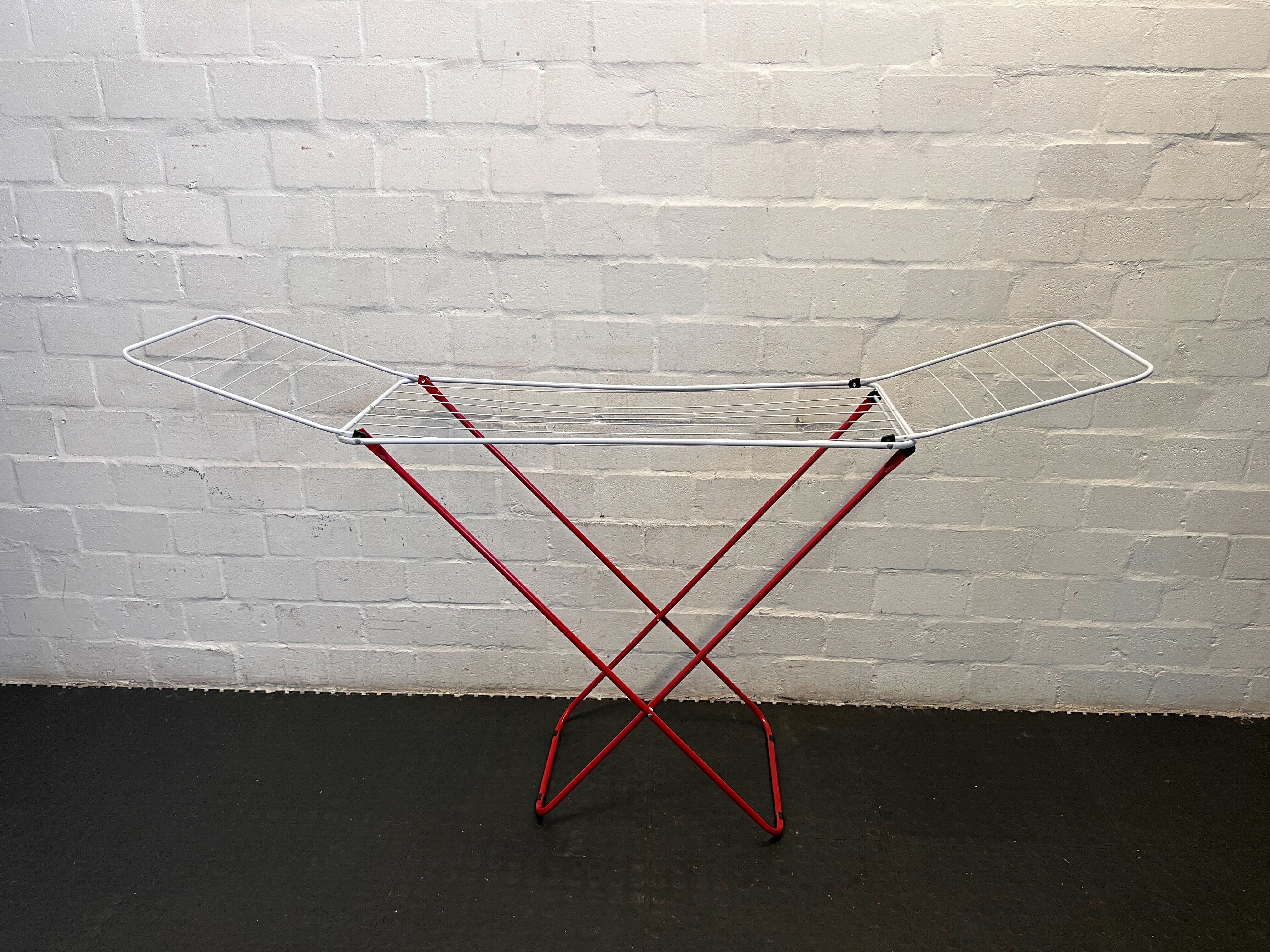 A54854 Elevate your laundry routine with this stylish red and white folding drying rack. Its durable metal construction and thoughtful design ensure stability, making it a convenient addition for drying clothes indoors or outdoors. In good condition with minimal signs of wear, it's perfect for anyone looking to save energy while keeping their clothes fresh! 🌼🧡
