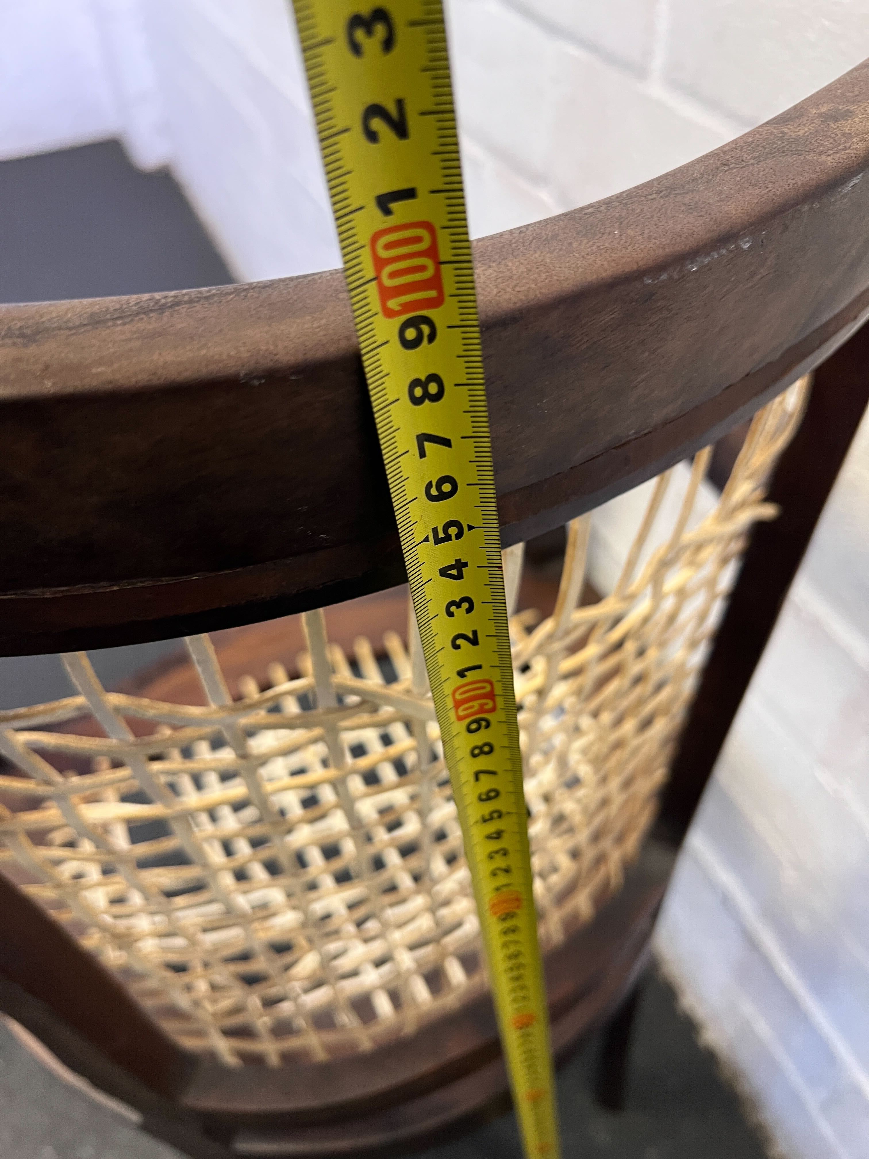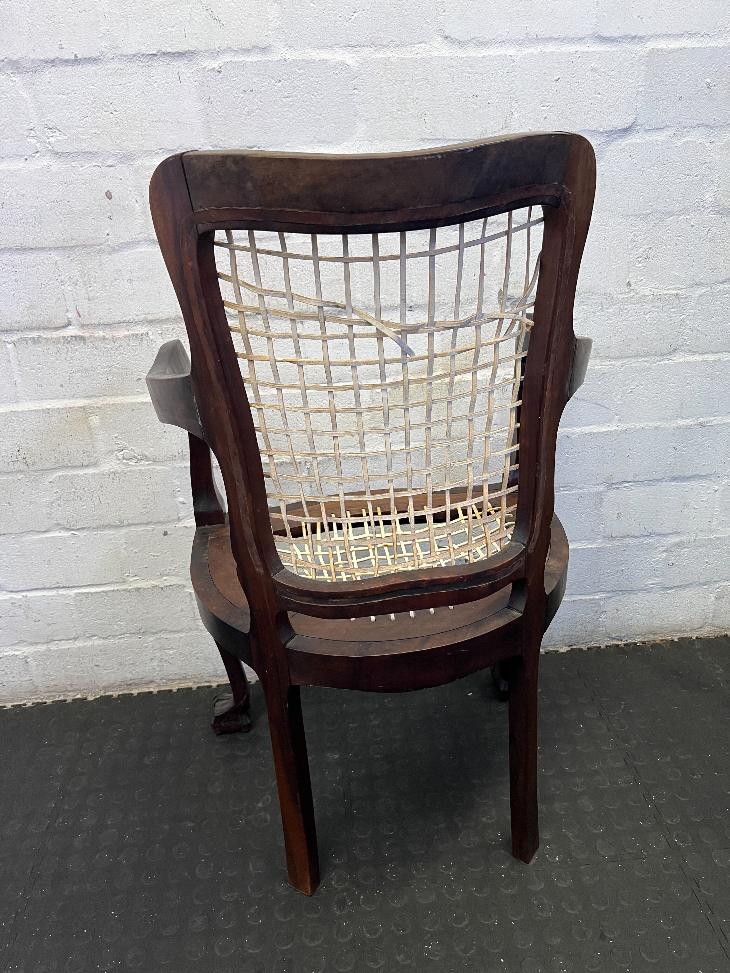 Discover timeless charm with this elegant vintage wooden armchair. Crafted from rich, dark wood with a gracefully curved frame and a distinctive woven seat, this chair exudes classic sophistication. Its unique design, featuring refined arms and beautifully carved feet, makes it a captivating accent piece for any living room, study, or even as a unique dining chair. It's an ideal choice for adding a touch of antique character and warmth to your home decor. ✨This armchair is in good vintage condition, reflecting its age and history. The dark wood frame exhibits minor surface wear, including small scratches and scuffs, which contribute to its authentic vintage appeal. Please note that the woven seat has several broken or missing strands, as clearly shown in the images, and may require repair or replacement depending on intended use and aesthetic preference. The overall structure is sound, and the carved details on the feet are intact. We encourage a close inspection of all provided images to fully appreciate its current state.