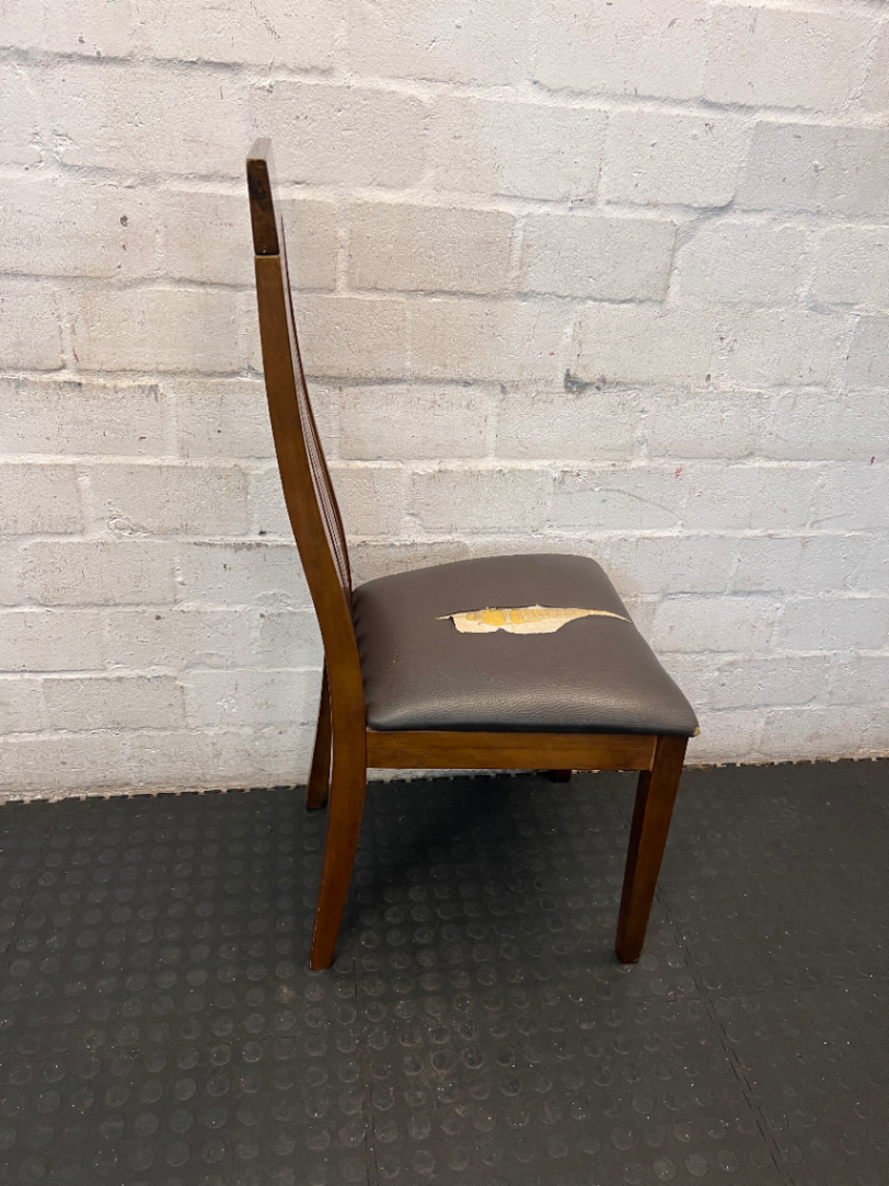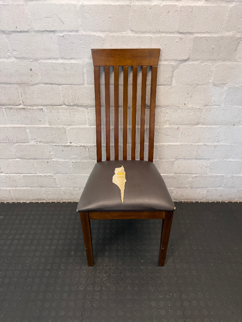 Please Note: This item is being sold in its current condition and is ideal for a DIY upholstery project or for use with a chair cover. The faux leather seat has a significant large tear in the center, exposing the foam beneath. Additionally, there are visible scuffs and chips on the wooden frame, particularly around the top corners and legs, consistent with previous use and handling.