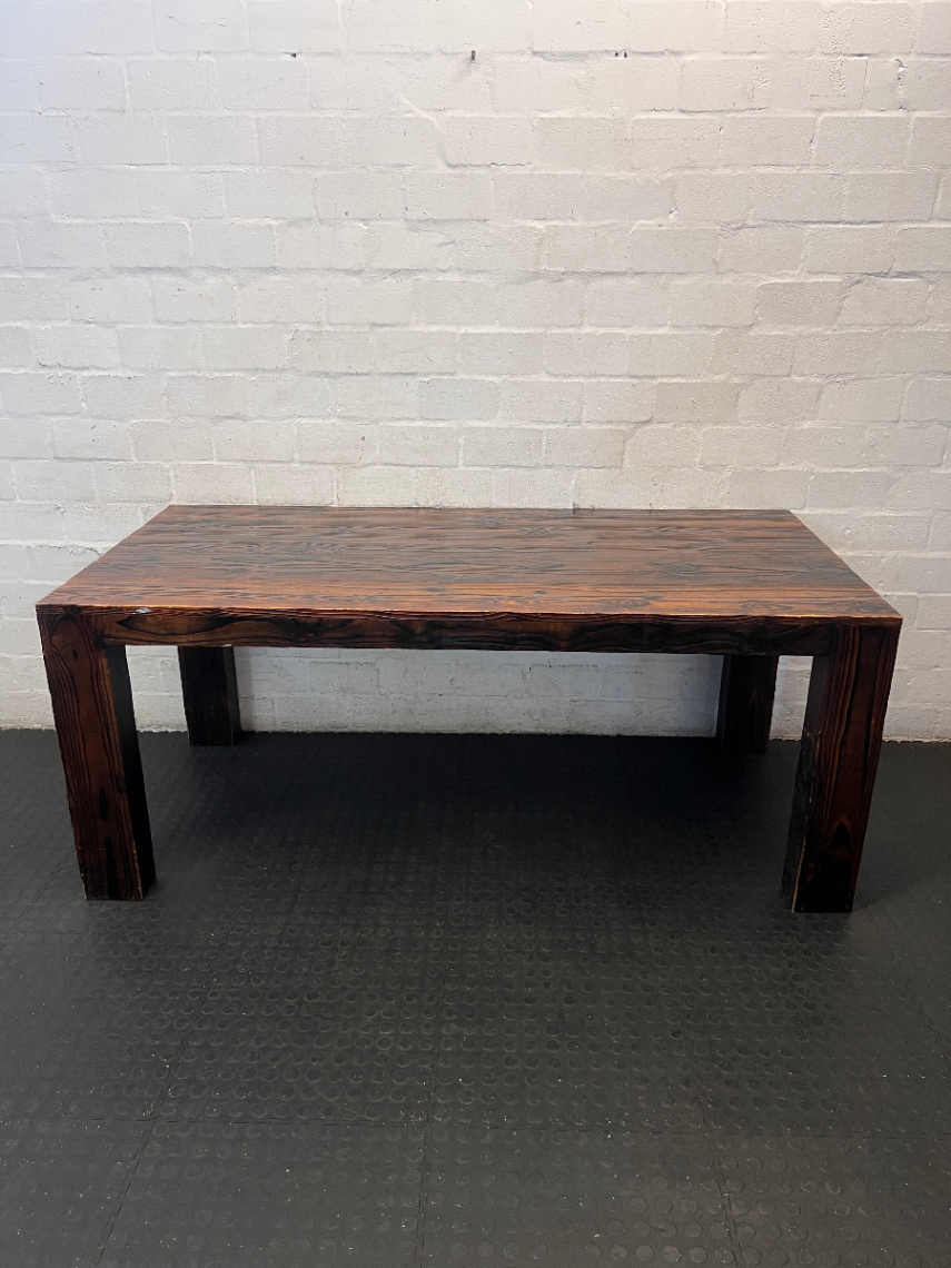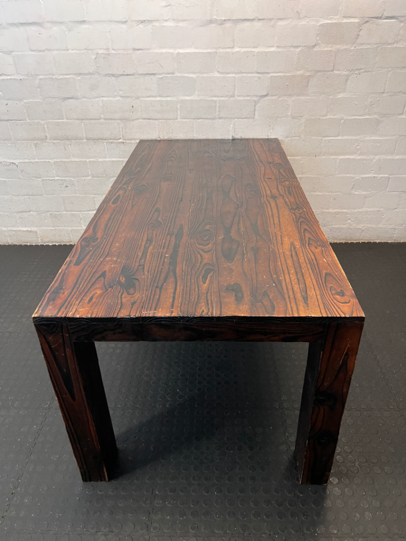 Add a touch of rustic charm to your home with this striking dark wood dining table. Featuring an exceptionally bold grain and deep, rich tones, this piece serves as a dramatic centerpiece for any dining room or kitchen area. Its sturdy design and clean, block-leg silhouette offer a timeless aesthetic that complements both modern and traditional interiors.