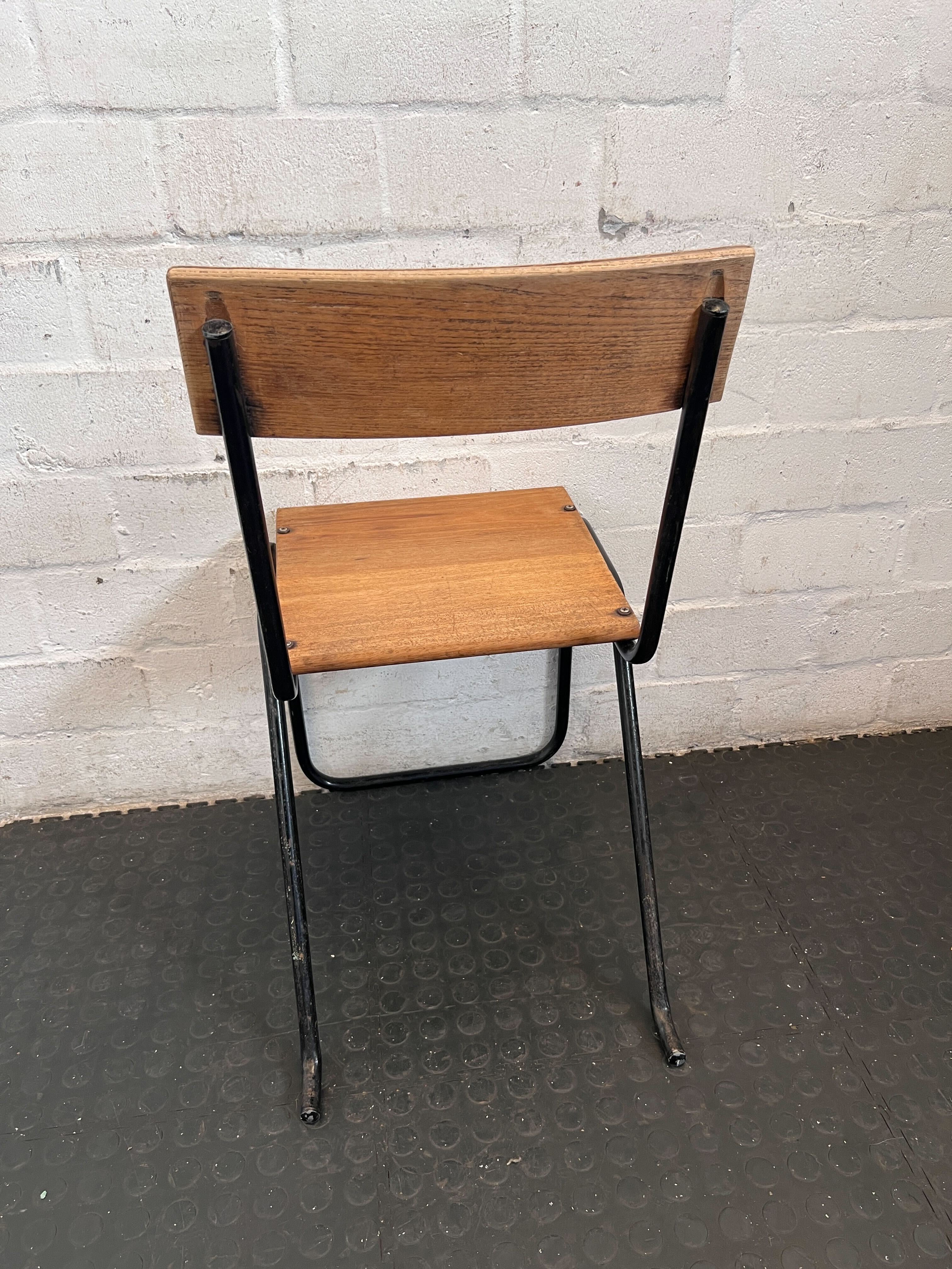 Add a touch of vintage charm and industrial flair to your space with this sturdy wood and metal chair! ✨ Perfect for a dining area, a quirky desk chair, or as a stylish accent piece in a modern or eclectic interior. Its classic design and robust construction make it a versatile addition to any home or commercial setting. This chair offers both comfort and a unique aesthetic that tells a story. 🪑 This chair is in good, pre-loved condition, showcasing its history and character. The wooden seat and backrest show some minor surface wear and light scratches consistent with age and use. The black metal frame is solid with some expected scuffs and minor paint chips, adding to its authentic vintage appeal. It remains fully functional and ready for its next chapter.