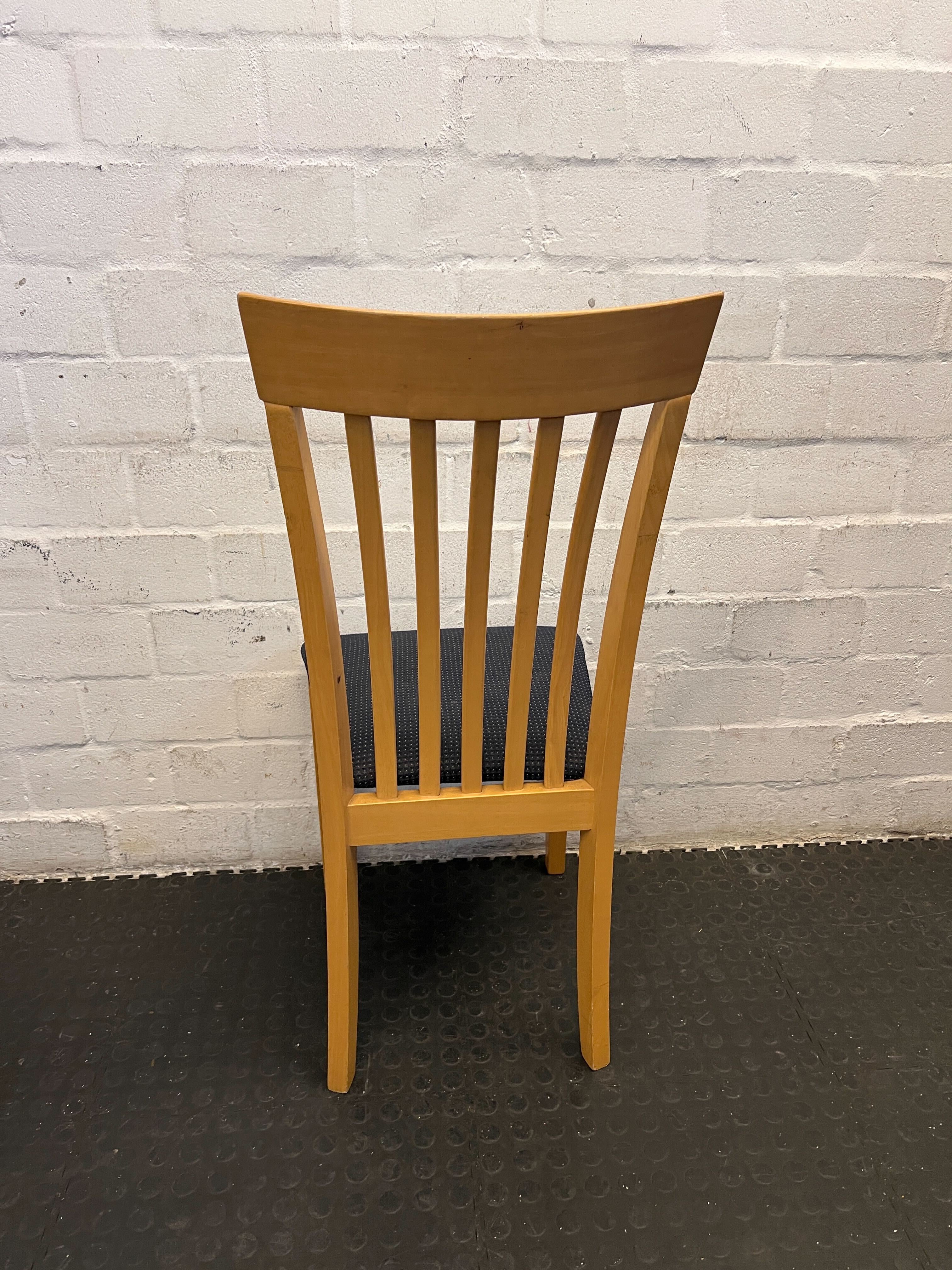 A55702 This elegant dining chair features a light wood frame with a classic slatted back design, complemented by a cozy navy upholstered seat. In good condition with a few minor scratches that add charm, it's perfect for family dinners or casual gatherings. Make your dining area inviting and stylish today! 🪑🧡 #DiningChair #SecondHandFurniture #CapeTown #2ndHandWarehouse