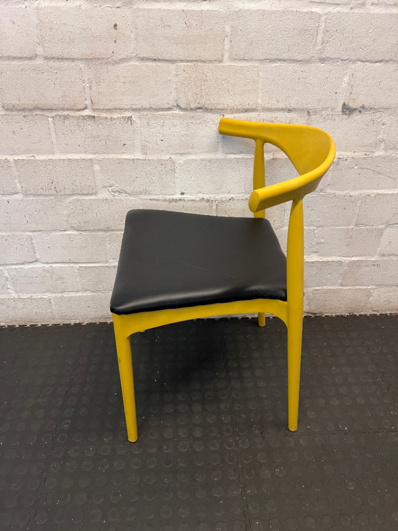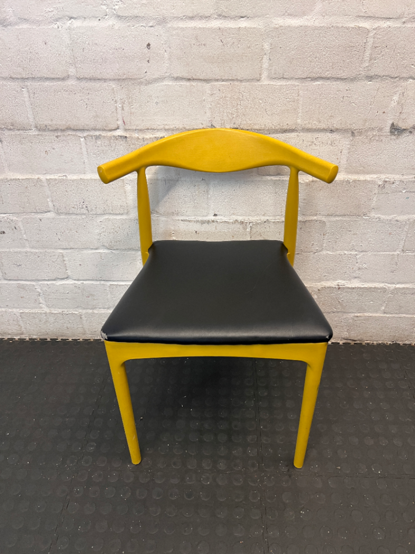 Add a bold pop of color to your dining space with these striking modern dining chairs. Featuring a unique curved frame silhouette and a vibrant yellow finish, these chairs are designed to be a conversation starter. The contrast between the lime-yellow polymer frame and the sleek black synthetic leather seat creates a sharp, contemporary aesthetic perfect for an eclectic or modern home.