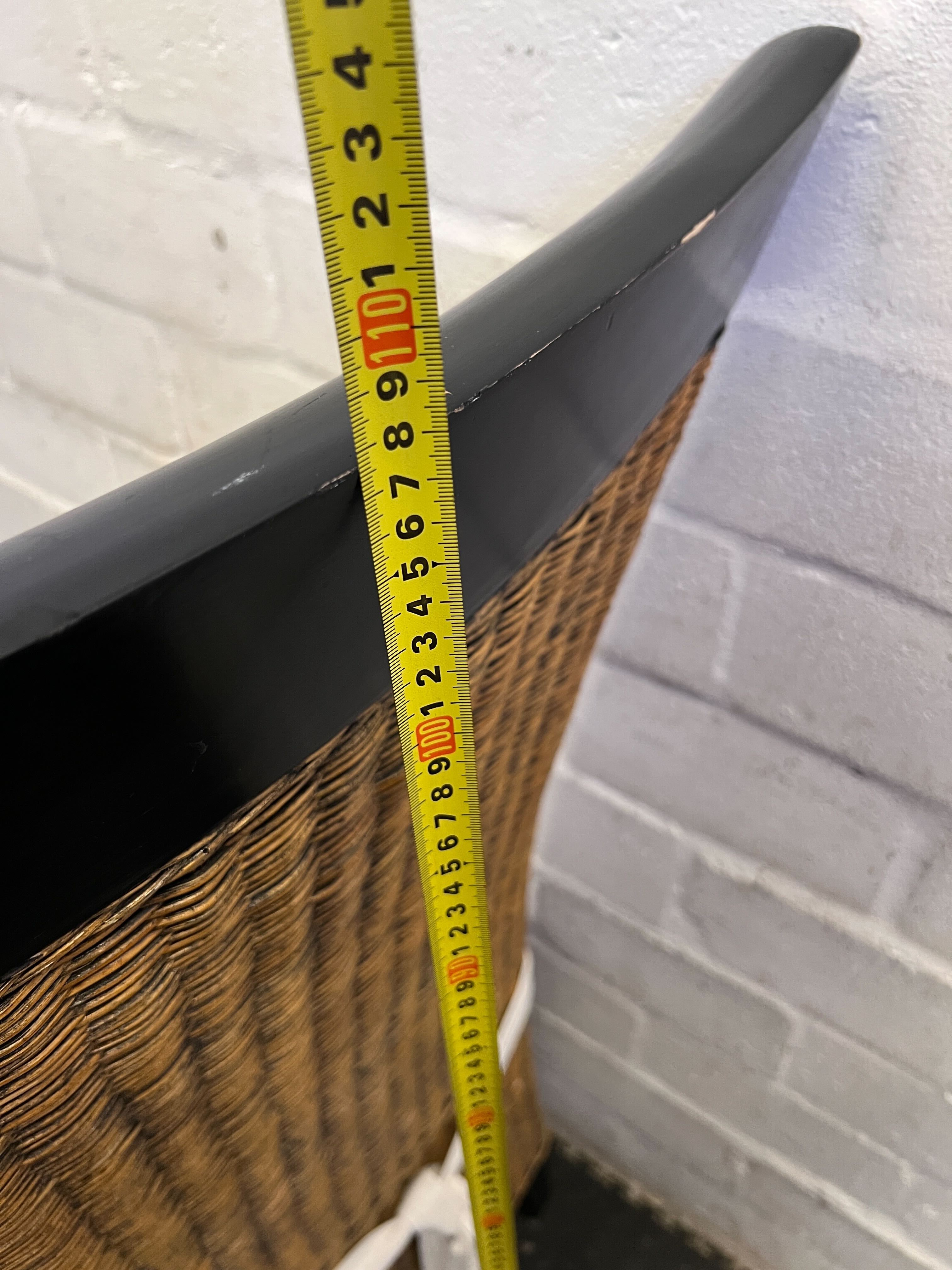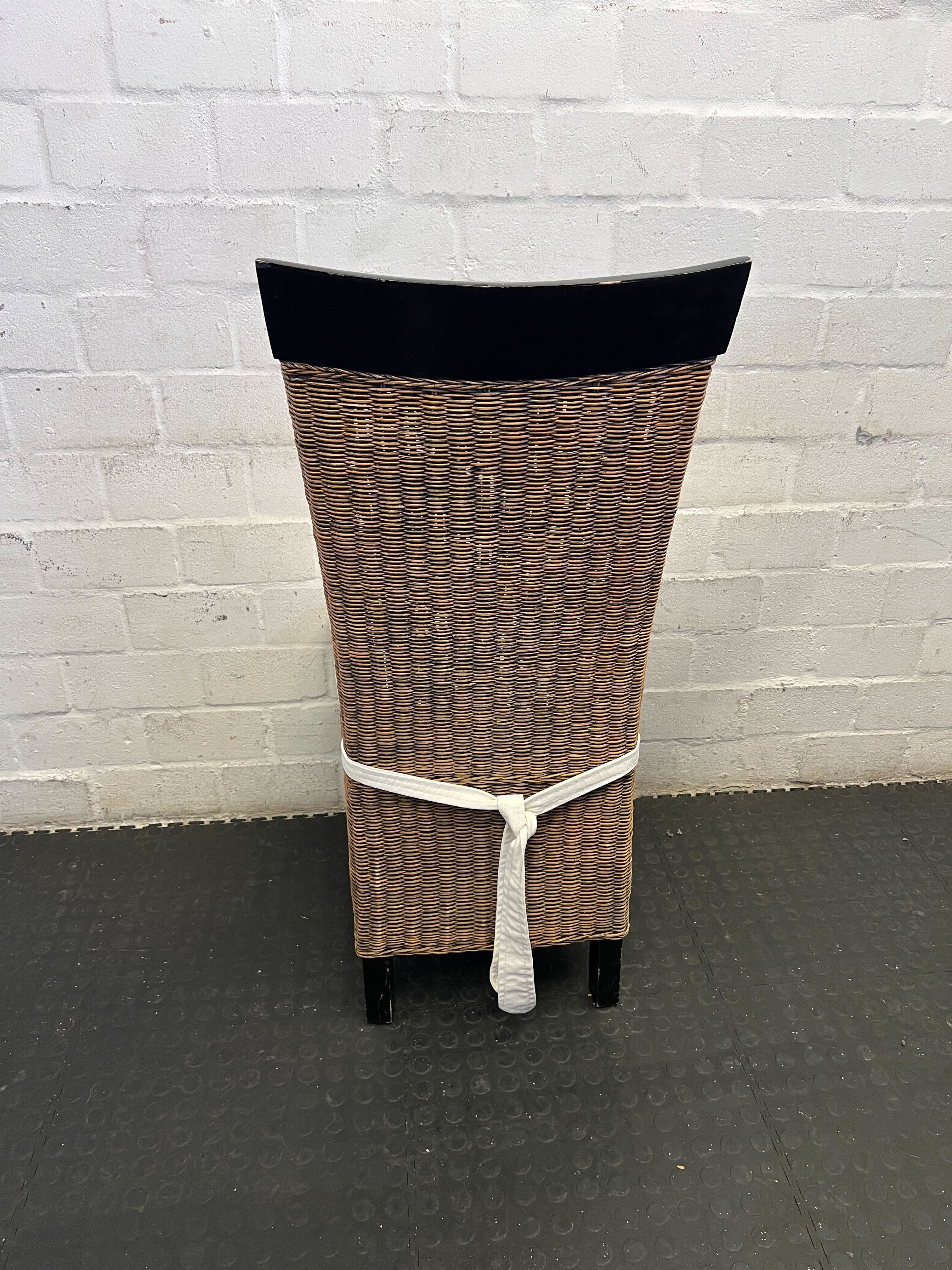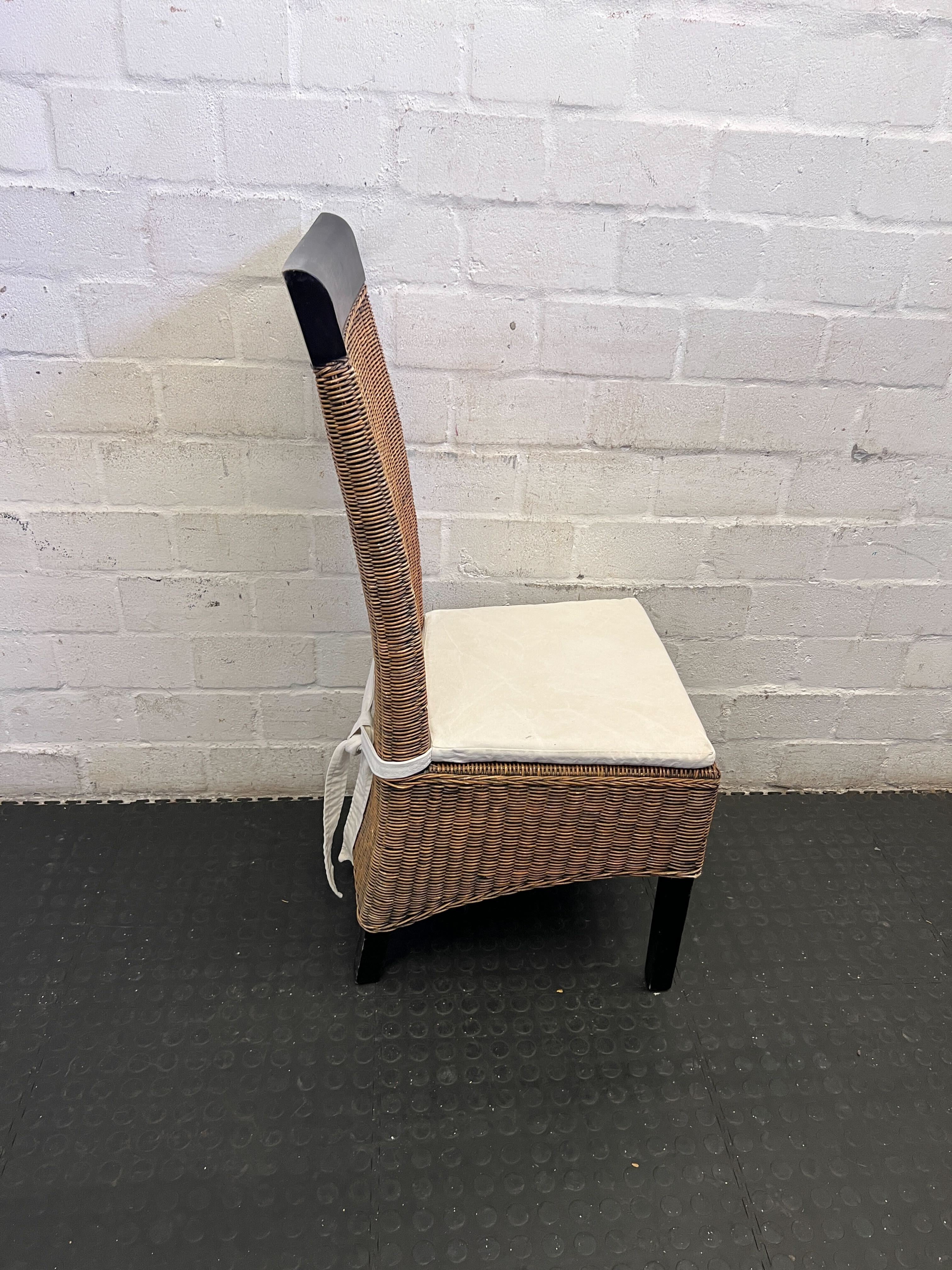 Add a touch of rustic elegance to your dining space with this charming wicker dining chair. Featuring a classic woven wicker design, this chair offers both style and comfort. It comes complete with a soft, cream-colored cushion for added coziness and a sleek black trim on the backrest, providing a modern contrast. Perfect for a dining room, kitchen nook, or even as an inviting accent chair in a sunroom or conservatory! ✨🛋️ This chair is in good pre-loved condition. The wicker weave is largely intact with minor signs of use, consistent with a second-hand item. The cream cushion is clean with some light wear from age, and the frame remains sturdy and stable. Overall, a lovely piece ready for its new home.