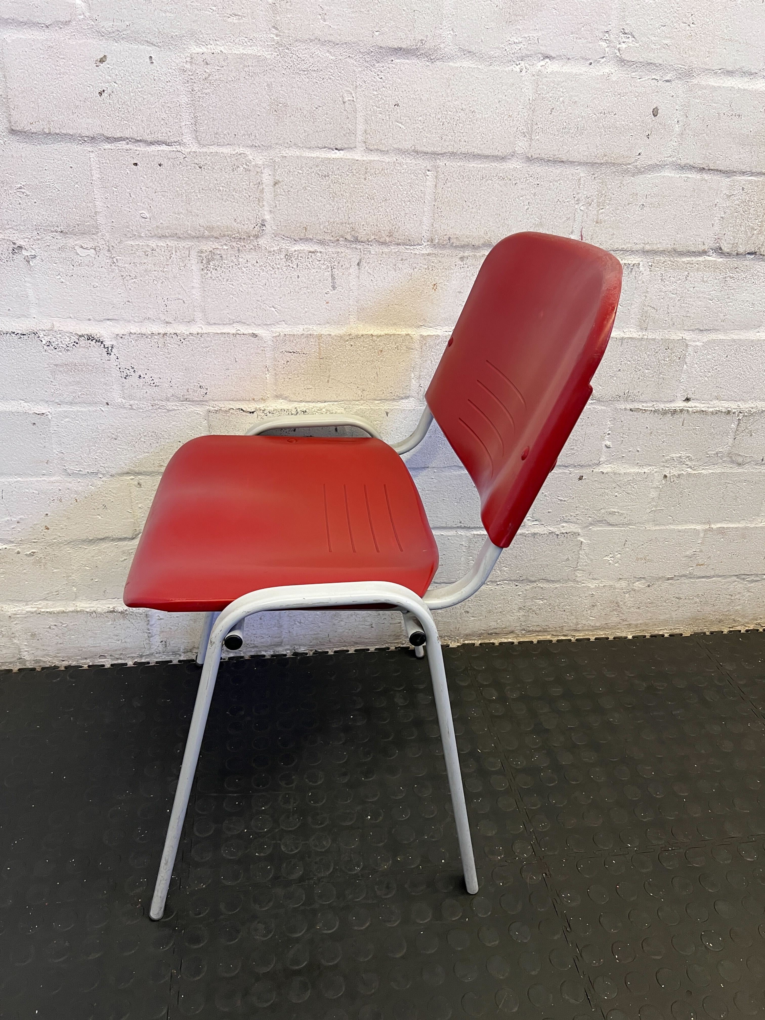This vibrant retro red utility chair adds a pop of color and practical seating to any space! ✨ Perfect for a home office, waiting room, school, or even as an extra dining chair. Its durable plastic seat and back, coupled with a sturdy light grey metal frame, make it a reliable and easy-to-maintain choice. The stackable design is a fantastic space-saving feature, ideal for smaller areas or when you need flexible seating options. This chair is in good, used second-hand condition with visible signs of its previous life, adding to its character. The red plastic seat and back show various scuffs and scratches consistent with regular use. The light grey metal frame has paint chips and surface abrasions, particularly on the legs and arms. Please review the images closely for a comprehensive understanding of its condition.