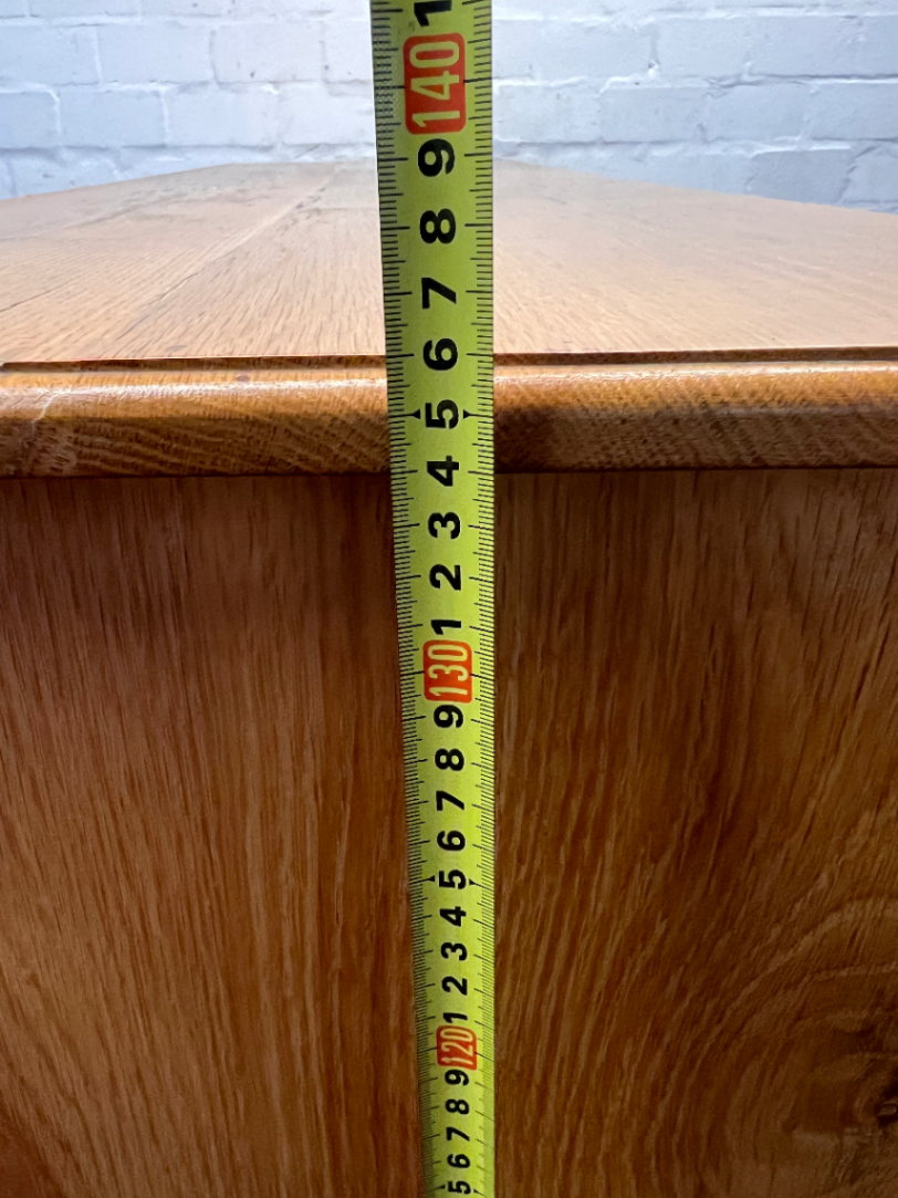 This dresser is in very good pre-owned condition, showcasing the enduring quality of solid oak. As a second-hand item, it carries a unique character that new furniture often lacks. Honest condition notes: there are some minor chips and wear on the top edges and corners (as seen in the detailed photos), and the backboard features some cutouts for cable management from previous use. These points are purely cosmetic and do not affect the sturdy integrity of the piece.