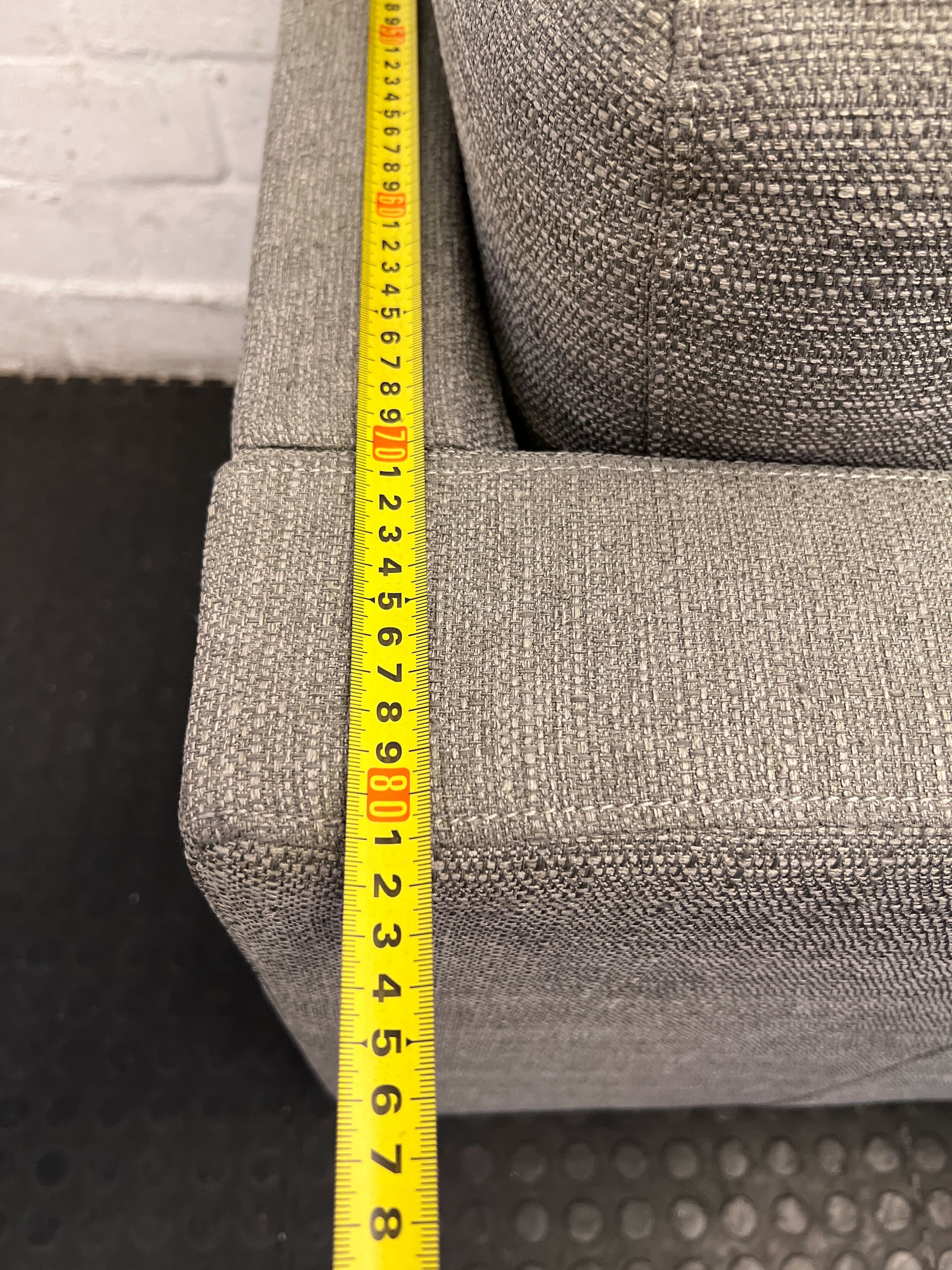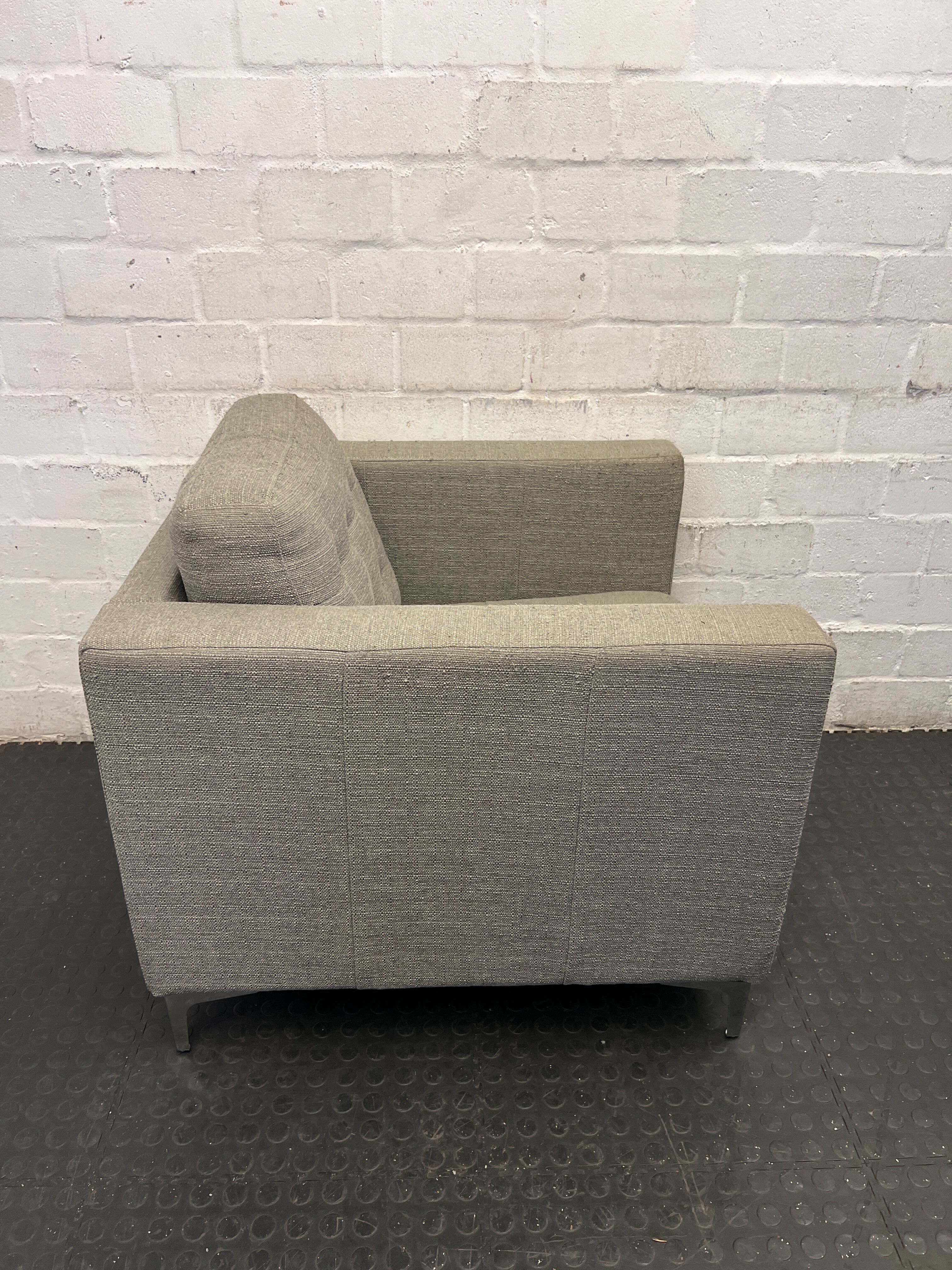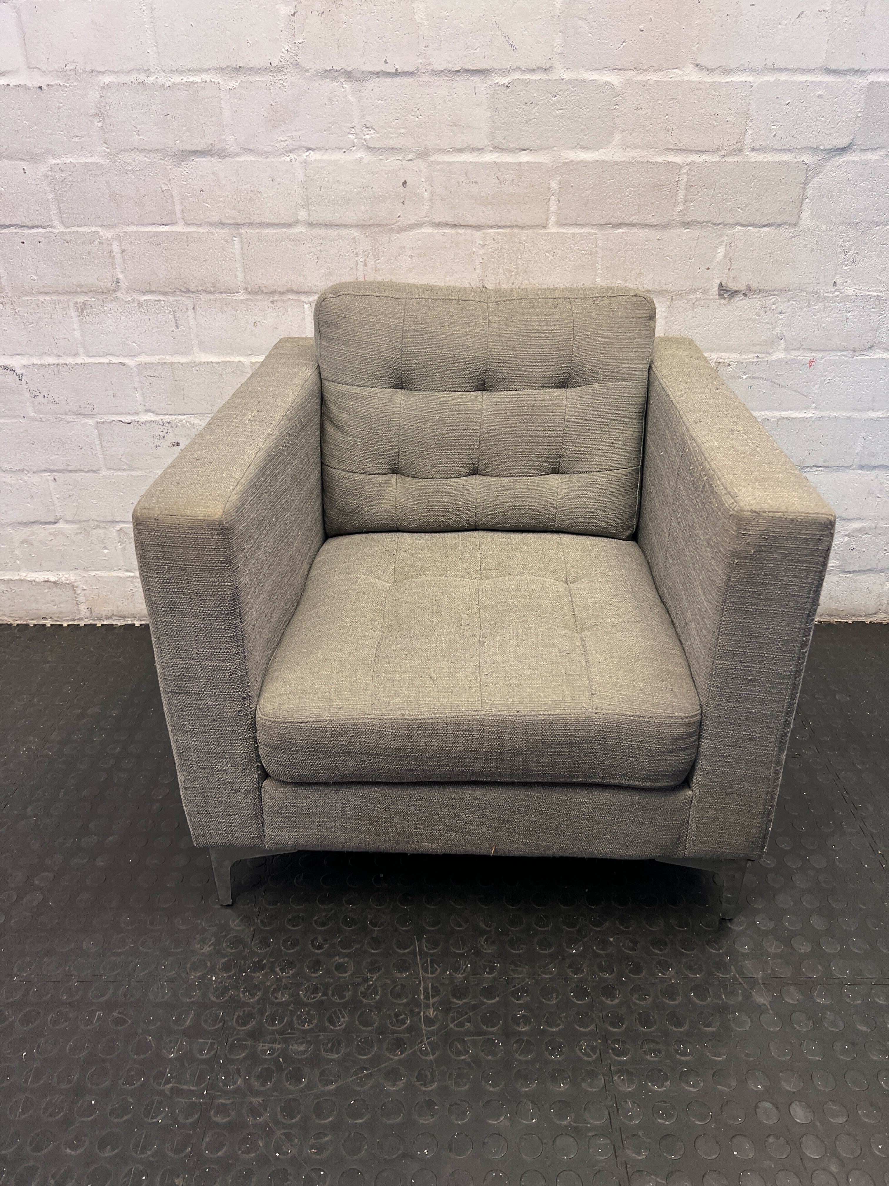 This stylish grey fabric armchair offers a perfect blend of modern design and comfort, ideal for any living room, study, or cozy reading nook. Its sleek lines, square arms, and subtly tufted back and seat cushions provide a contemporary look that will effortlessly complement various decor styles. Imagine relaxing with a book or enjoying a quiet moment in this inviting piece! 🛋️✨This armchair is in good pre-owned condition, showing signs of gentle use consistent with its age. The grey fabric is generally clean, but there is some noticeable discoloration and wear on the top edges of both armrests, as visible in the photos. The tufting and structural integrity remain solid, offering comfortable support.