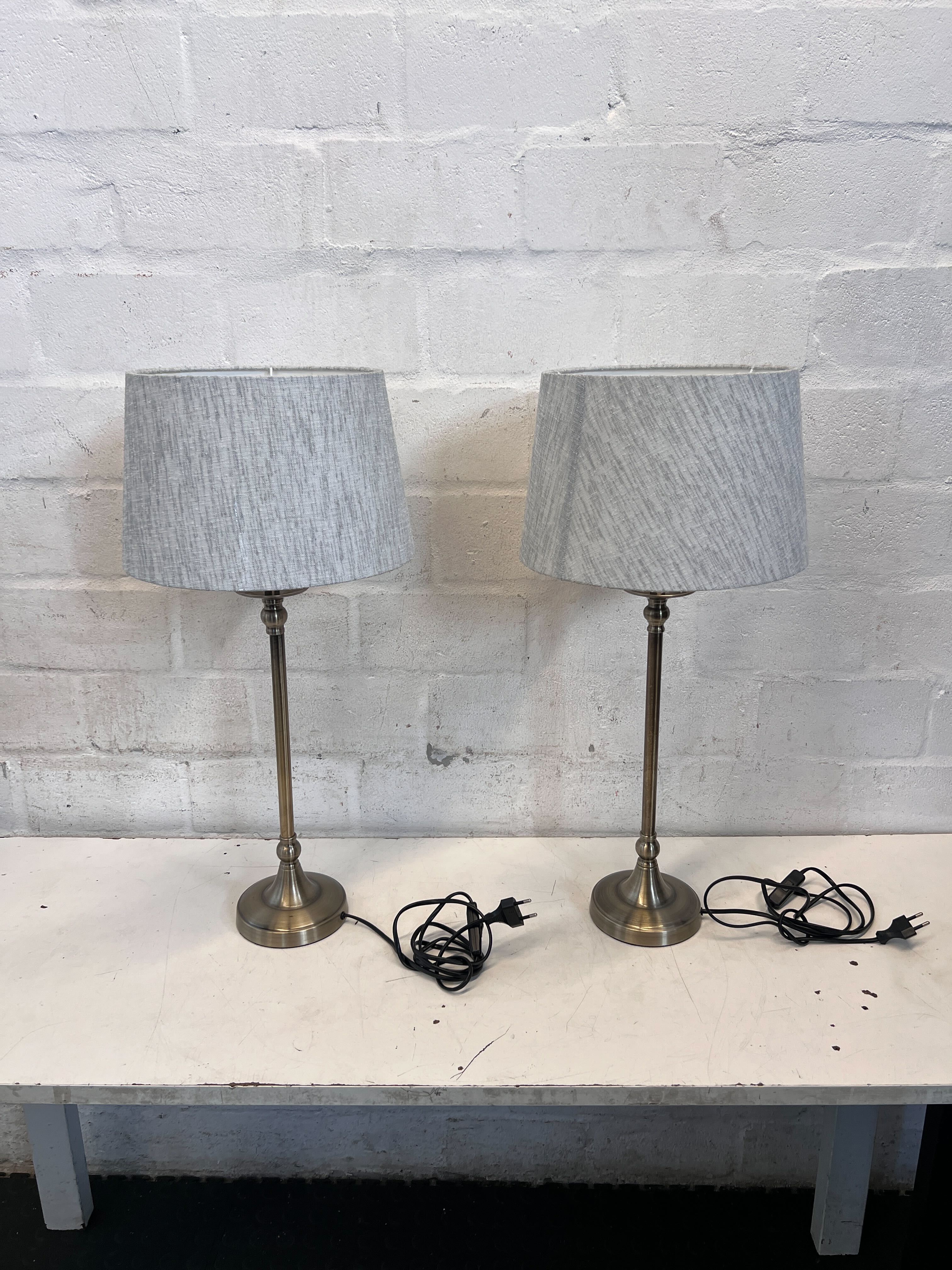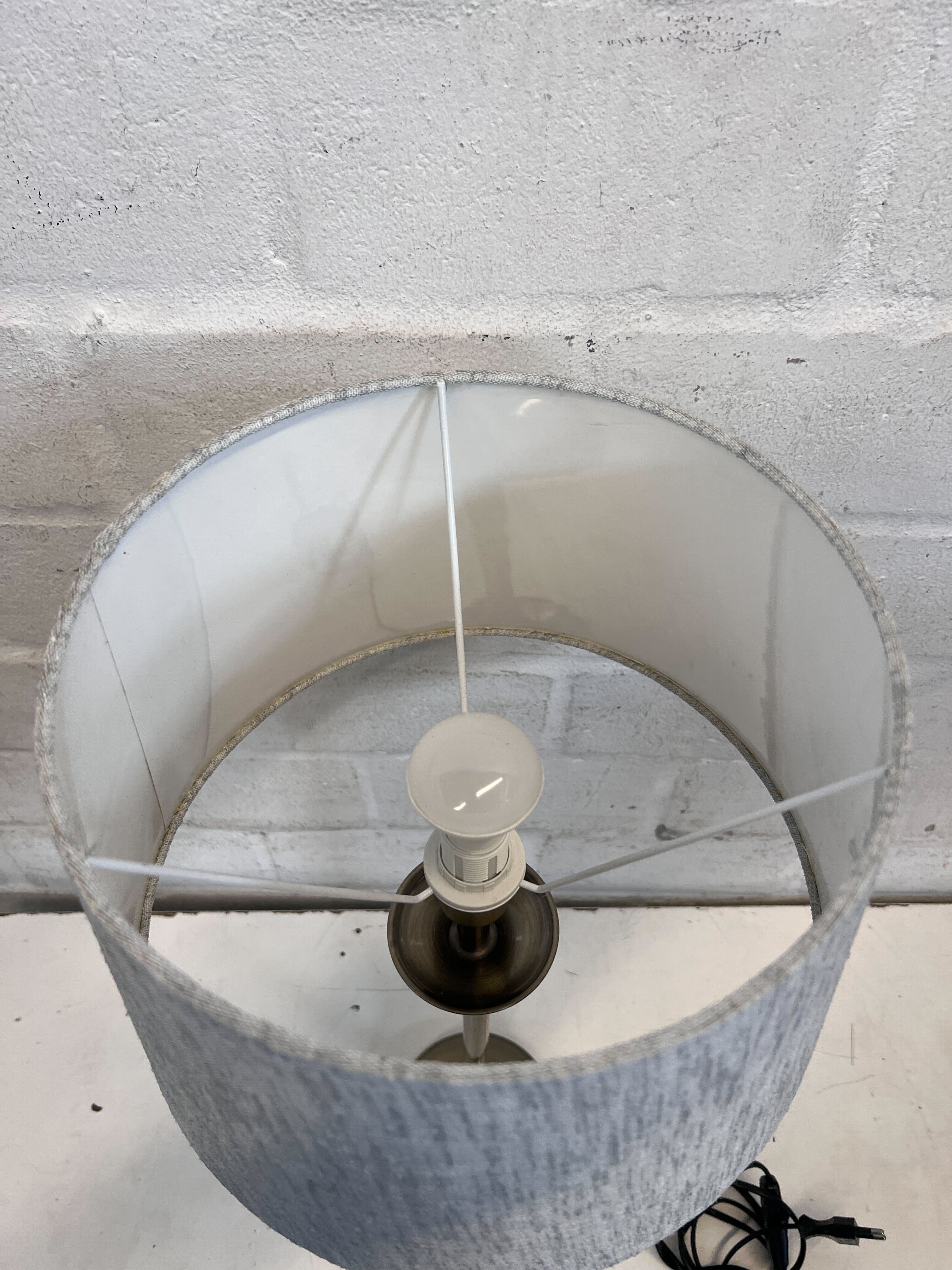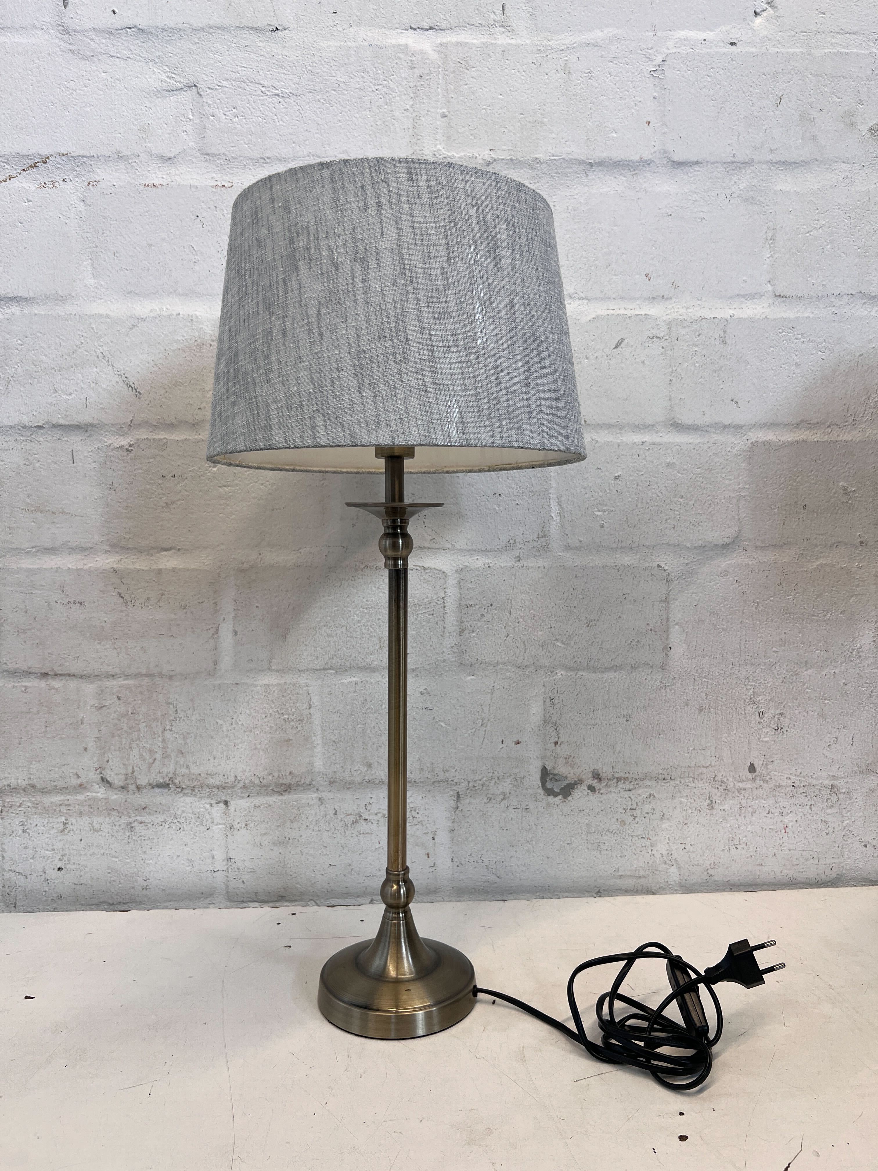 Illuminate your space with this stylish table lamp, featuring a chic brushed brass finish and a contemporary grey textured fabric shade. Its minimalist design makes it a versatile addition to any room, perfect for adding a warm, inviting glow to your bedside table, living room side table, or home office. This lamp blends seamlessly with various decor styles, from modern to classic, enhancing your home's ambiance. ✨🛋️ This lamp is in excellent pre-loved condition, showing minimal signs of wear consistent with gentle use. The brushed brass base maintains its elegant finish, and the grey fabric shade is clean and free from significant imperfections, ensuring it's ready to light up your home.