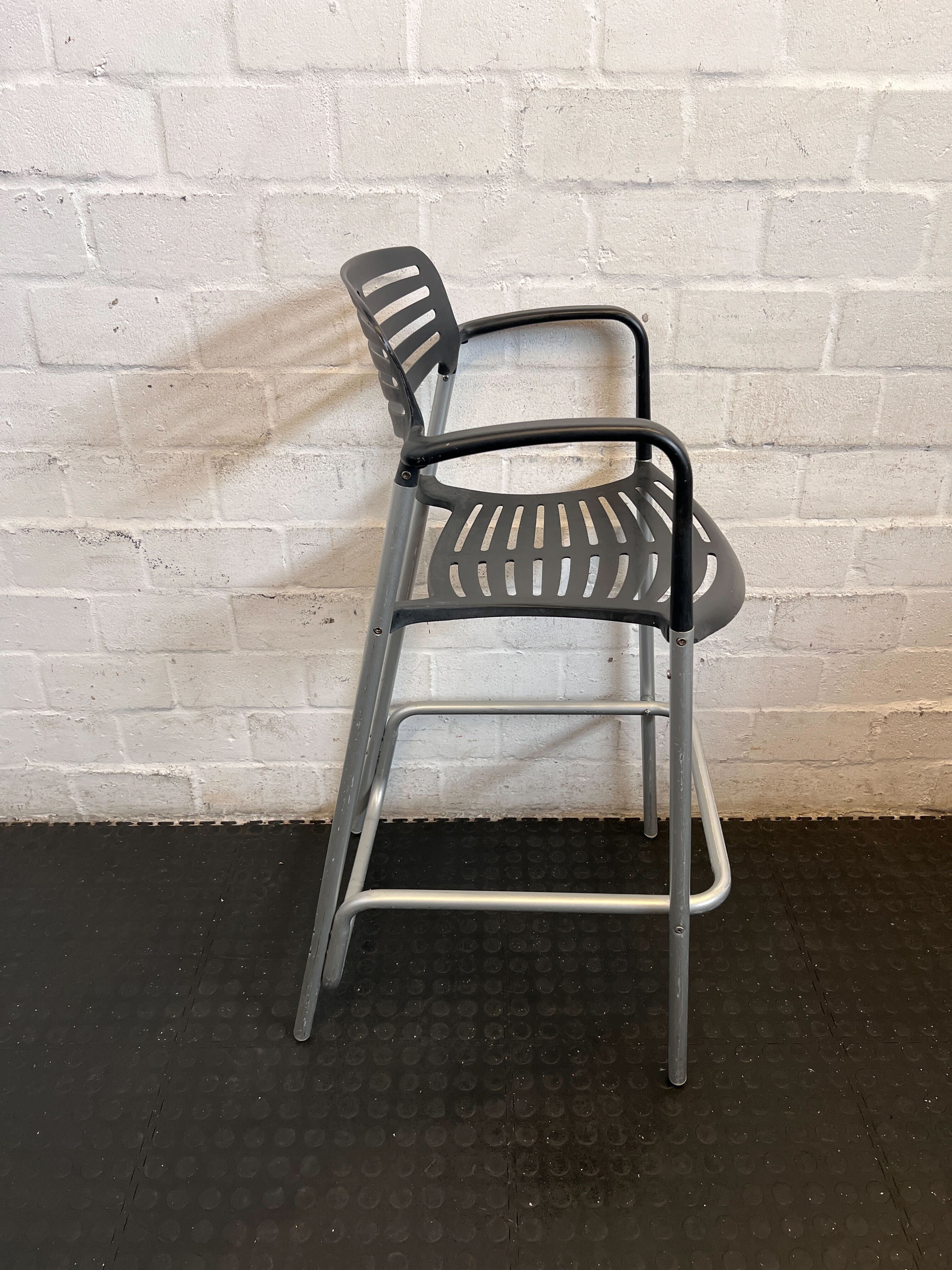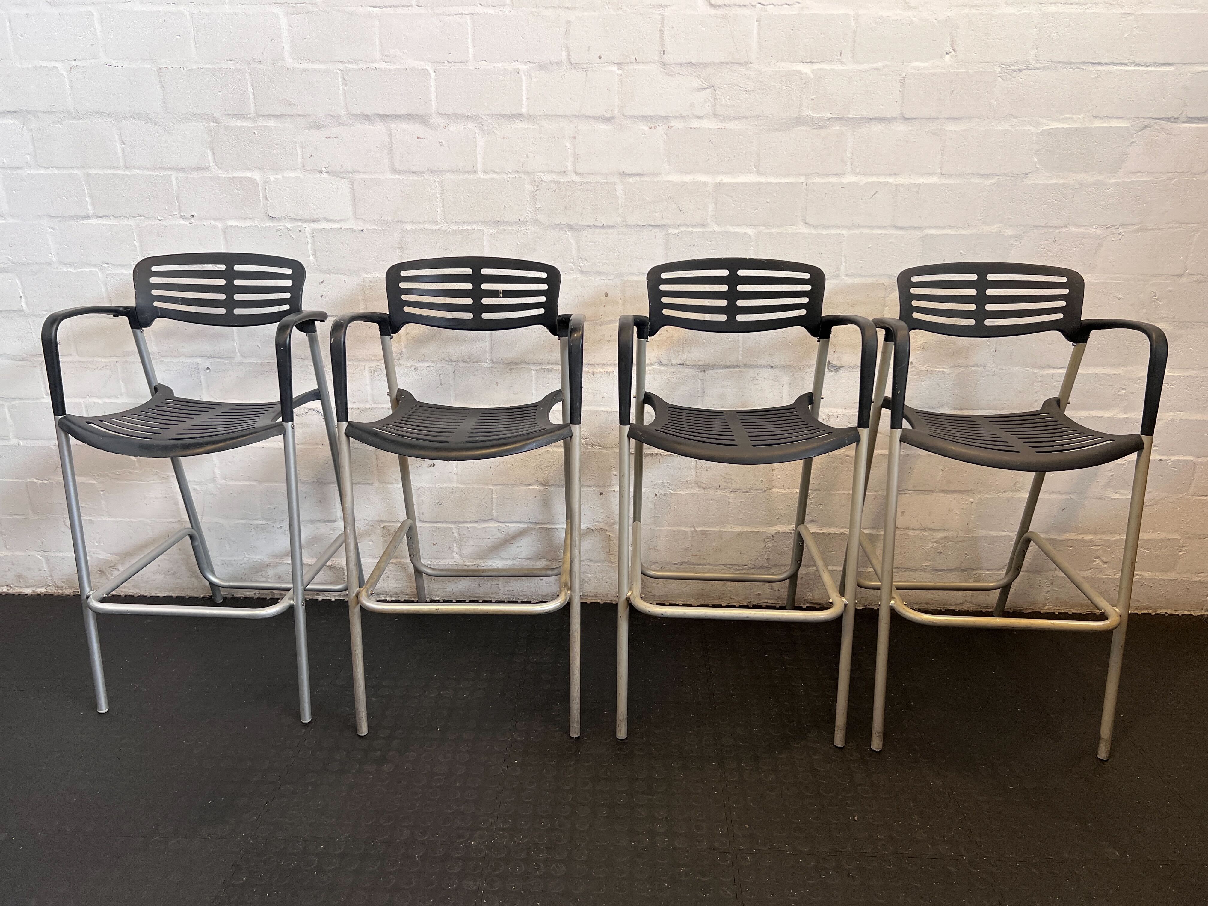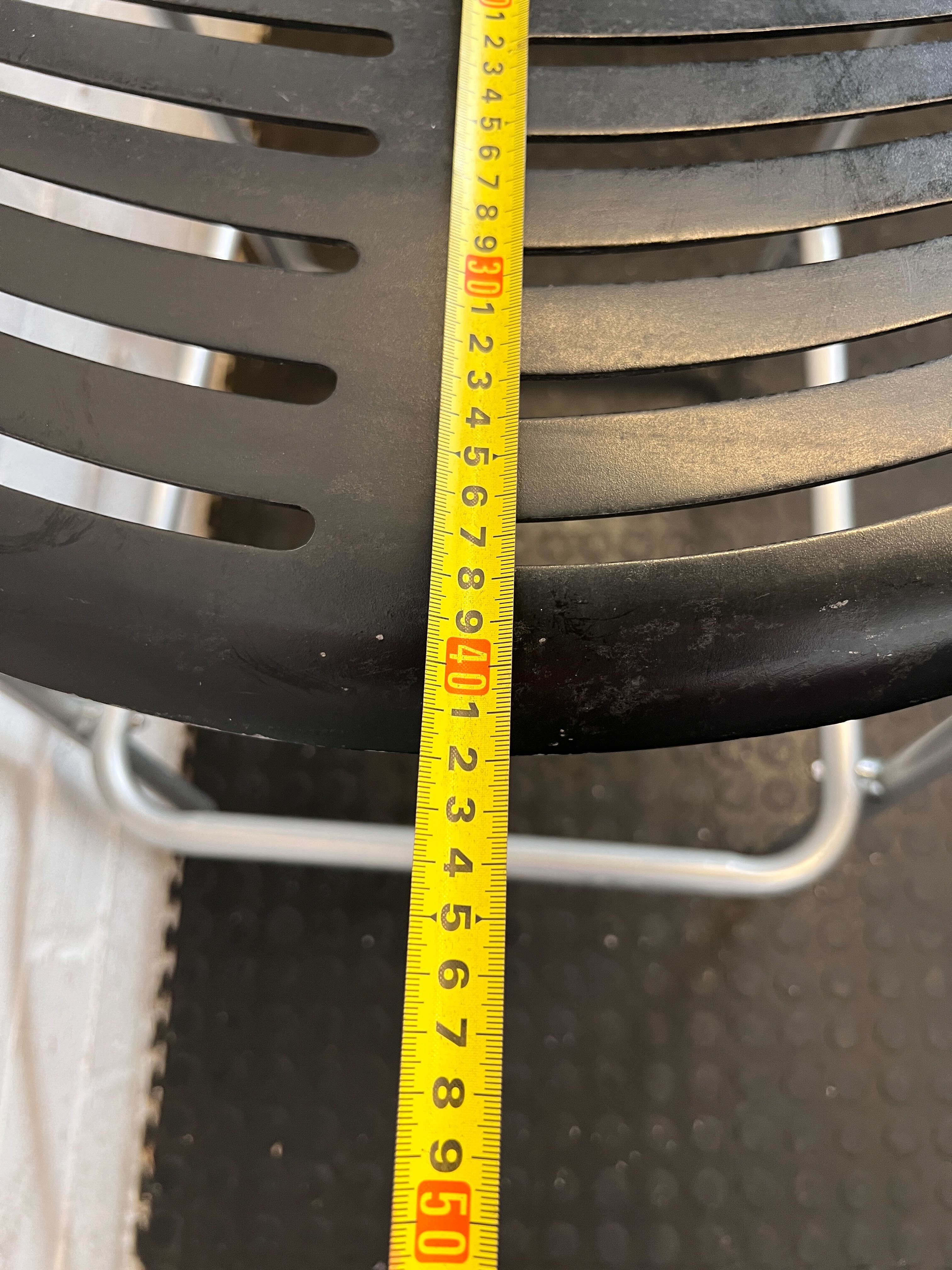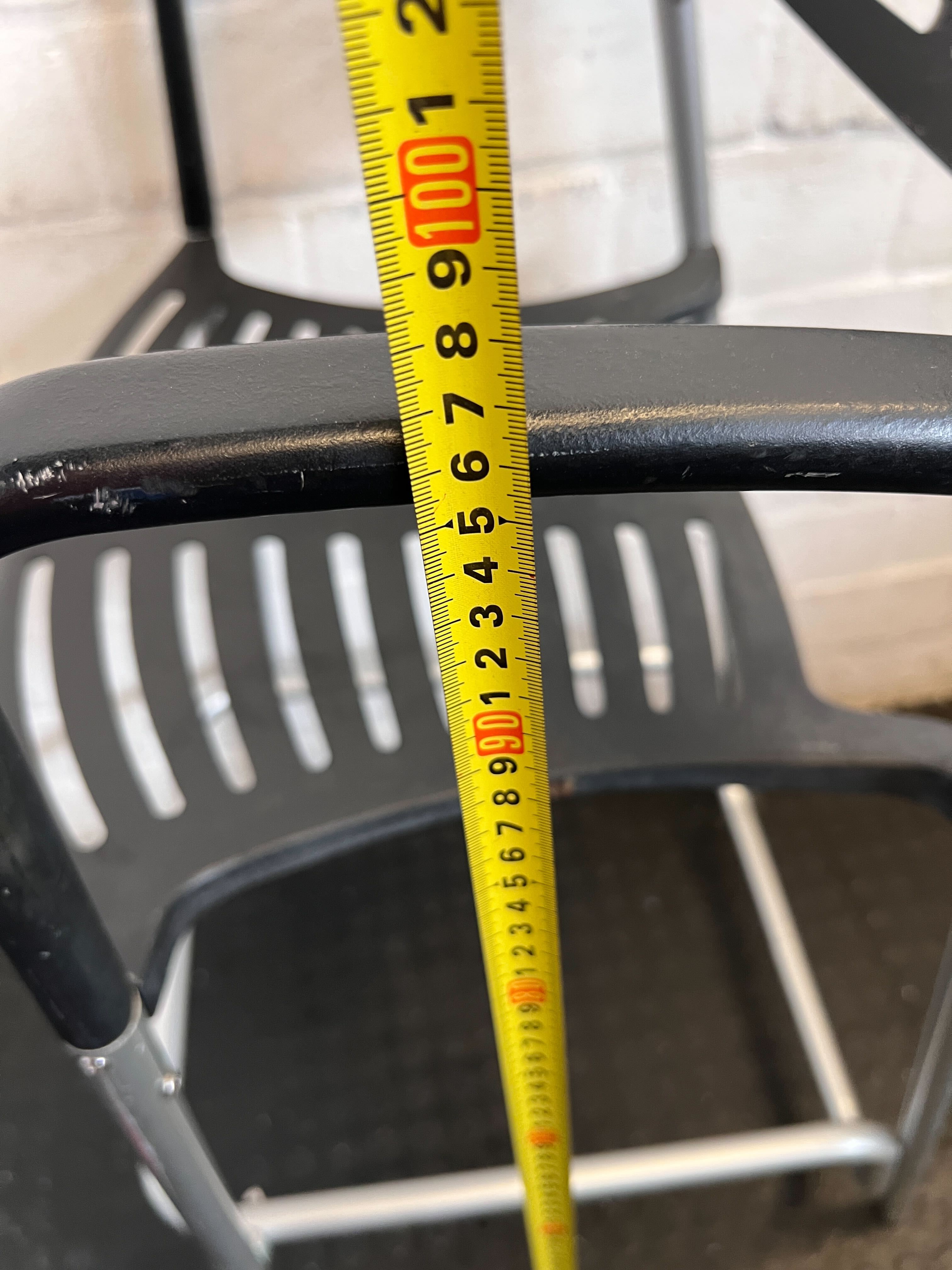 Elevate your space with this sleek and modern bar stool, perfect for adding a contemporary touch to any kitchen island, home bar, or commercial setting! ✨ Featuring a comfortable black slatted plastic seat and backrest, complemented by sturdy silver-toned metal armrests and frame, this high chair blends style with practical design. Its robust construction makes it ideal for everyday use, providing both comfort and a chic aesthetic. Condition: This pre-loved bar stool is in good used condition. The silver metal frame shows some minor scuffs and surface marks consistent with regular use, and the black plastic seat and backrest may have light superficial scratches. Structurally sound and ready to be a stylish addition to your space! #2ndhandwarehouse #barstool #highchair #modernfurniture #commercialseating 🧡