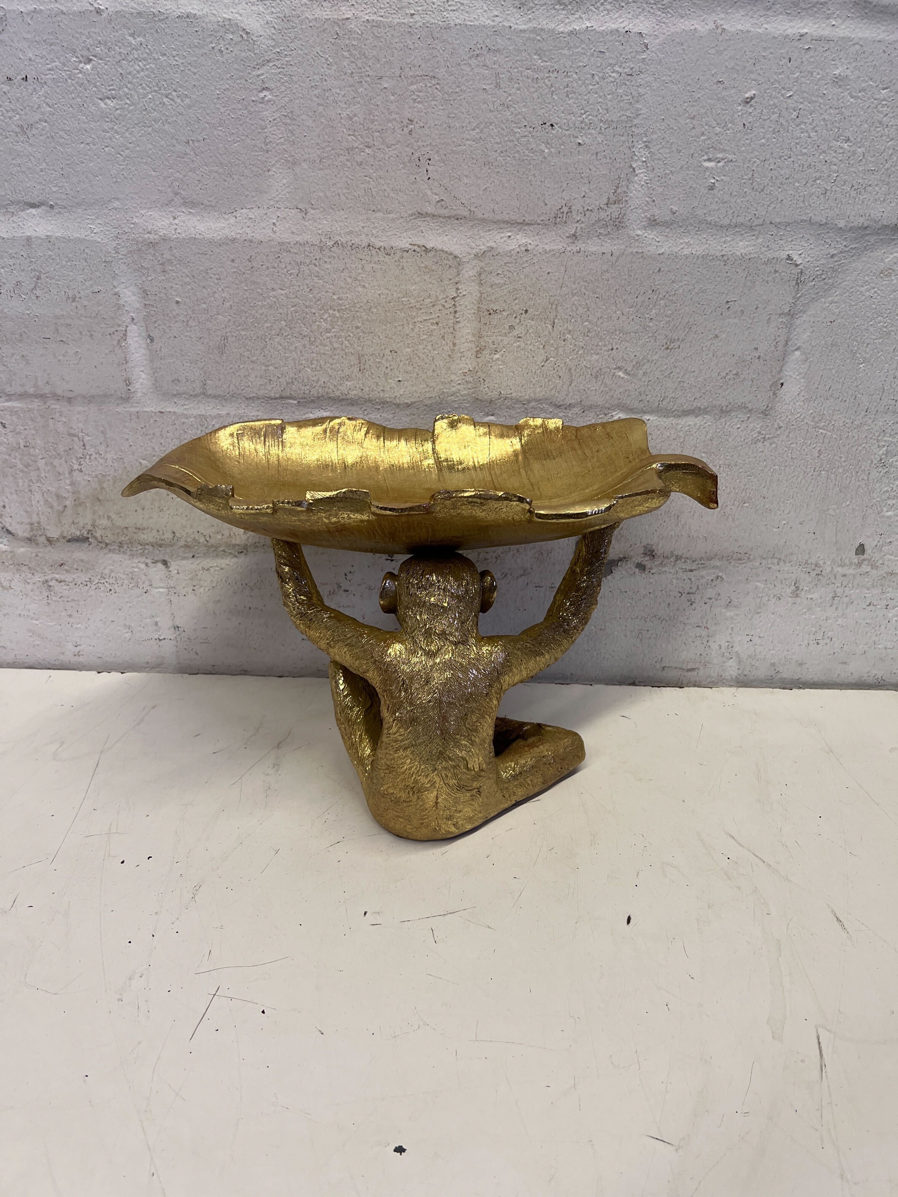 Add a touch of playful luxury to your home with this stunning golden monkey trinket dish! ✨ This eye-catching piece features a charming monkey figure holding aloft a beautifully textured, leaf-shaped bowl, all finished in an elegant antique gold. Perfect for holding keys in your entryway, displaying small candies on a coffee table, or simply as a striking decorative ornament in your living room or office. Its unique design is sure to spark conversation and bring a sophisticated, whimsical flair to any space. 🐒 This delightful item is in excellent pre-loved condition, showcasing a charming vintage-inspired gold finish that adds to its character. There are no visible chips, cracks, or significant damage. The finish itself has a naturally aged appearance, which is part of its unique appeal. Please refer to the images for a detailed view of its beautiful state. 💎