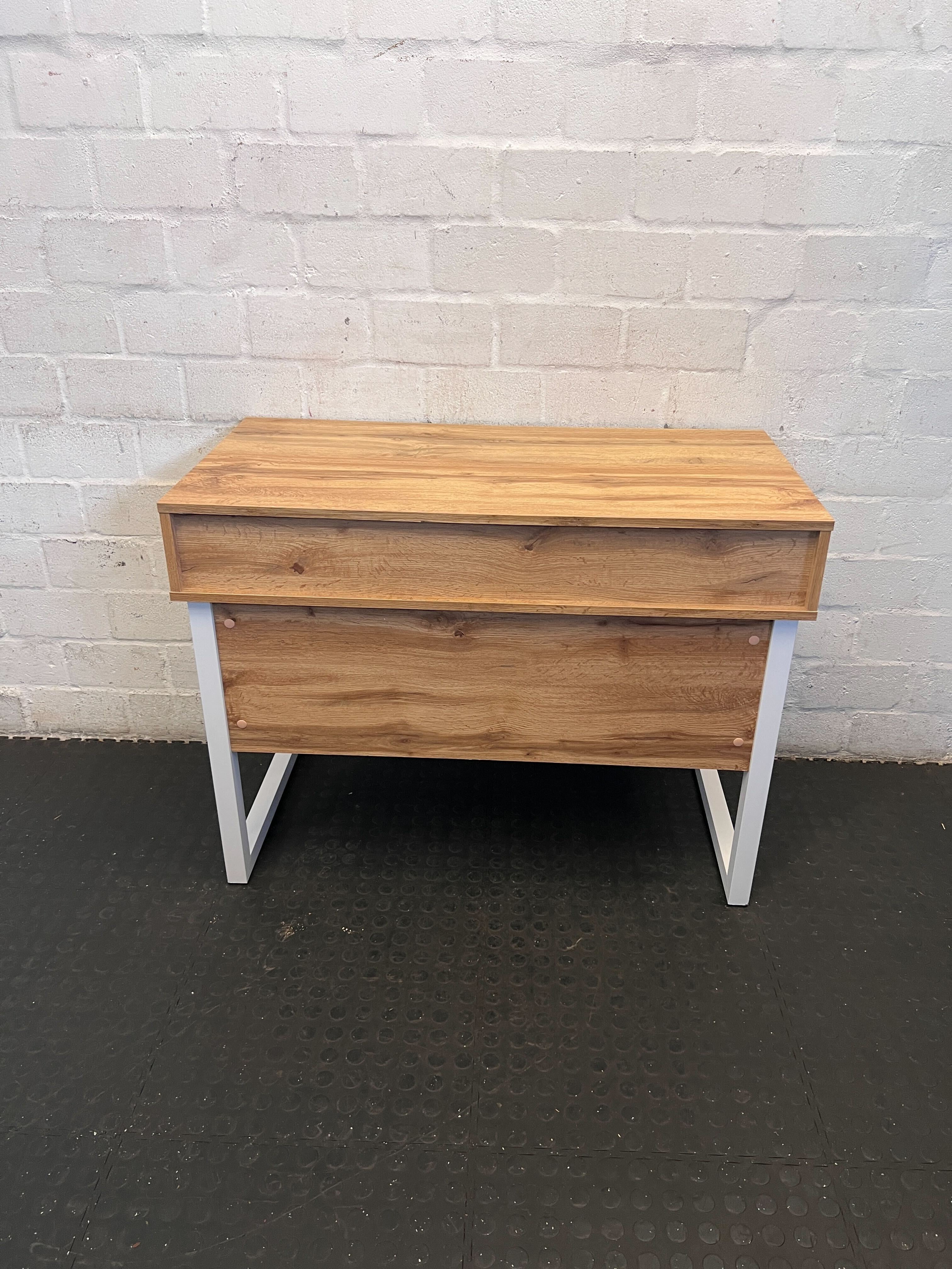 This stylish and compact desk is perfect for creating a productive workspace in any room! ✨ Featuring a beautiful light wood finish, a clean white central drawer for essentials, and two open cubbies for books or decor, it combines functionality with modern aesthetics. Its minimalist design and sturdy white metal legs make it a versatile addition to your home office, study nook, or even a bedroom, providing a perfect spot for your laptop, books, and creative projects. This desk is in good second-hand condition. There might be minor signs of wear consistent with previous use, such as small surface scuffs or marks on the wooden top or legs, but nothing that significantly detracts from its overall appeal. Please refer to the images for a detailed view of its current state.