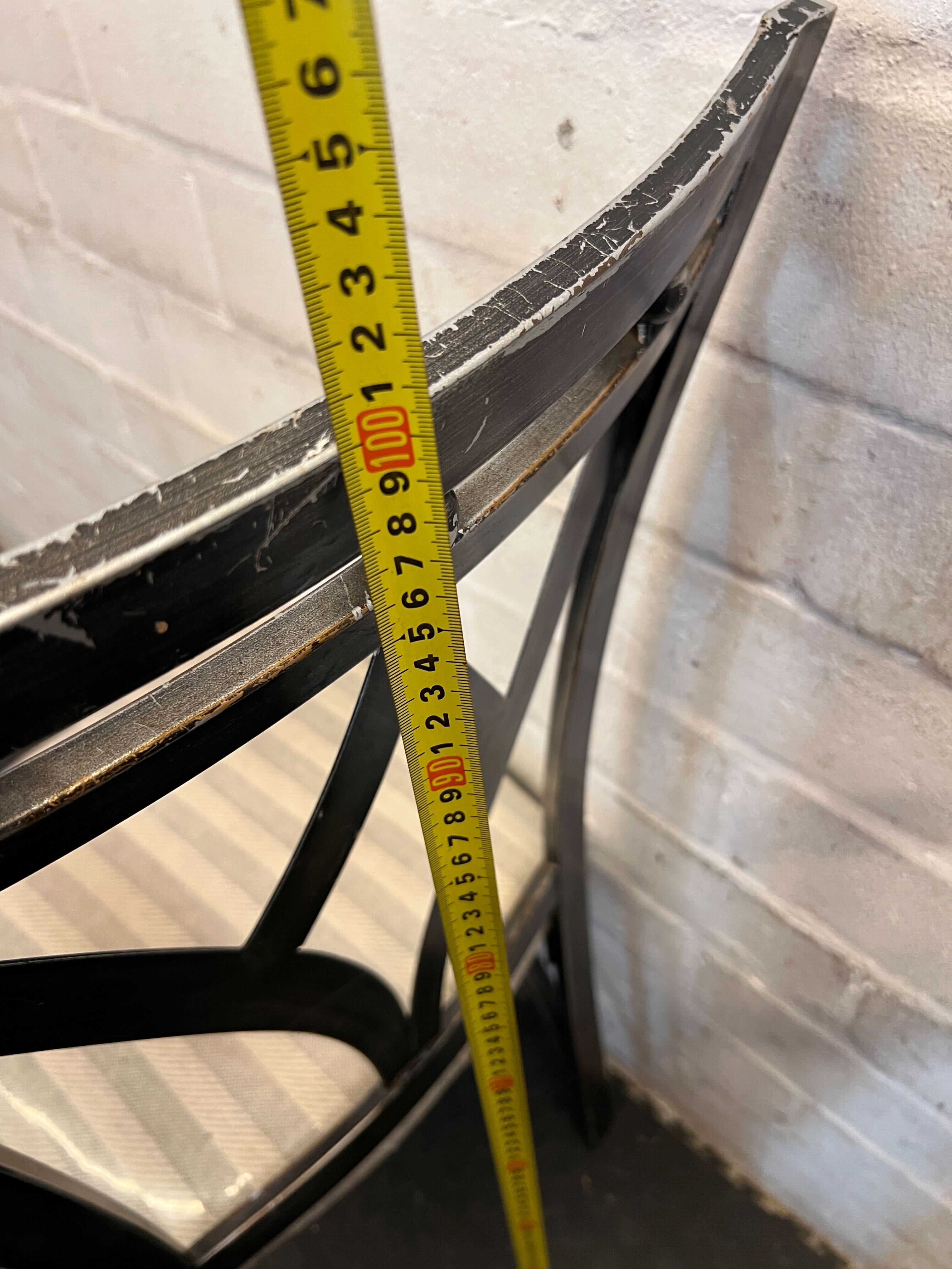 ’s a versatile piece that complements various decor styles. 🛋️ This chair is in good pre-owned condition. The metallic grey frame exhibits minor wear consistent with its age and use, which adds to its distressed character. The upholstered seat is intact with a subtle striped pattern and shows minimal signs of wear; it appears to have been protected by a clear plastic cover, which has some creasing. All structural components are solid. Please refer to the images for a detailed view of its current state. 💎